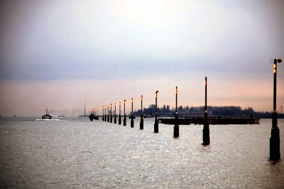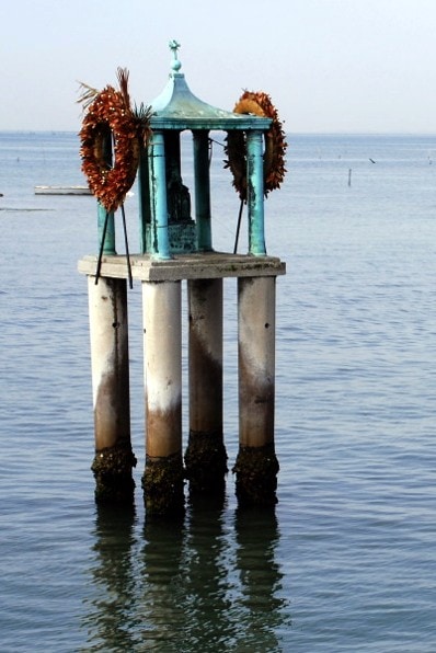 Il reste là, planté à jamais, tandis que nous suivons la jetée, celle qui protège la lagune de la mer, celle qui empêche des épousailles trop violentes entre l’Adriatique et les habitants d’ici.