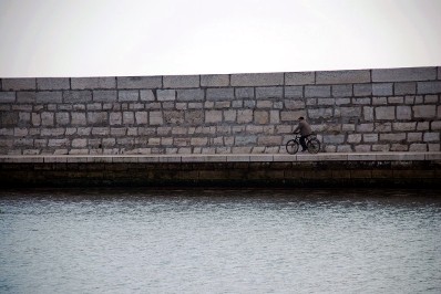 Sur la digue, un cycliste pédale lentement le long du mur de pierres, isolé dans le cliquetis grinçant de la chaîne de son vélo.