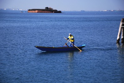 On croise un remorqueur, silhouette noire et blanche sur cette lagune qui ne se décide pas entre le vert, le gris et le bleu.
