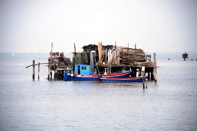 De temps à autre surgissent des cabanes sur pilotis, petites îles de bois fragiles où sèchent les filets et les piquets.
