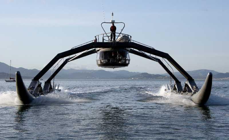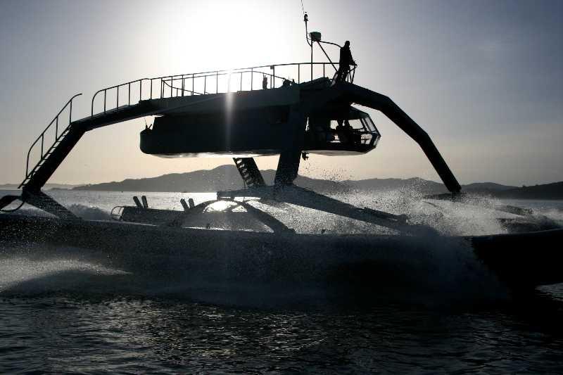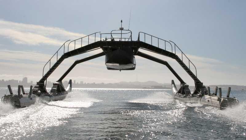 Chacune des coques est équipée d’un moteur et d’une hélice, mais on peut aussi y associer un système de propulsion similaire à un jet-ski.