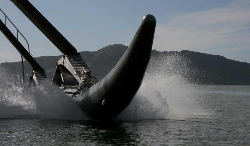 Draft : 8” forward and 16” aft at half load. Her limited draft and inflatable hulls contribute to her maneuverability. Proteus can be beached without damage, delivering cargo or personnel.