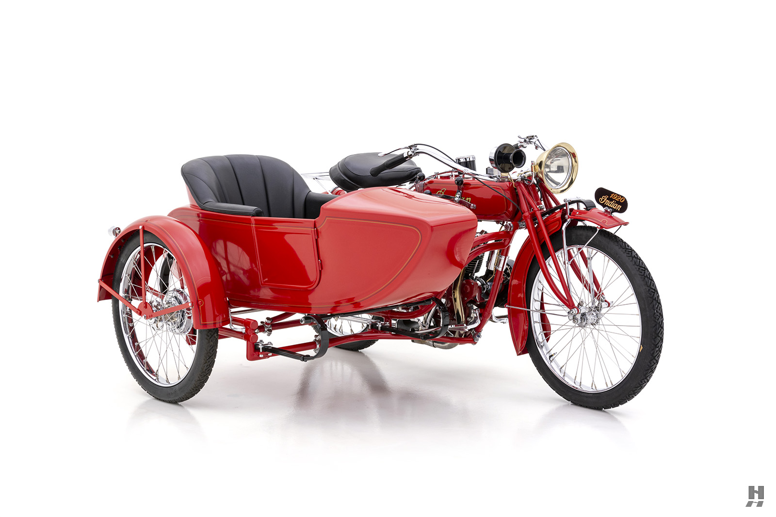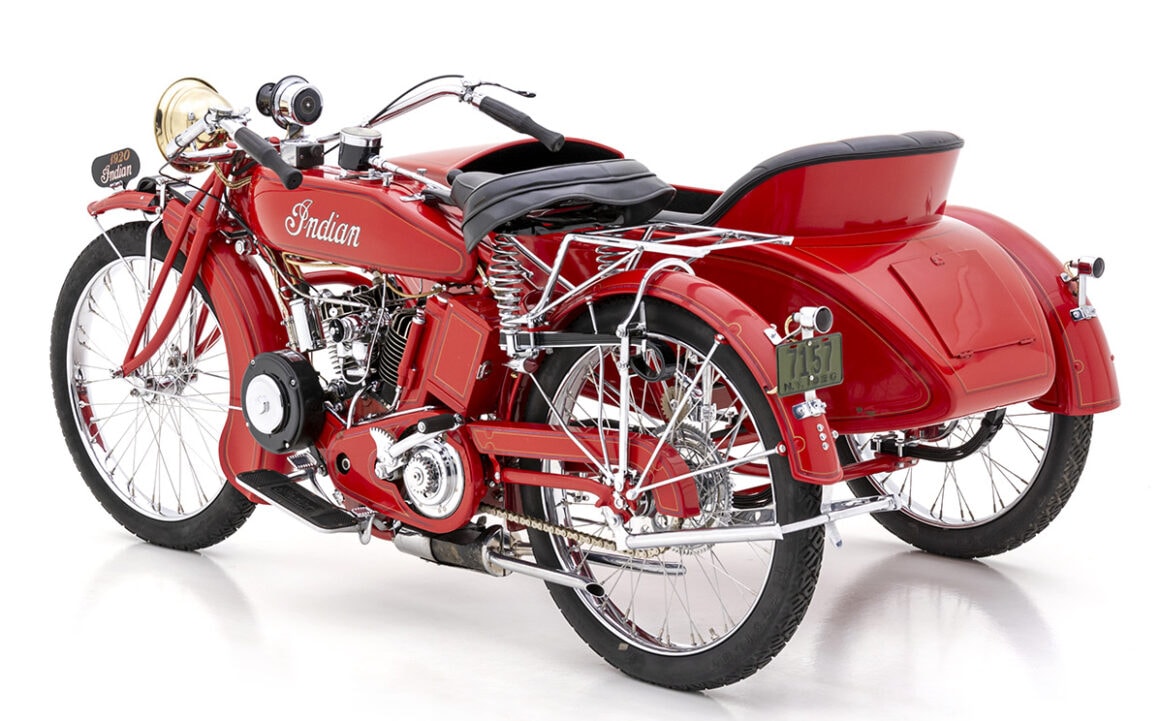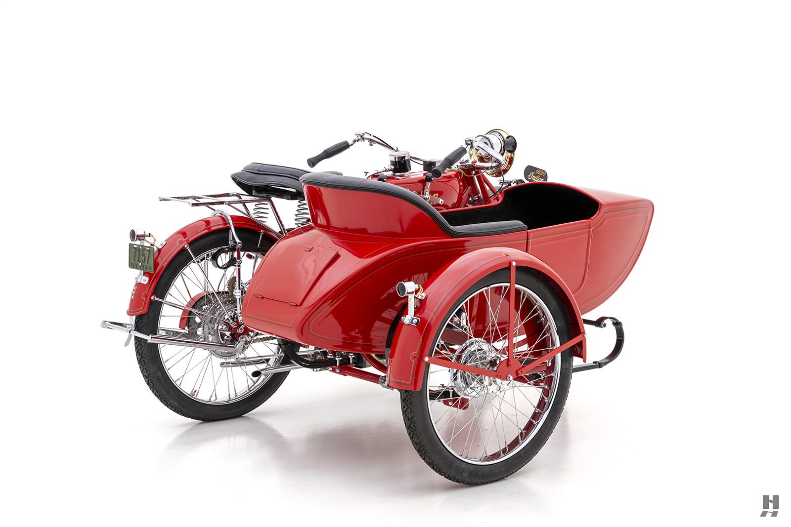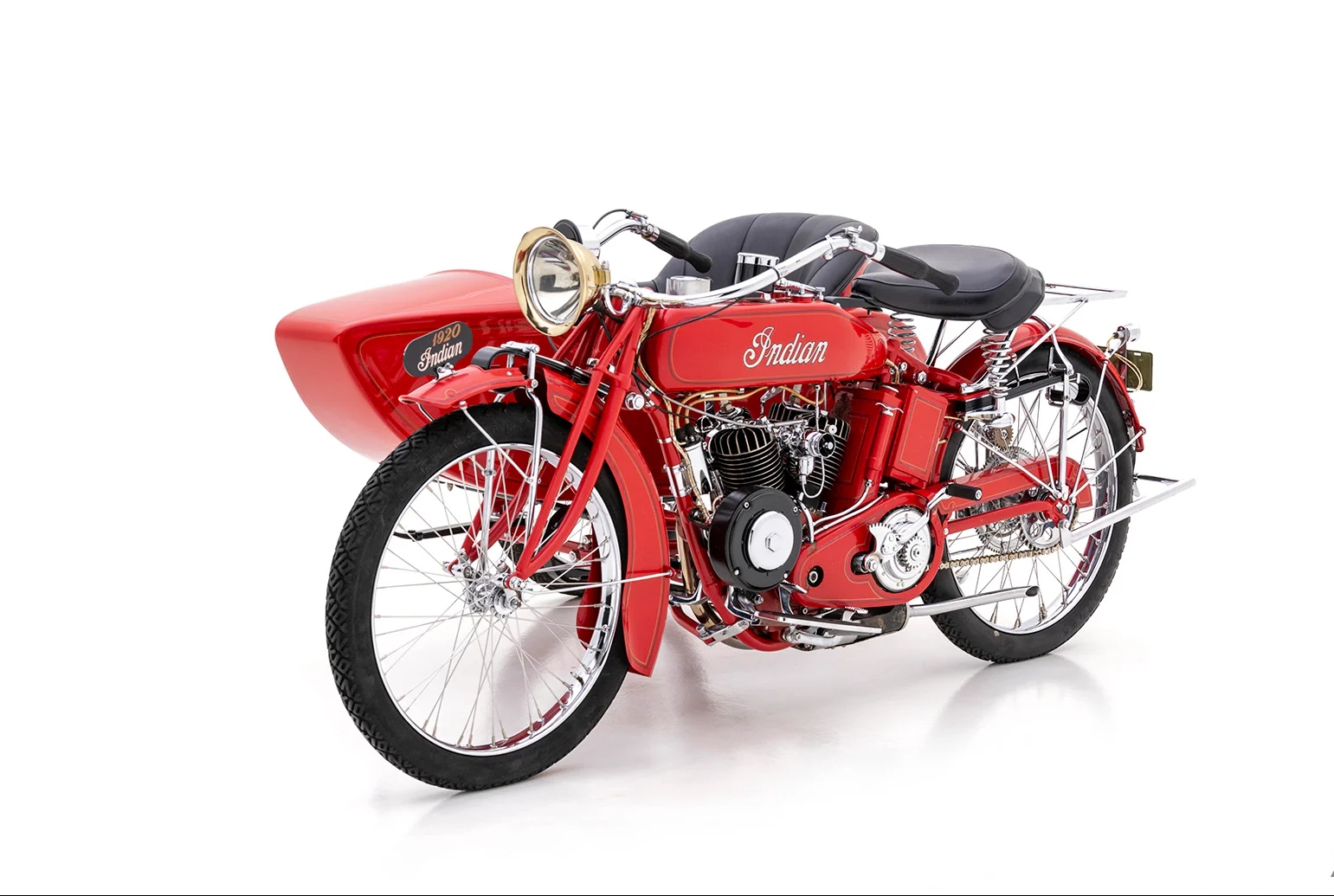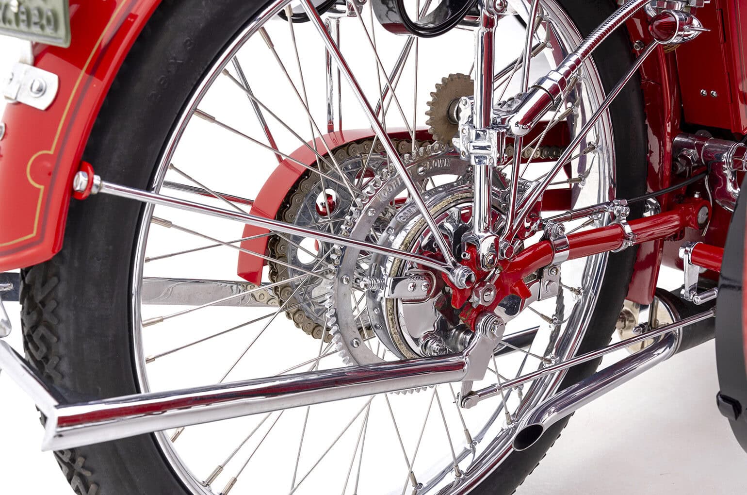 Une restauration méticuleuse de neuf ans, réalisée de main de maître par le célèbre restaurateur de motos Wilson B. Plank, a redonné à cette moto et à son side-car, leur éclat d’origine, si ce n’est n’est qu’un produit corrosif a accidentellement abimé la peinture en un endroit. Cette peinture est un riche rouge oriental doté de stripping “à la feuille d’or”. La moto a survécu a cet accident de surface et se présente toujours magnifiquement.
