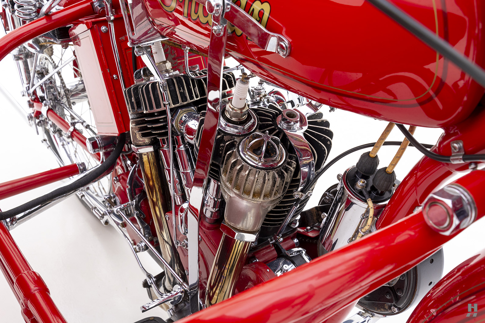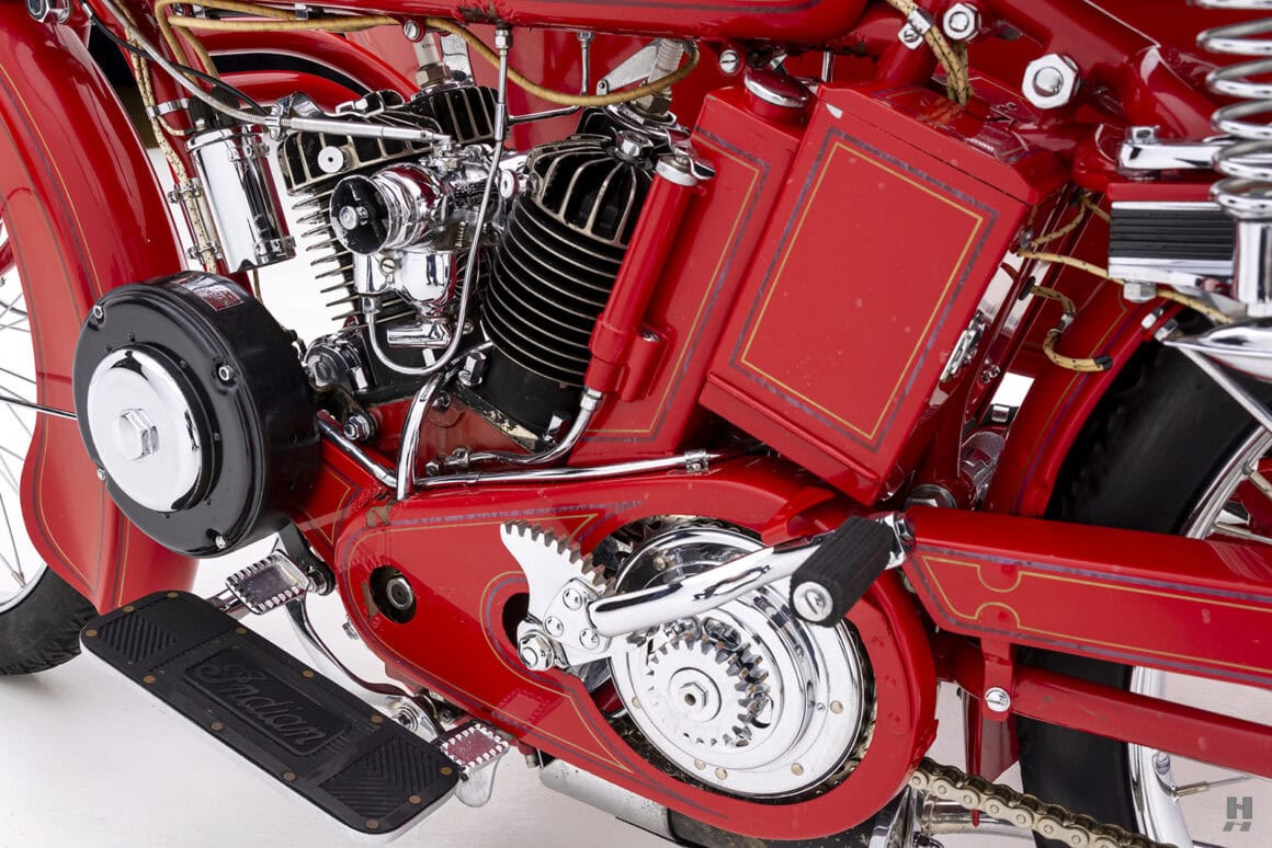 C’était principalement sa technologie révolutionnaire de soupapes latérales, un changement majeur par rapport aux précédents moteurs à tête dites “F” également conçus par la même équipe associée au coeur d’Indian. Gustafson, qui avait conçu la première moto à soupapes latérales construite aux États-Unis pour Reading-Standard en 1907, a appliqué son expertise pour créer un moteur avec des soupapes de fonctionnement plus “froides”…