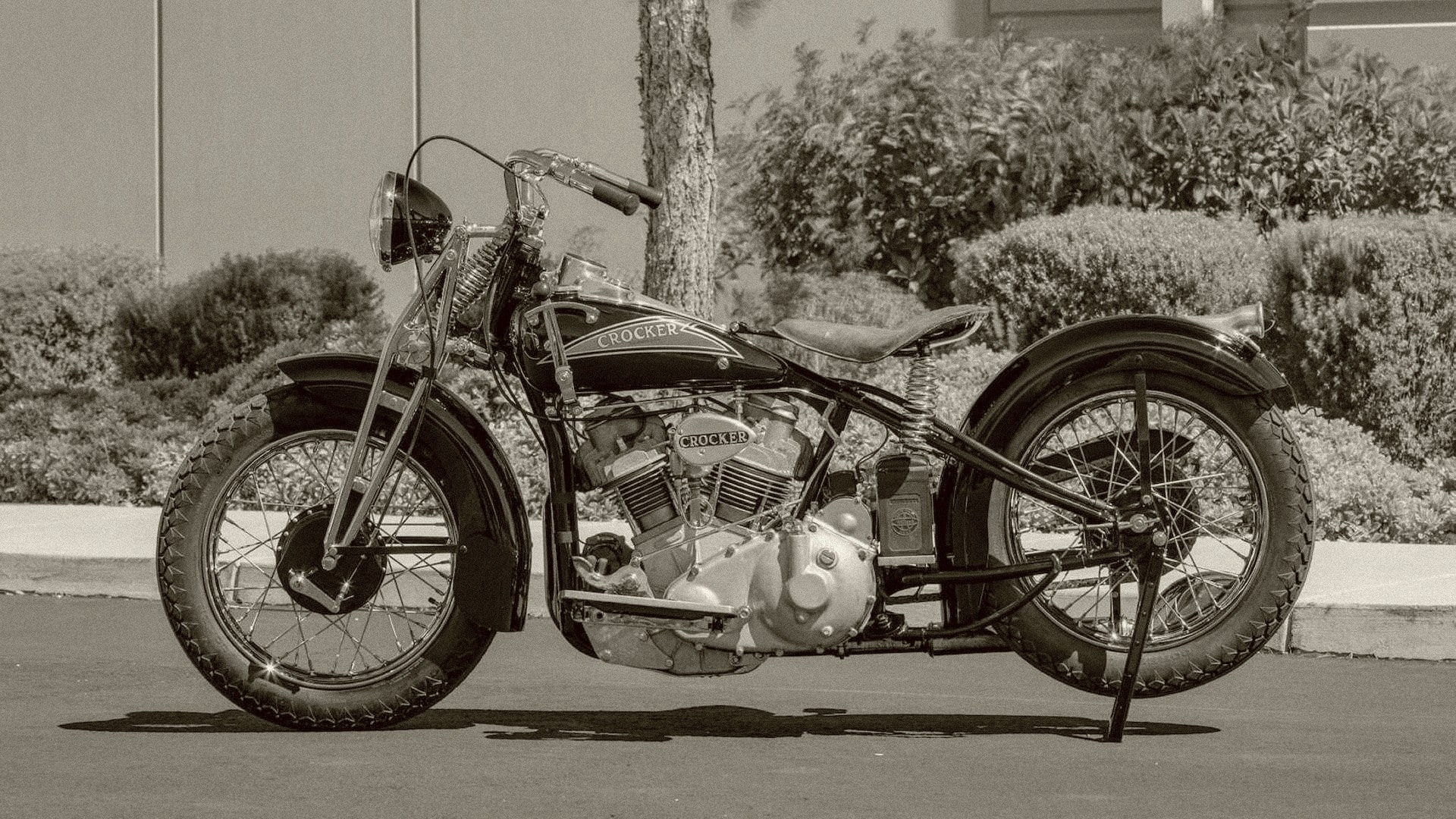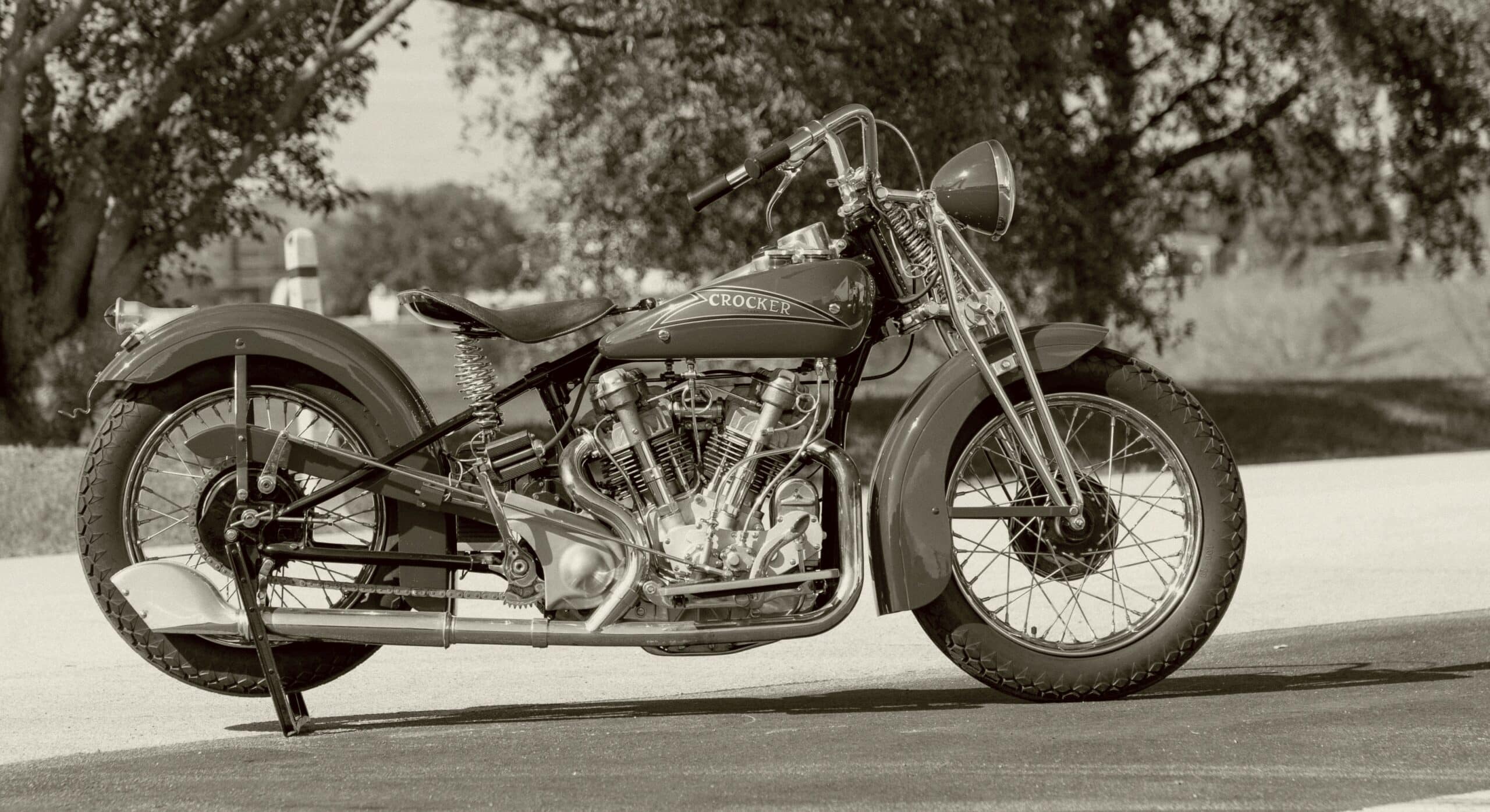 S’appuyant sur leur succès en course, Crocker et M. Bigsby ont entrepris de construire rien de moins que la moto de production la plus rapide en Amérique, en utilisant un moteur V-Twin à 45 ° conçu avec des têtes de soupapes hémisphériques en tête et un alésage et une course presque carrés de 3,25′ x 3,62′. Les réservoirs de carburant et d’huile ont été réalisés en aluminium. Le moteur était un élément clé du châssis, avec un boîtier de transmission en acier intégré au cadre, augmentant la rigidité en torsion.