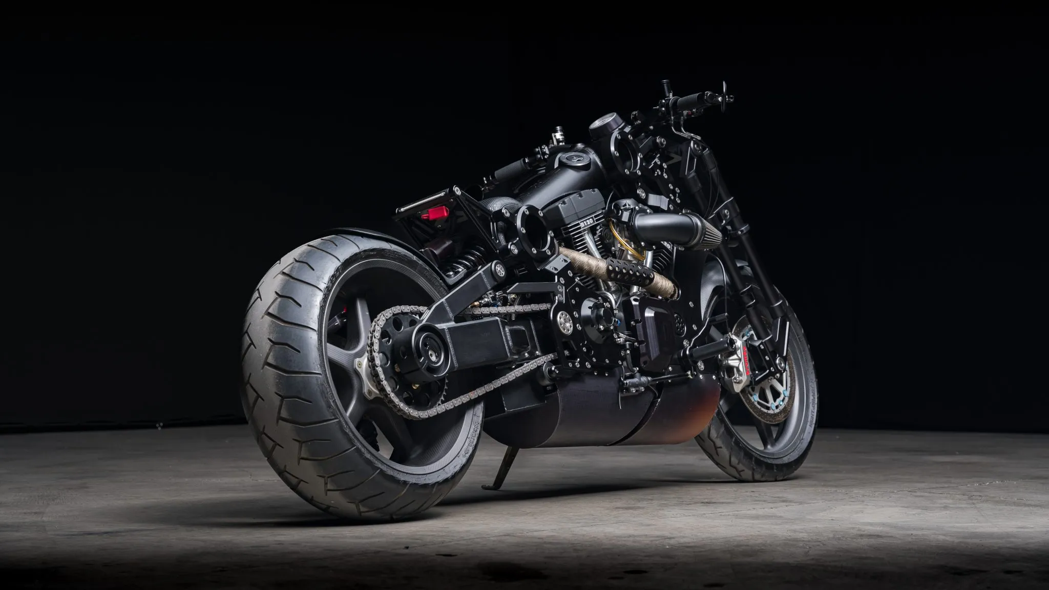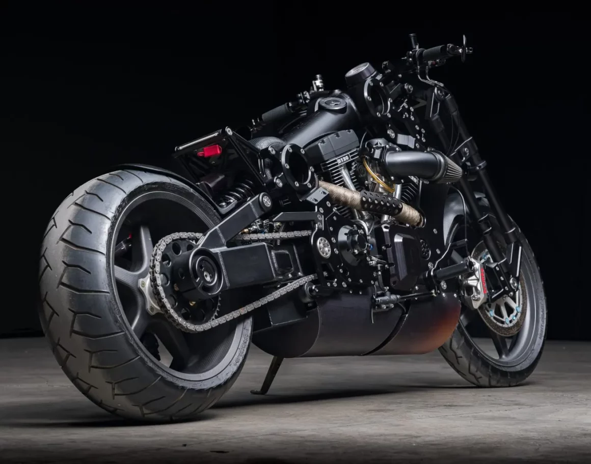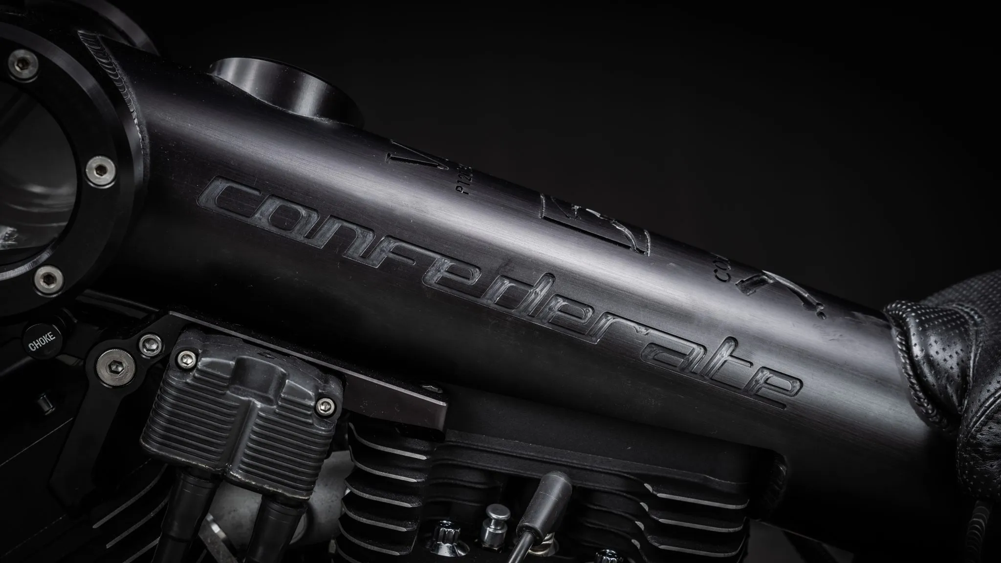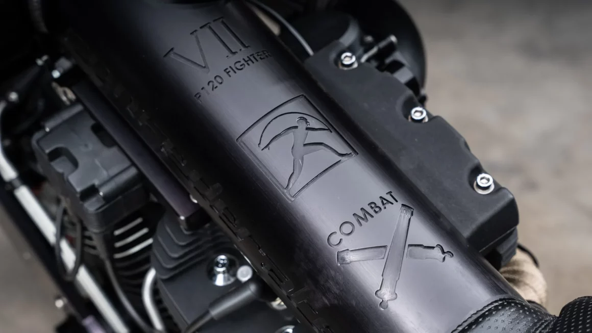 Il supporte également la partie arrière d’un siège solo en deux parties recouvert de vinyle noir perforé. Des gravures sur la colonne vertébrale en aluminium de 127 mm indiquent que ce “Fighter Combat” est le numéro sept d’une série de production limitée. Les jantes en fibre de carbone apparente BST mesurent 19×3 à l’avant et 18×8 à l’arrière, montées avec des pneus Pirelli 120/70 Night Dragon et 240/40 Diablo, respectivement AV et AR.