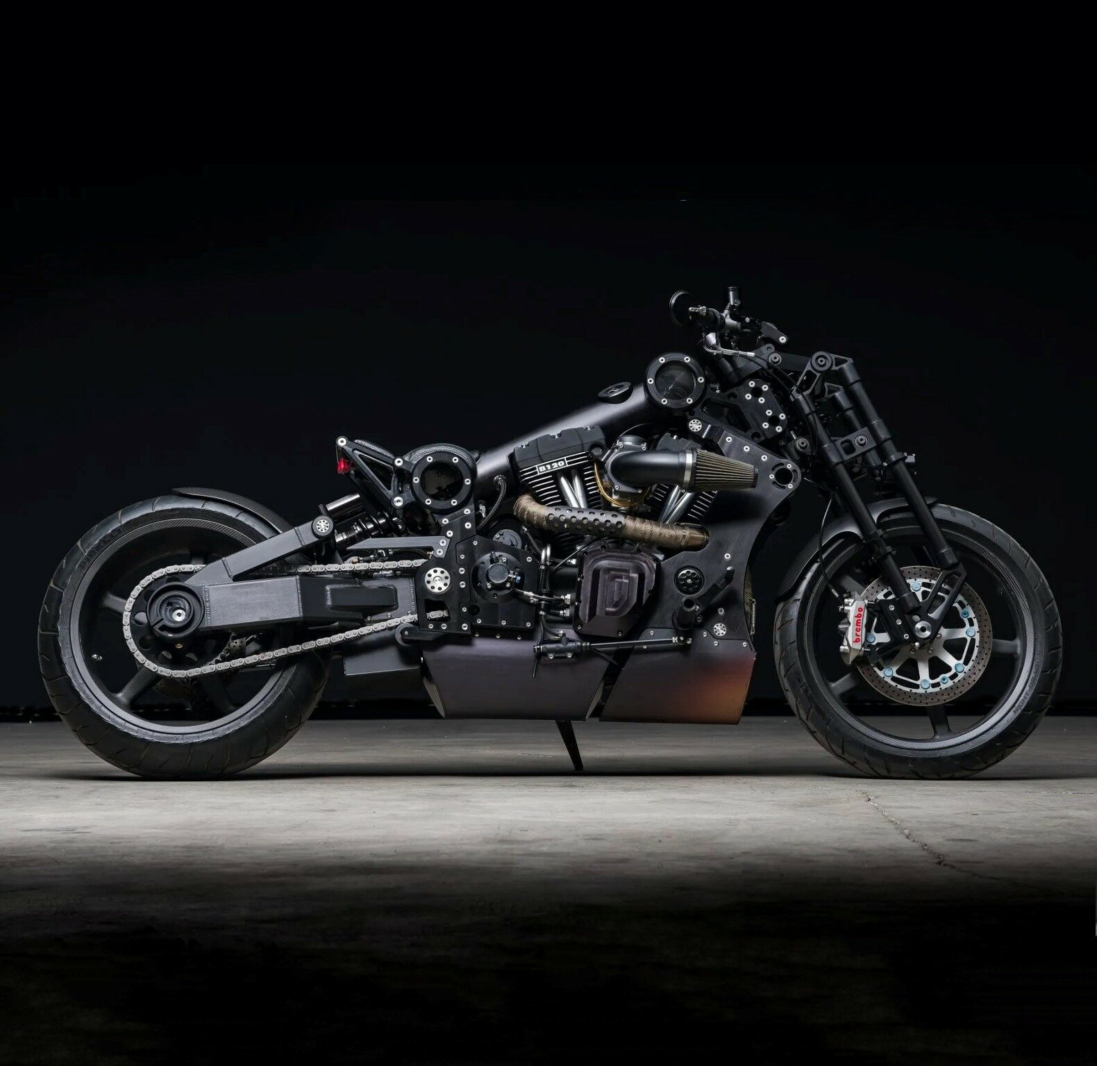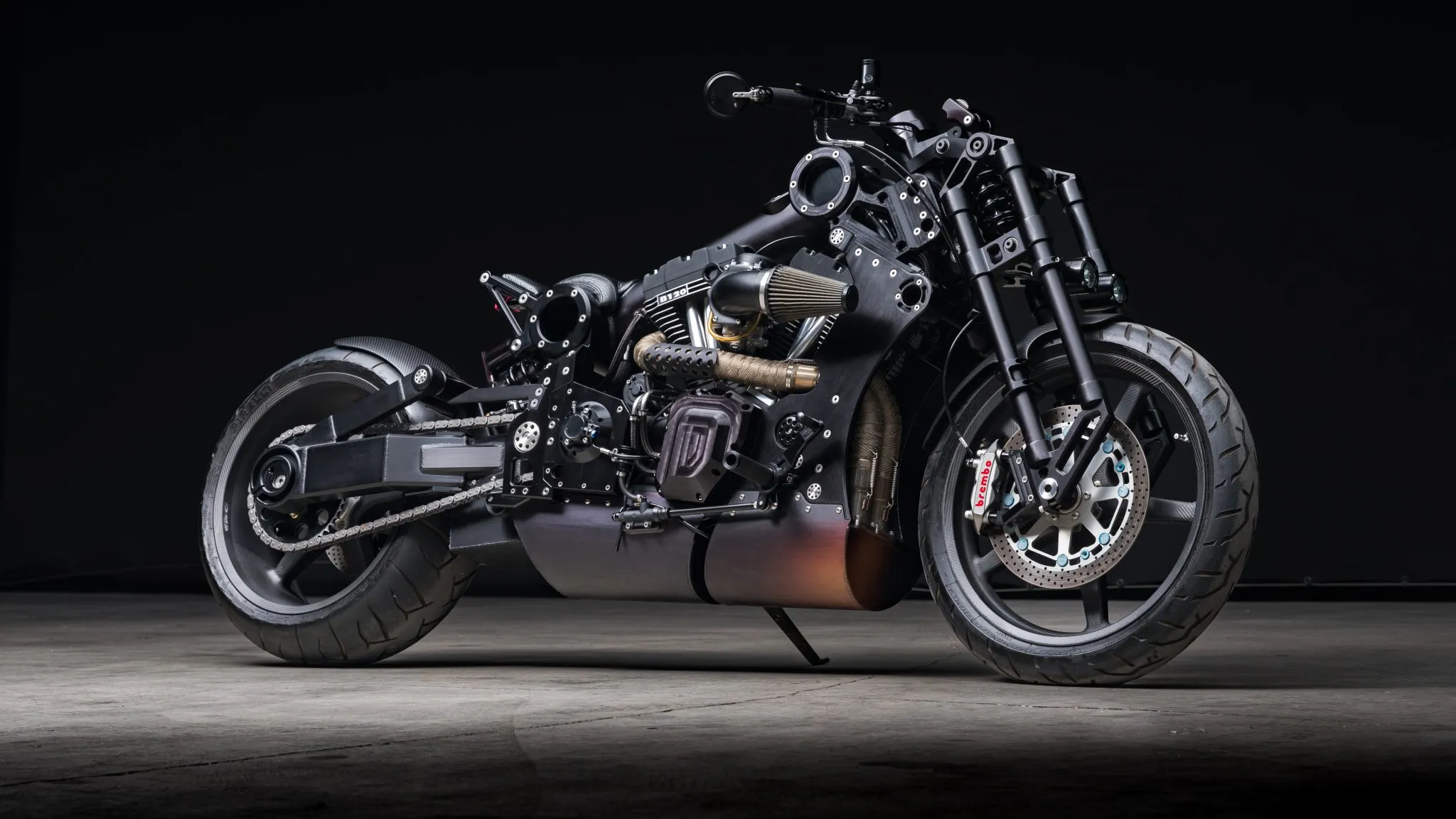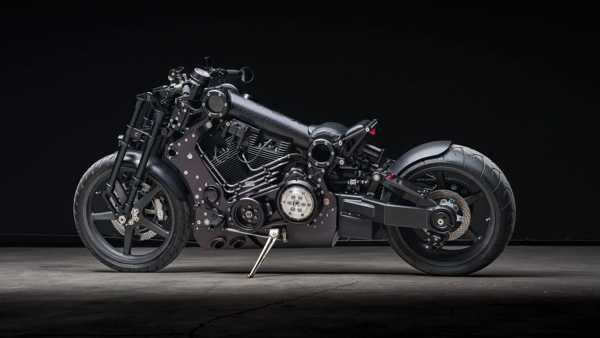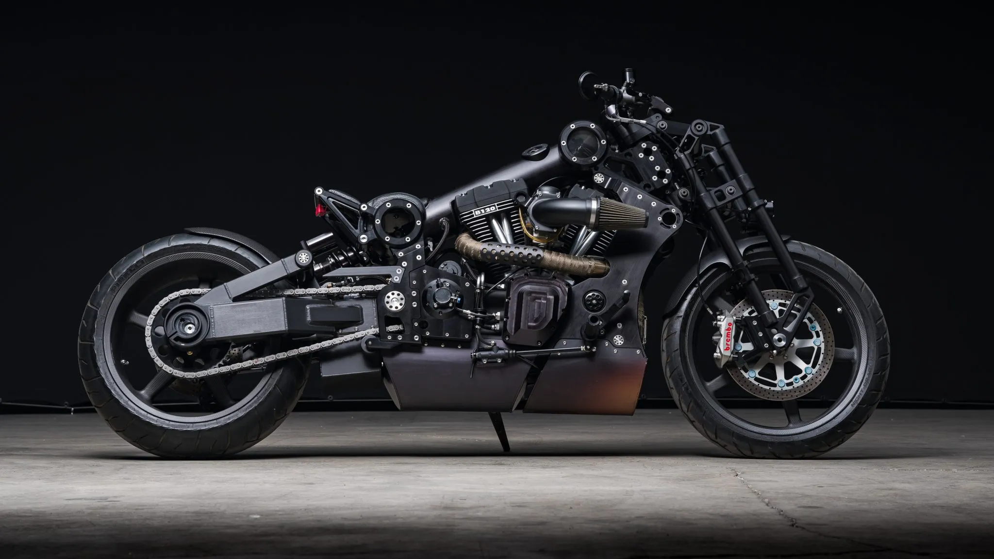 Il supporte également la partie arrière d’un siège solo en deux parties recouvert de vinyle noir perforé. Des gravures sur la colonne vertébrale en aluminium de 127 mm indiquent que ce “Fighter Combat” est le numéro sept d’une série de production limitée. Les jantes en fibre de carbone apparente BST mesurent 19×3 à l’avant et 18×8 à l’arrière, montées avec des pneus Pirelli 120/70 Night Dragon et 240/40 Diablo, respectivement AV et AR.