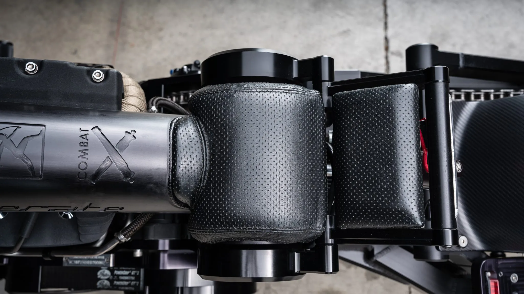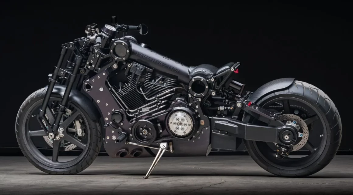 Elle intègre un réservoir de carburant de quatre gallons, dont la partie supérieure contient de l’huile moteur et la partie inférieure renferme le support supérieur pour le mono-amortisseur arrière. Les caractéristiques supplémentaires comprennent des ailes en fibre de carbone apparentes, deux phares à LED, un support de plaque d’immatriculation monté sur le bras oscillant et une béquille latérale. Le sous-châssis arrière intègre le feu arrière à LED.
