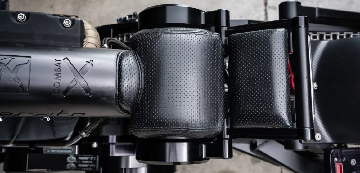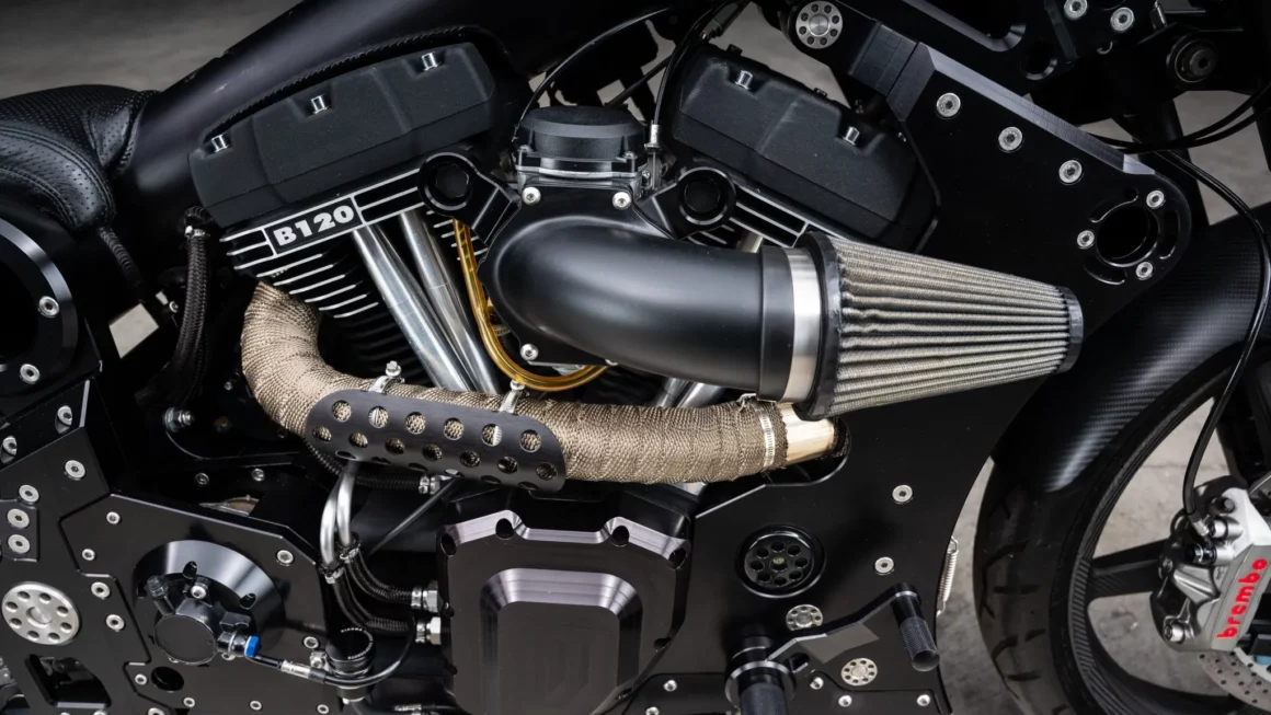 Le bicylindre en V JIMS 120ci refroidi par air a été évalué en usine à 160 chevaux et 135 lb-pi de couple et comporte des boîtiers moulés en aluminium 8356 ainsi que des arbres d’équilibrage à double engrenage et quatre soupapes par cylindre. Il est fixé par une paire de plaques en aluminium usiné boulonnées à la colonne vertébrale centrale et respire à travers un carburateur Keihin CV de 51 mm avec un filtre à air à cône ouvert orienté vers l’avant.