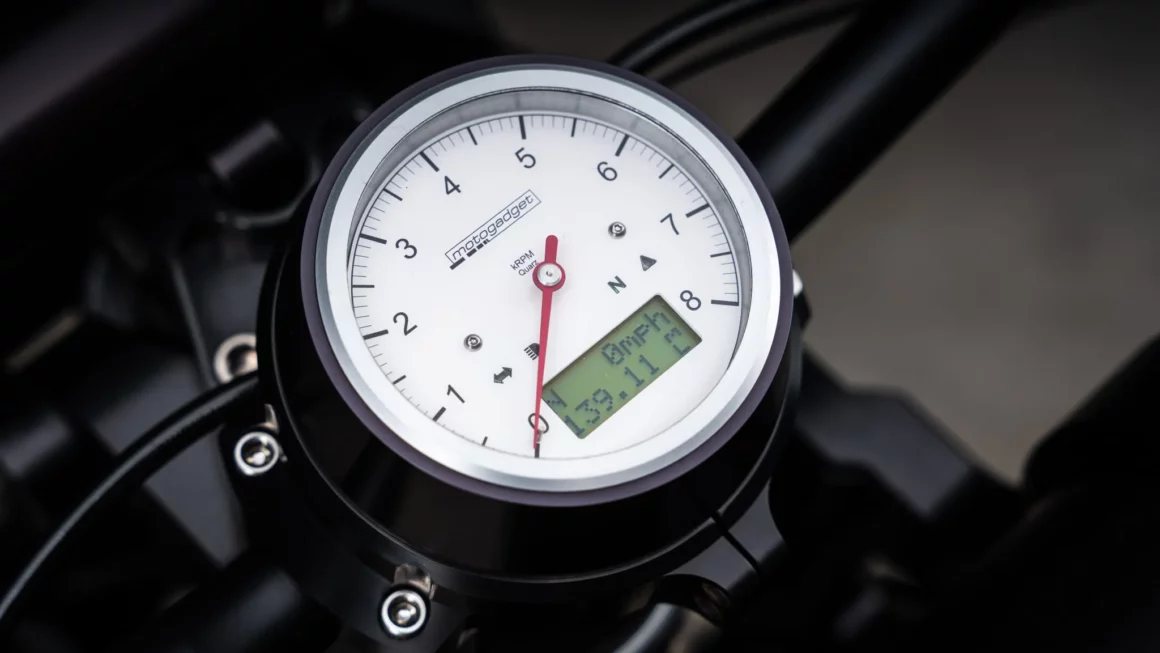 Un appareillage de commande Motogadget, de leviers de frein et d’embrayage Brembo 19 RCS et d’ensembles de maître-cylindre en billettes Rizoma Racing Components s’y trouvent également fixés par une sorte de pince ronde en billette dont la partie supérieure sert de support pour le tachymètre Motogadget de 8k-rpm avec un compteur de vitesse/odomètre numérique encastré qui indique 140 miles. Cette moto est aussi neuve qu’en sortant d’usine en 2O11.