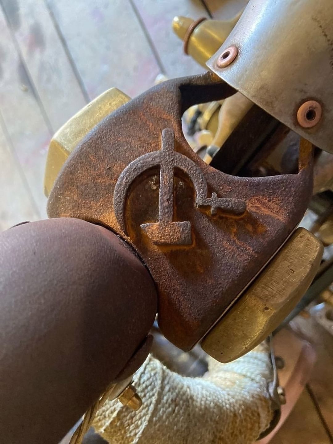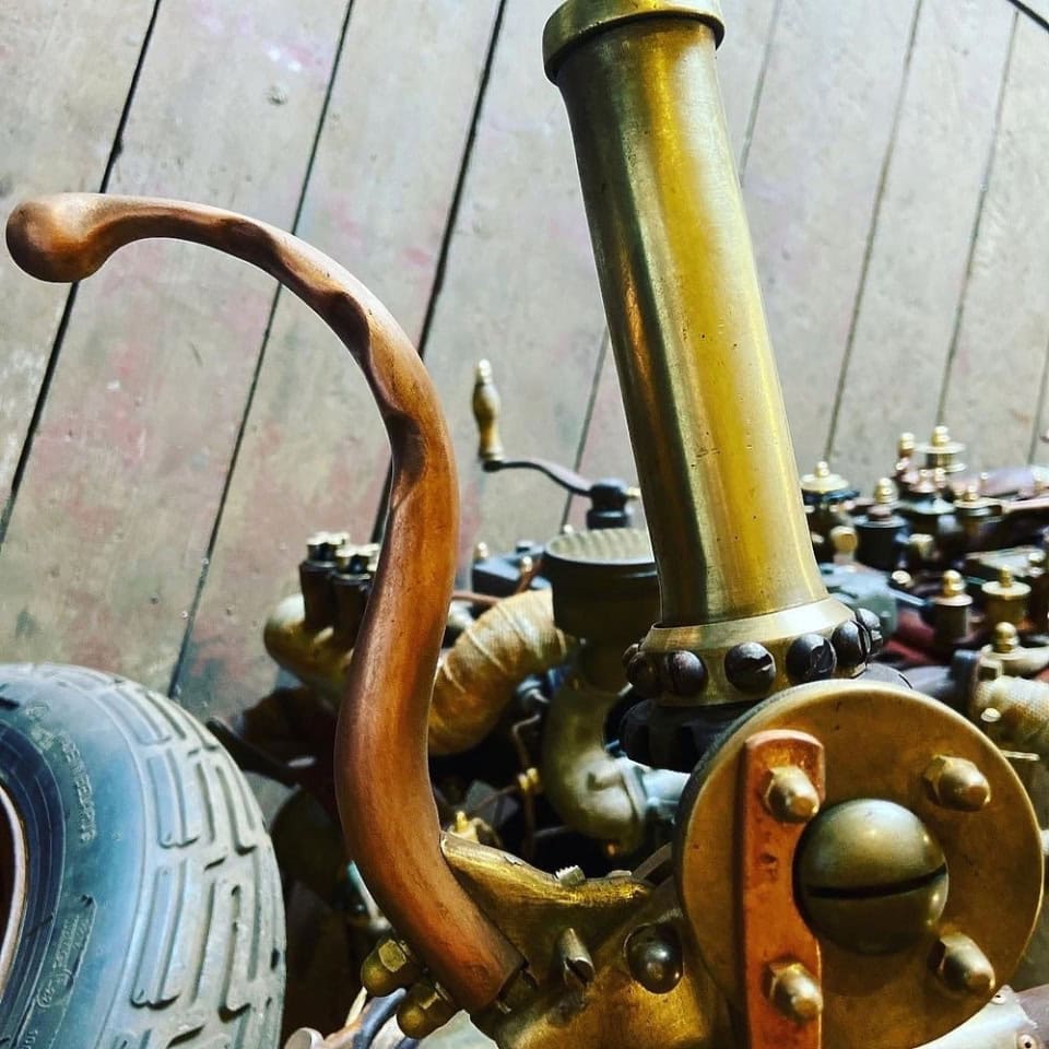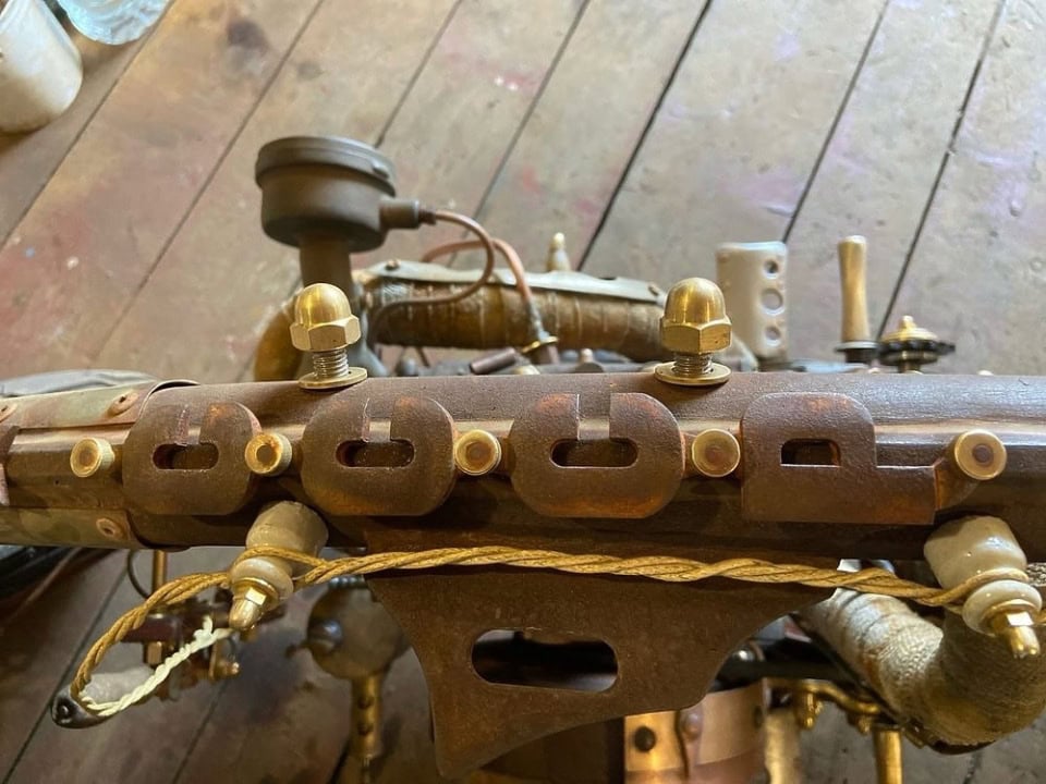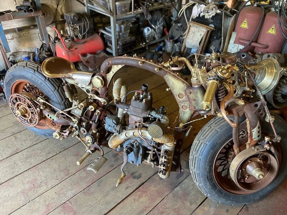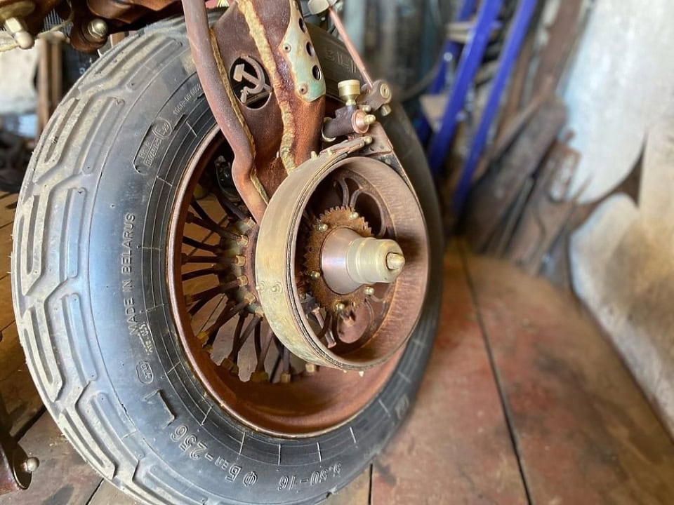 Au lieu d’un phare, une lanterne de navire… Le feu stop est un réveil… Pour démarrer le moteur, il faut tirer la poignée d’un véritable hachoir à viande… La vitesse maximale est de 120km/h, mais cela n’a pas d’importance en raison de sa conception unique. Tous les détails imaginés par le créateur de ce “cheval de fer” ont été achetés ou récupérés, puis vieillis artificiellement. Le cœur de cette moto Steampunk ainsi devenu un étrange monocylindre Russe des années 50 du siècle dernier (traduisez 1950)… En Union soviétique, de tels moteurs étaient installés pour entraîner des générateurs électriques…