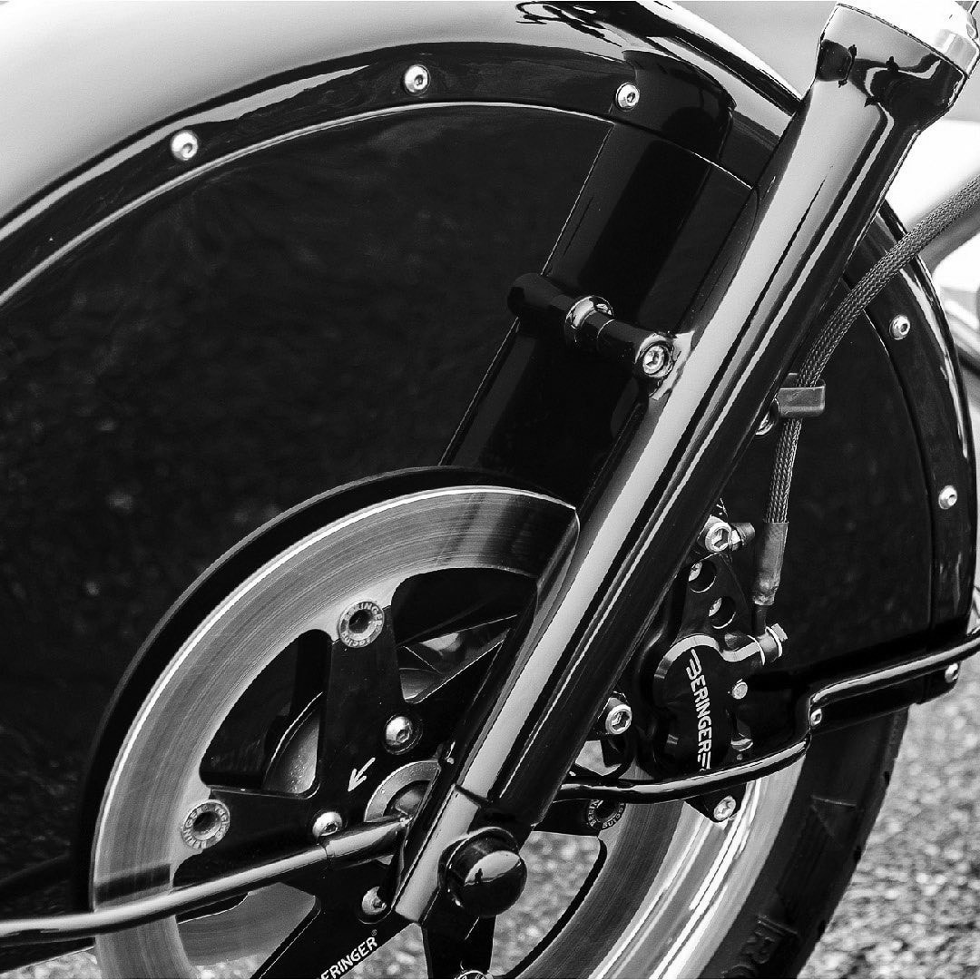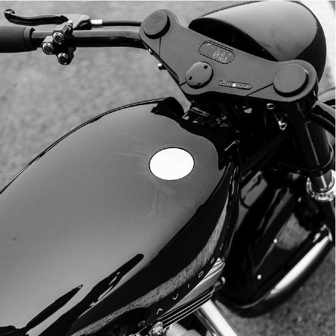 Beringer est le nom du jeu en ce qui concerne les freins, ayant fourni des disques flottants, des étriers de qualité supérieure et des maîtres-cylindres complets. Une selle en cuir noir a été rembourrée par Olivier Habault, puis placée au-dessus d’un assise sur mesure dont le dessous porte de discrètes œillères LED. En revenant au cockpit de la moto, vous trouverez un cadran Motogadget numérique soigneusement encastré dans la pince supérieure. Le guidon est orné d’interrupteurs compacts, de poignées simples et de rétroviseurs en extrémités. Issus de l’inventaire de Highsider, ces derniers disposent de clignotants LED petits mais lumineux intégrés dans leurs potences.