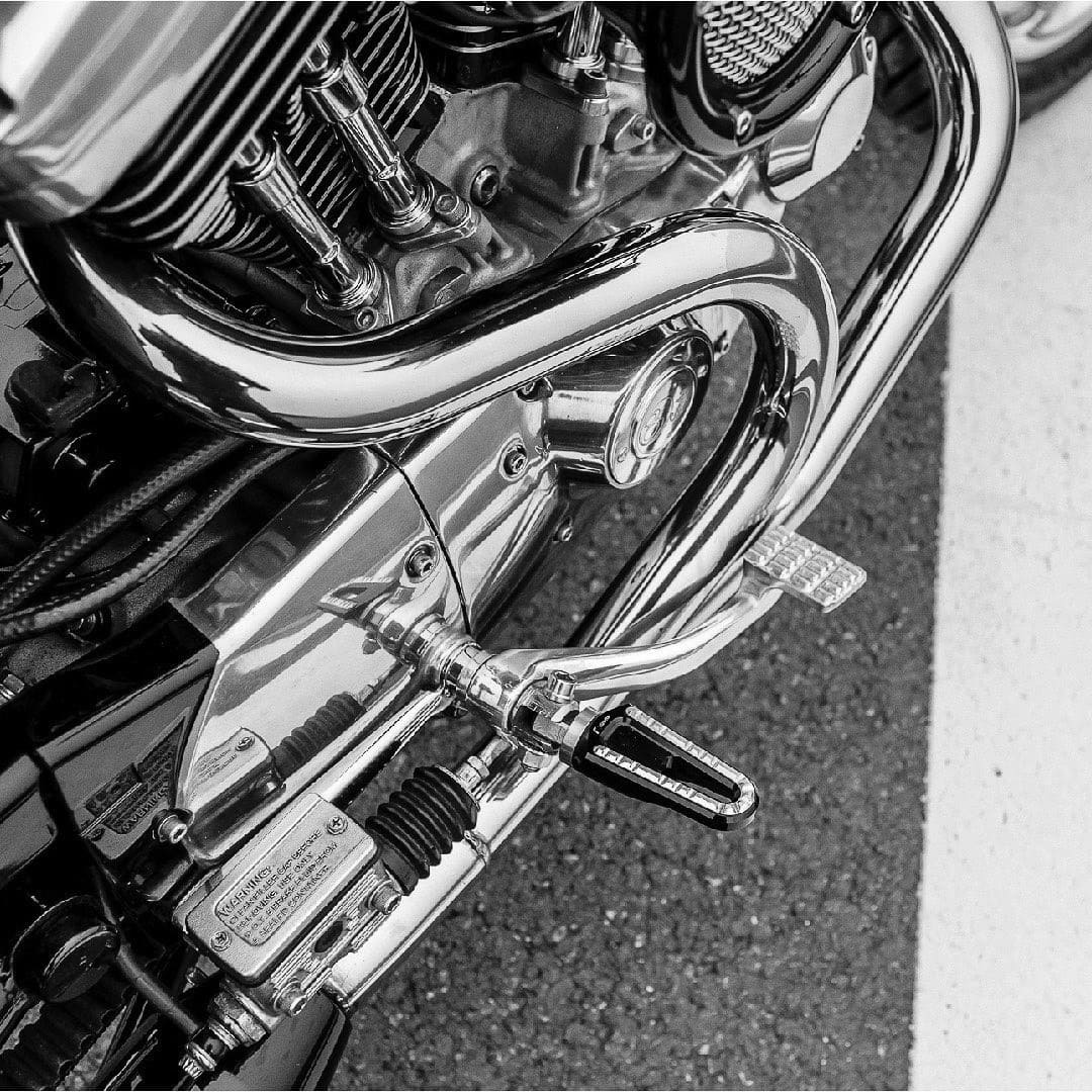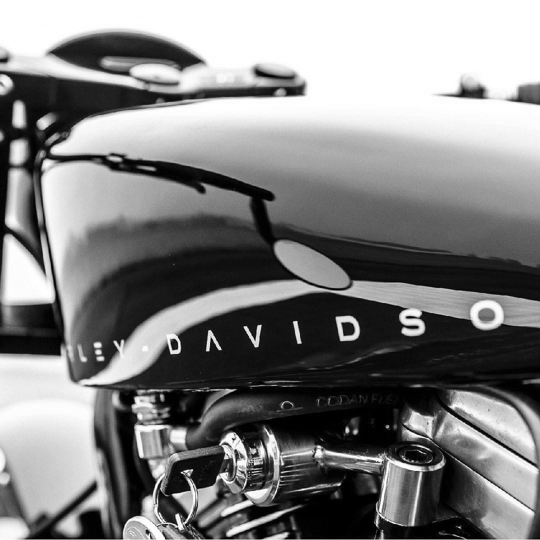 En bas sur les flancs de la moto, Guillaume a installé de nouveaux repose-pieds pour compléter l’ensemble ergonomique, mais il a également déplacé le contact hors de la vue du pilote. Il est maintenant juste en dessous du réservoir de carburant sur le côté gauche, améliorant encore l’ambiance minimaliste qui définit la zone du cockpit. Enfin, la Harley modifiée a été emmenée chez les gars de L’Aero pour le travail de peinture. La carrosserie a reçu une base noire avec plusieurs couches transparentes pour vraiment faire ressortir la brillance, tandis que le réservoir de carburant a été orné de graphiques Harley-Davidson. Pour briser un peu la palette de couleurs noires, plusieurs parties ont été laissées non peintes et soigneusement polies. Ces éléments comprennent les couvercles du moteur, les roues pleines et le pignon arrière.