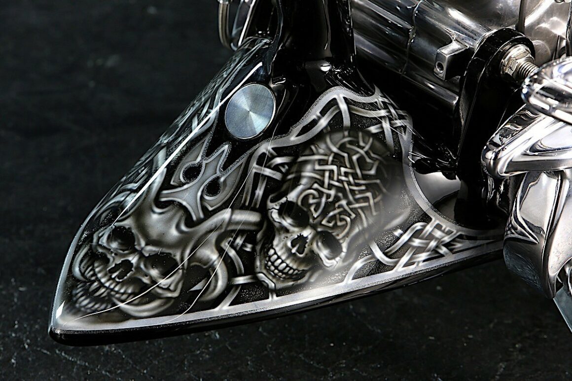 C’est humoristiquement en référence de ce que les gens voient des monstres partout. La déco se présente sous la forme de peintures de crânes horrifiques, principalement visibles sur le réservoir surélevé, ils sont également présents partout où se trouve un semblant de partie du corps humain. L’origine du cadre est sans importance, il est là, assez grand pour tenir confortablement dans son étreinte le moteur S & S d’origine non divulguée.