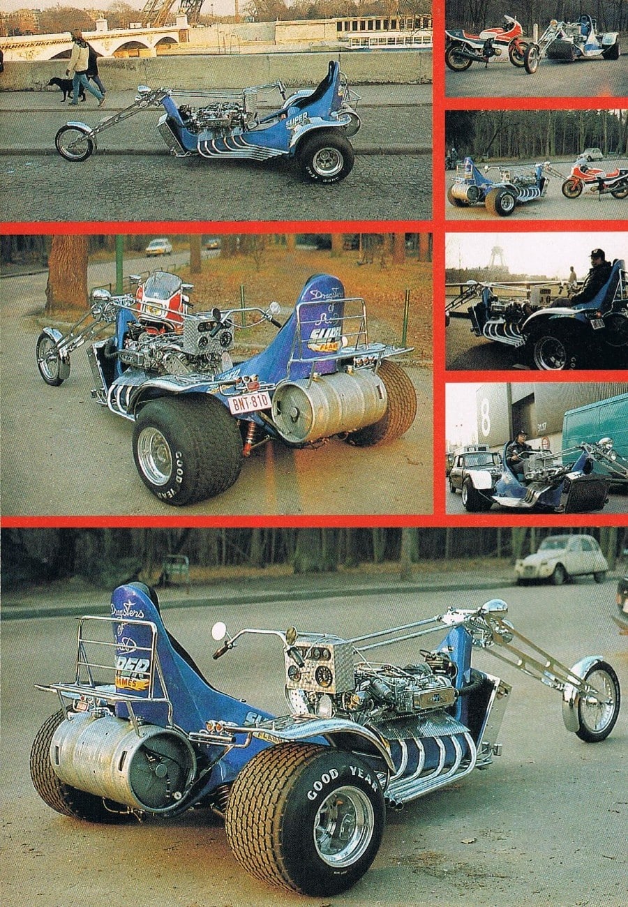 Le grand public appelle ça des Trike’s alors que leur appellation historique est plutôt celle de “Servi-cars”. Le Trike est généralement plus large et bas, certains ont un moteur VW et trois places. Historiquement, le Servi-car était une moto à laquelle on greffait un essieu arrière pour améliorer ses aspects pratiques : véhicules militaires, véhicules de police, ou véhicules de livraisons ( lait ou journaux), les applications ont été multiples et une firme comme Harley-Davidson en a produit des milliers à partir de 1932 et ce, jusque 1974. Mais d’autres acteurs sont venus sur ce créneau, tels Indian, avant Harley. Et n’oublions pas les centaines de milliers de Rickshaw asiatiques, qui suivent en fait (mais encore et toujours actuellement) le même concept. Pourquoi donc rouler en Trike (ou en servi-car) ? Bonne question, dans laquelle se retrouveront tous ceux qui pensent que la vie est trop courte pour rouler triste !