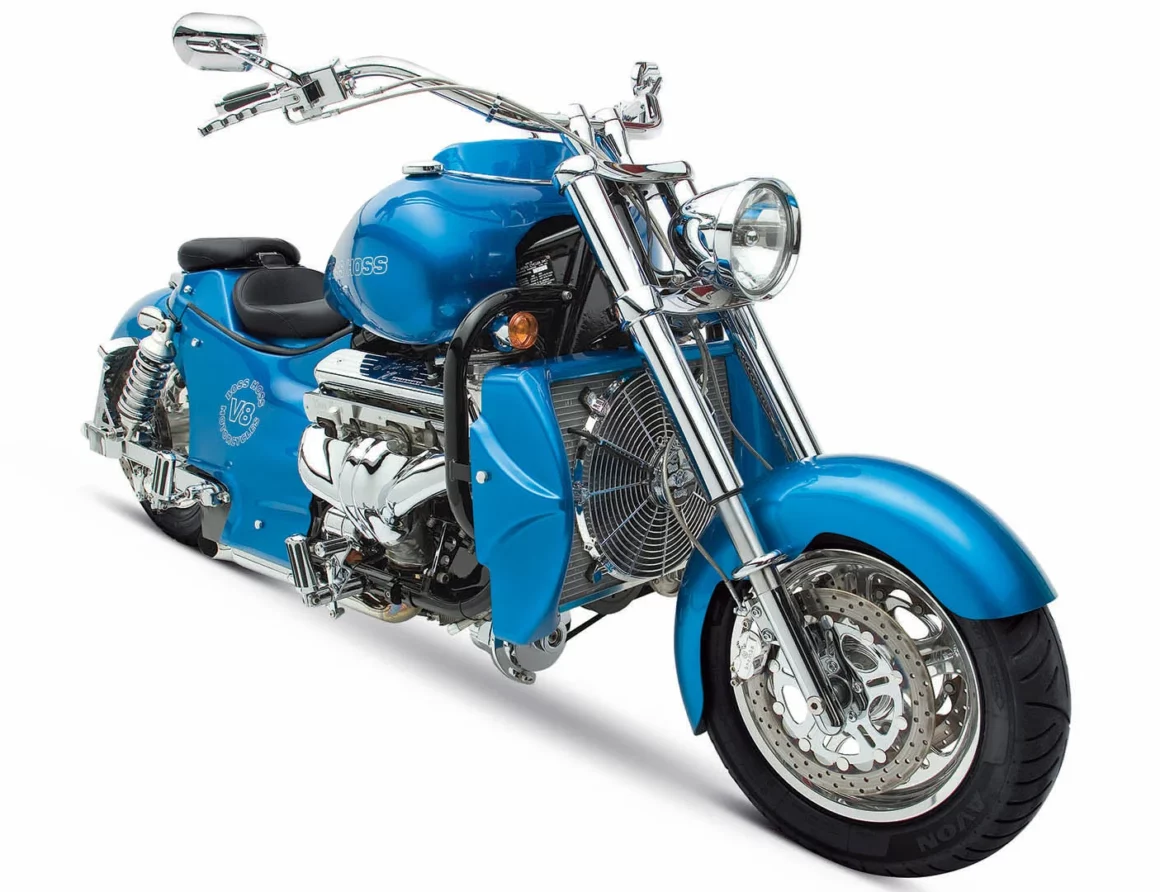 A la fin des années 1990, la Norton Nemesis V8, conçue par Melling, était issue de l’association de deux moteurs de 750 cc. Mais il n’y a pas eu de production en raison du retrait des investisseurs découragés par un imbroglio judiciaire. Même des blocs moteurs automobiles plus petits, greffés sur une partie cycle de deux-roues n’ont pas eu le succès escompté. En témoigne, en 1966, l’allemand Friedel Münch, qui avait conçu la Mammut, un NSU 996 cc, de 55 chevaux utilisé par Gérard Depardieu dans un film crépusculaire. Je cite également la BFG 1300 cc, produite entre 1978 et 1996, avec un moteur de GS Citroën, qui ne rencontra pas plus de succès. Toutes ces tentatives, abouties ou pas, induisent la résolution de défis techniques, notamment la réalisation d’une partie cycle capable d’encaisser un moteur V8, mais aussi la nécessité de trouver la place pour installer une boite de vitesses.
