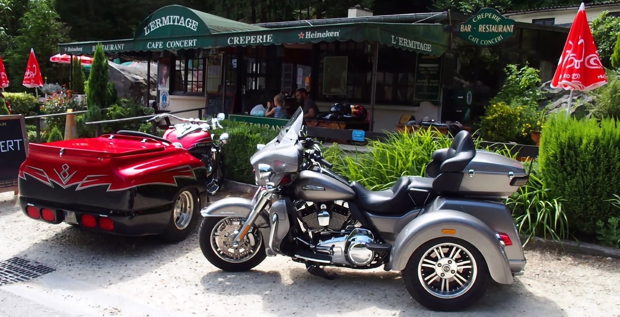 Les deux machines se laissent emmener assez facilement, chacune ayant leur point fort : pour la Boss Hoss, la boîte auto facilite la tâche, en gros, vous laissez faire sur “Drive” et vous gérez tout d’un petit coup de gaz, dans le grondement profond du V8, qui fait tourner les têtes des connaisseurs. Sur la Harley, on apprécie des commandes franches et fermes à la fois, façon Harley, donc et l’agilité supérieure du Tri Glide par rapport à sa concurrente du jour. Un défaut commun : les remontées de chaleur des moteurs, que notre essai estival a mis en exergue. Les deux engins disposent d’une marche arrière, plus facile d’accès sur la Boss Hoss (il suffit de mettre le levier en “R”) ; la Harley-Davidson demande l’usage de la touche “R” au commodo gauche. À basse vitesse, nos deux servi-car se laissent mener en toute simplicité : pour tourner, il suffit de tourner le guidon… Ca se compliquera un peu sur petite route…