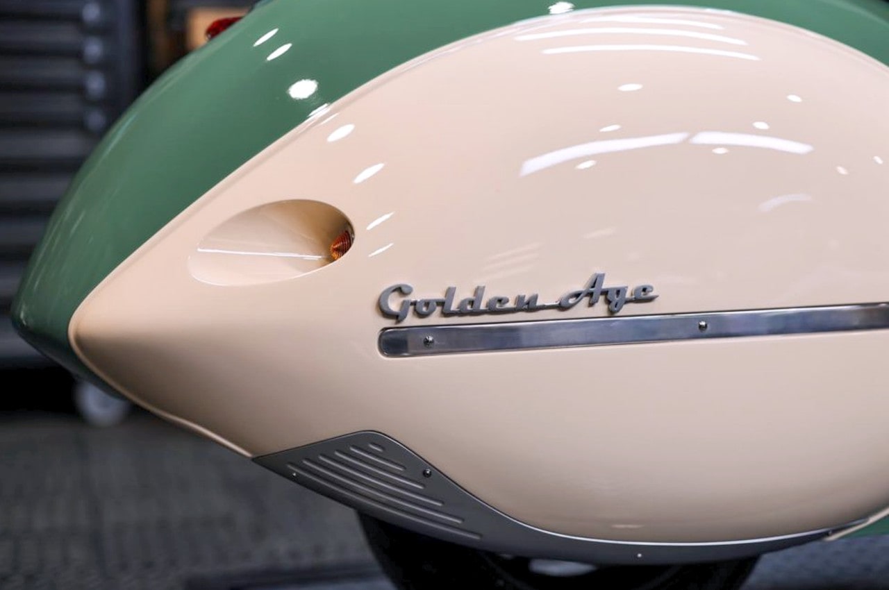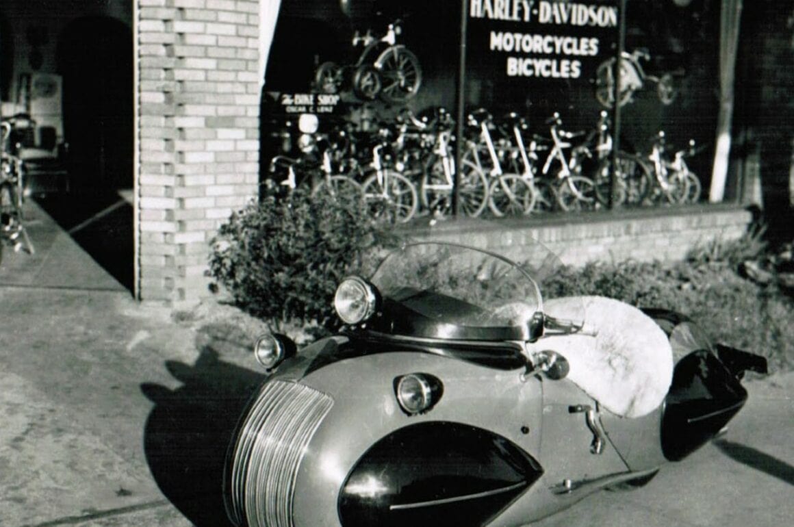 De retour de la guerre, Courtney Junior va s’associer à son père pour poursuivre l’aventure. Comme le précédent streamliner Art Déco de Courtney, l’Enterprise, du nom de leur société, était longue et basse avec un châssis entièrement enveloppé d’une coque streamline, cette fois avec un style typique des années 1950. Conçu pour un pilote et son passager, l’Enterprise comportait une selle avec des marchepieds allongés et des sacoches intégrées étaient moulées dans l’arrière. Elle a été construite en utilisant un moteur V-Twin d’Indian Scout du surplus de l’armée comme base, ce qui était beaucoup moins coûteux et plus facilement disponible que le quatre cylindre Henderson alors disparu. L’Enterprise était plus longue que l’Henderson, principalement parce que O. Ray voulait beaucoup d’espace pour deux passagers. Elle avait une empattement de 1.476 mm et mesurait 2.850 mm de bout en bout, mais ses roues de 9 pouces étaient encore plus petites.