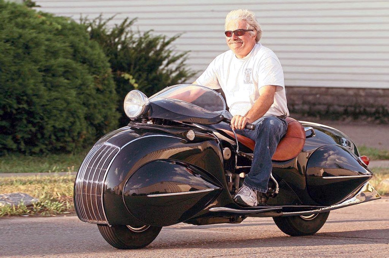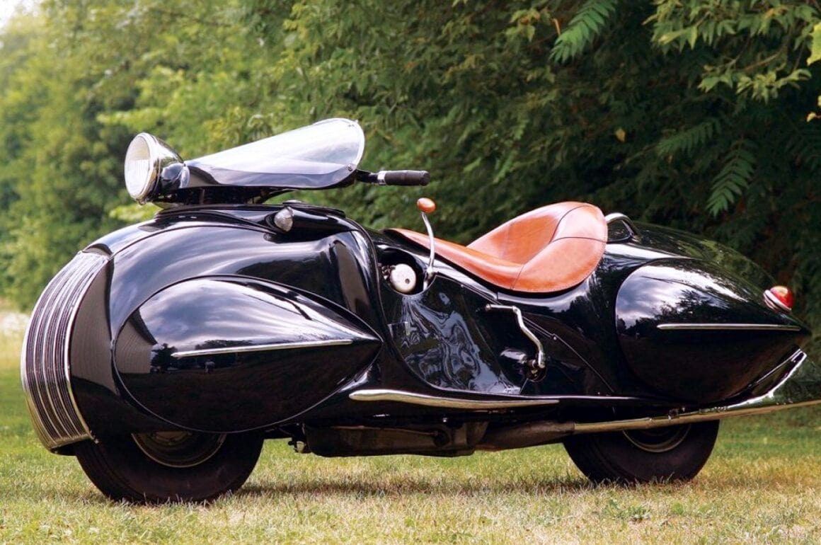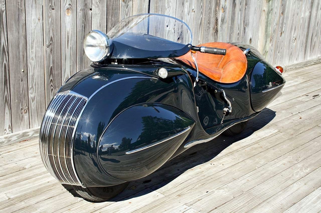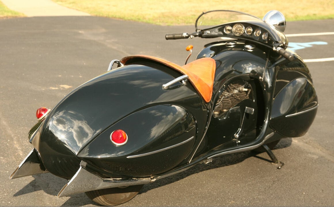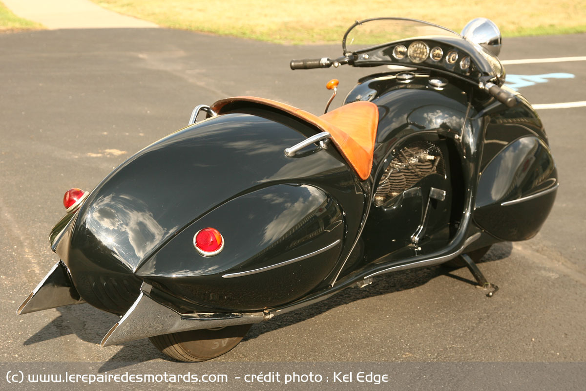 Le “nez” et la calandre arrondis sont clairement calqués sur la Chrysler Airflow et les roues entièrement cachées derrières des écopes en forme de larme avec l’arrière de la carrosserie descendant très bas, comme sur les Speedster Boat-tail du type de l’Auburn Speedster, populaires à l’époque. La selle basse et large est pour un seul pilote qui repose ses pieds sur de larges marchepieds, confortablement installé derrière un tableau de bord de type automobile avec une instrumentation abondante, ainsi qu’un grand phare avant qui se déplace avec la direction et prend place devant une bulle qui permet de dévier l’air vers la poitrine du pilote.