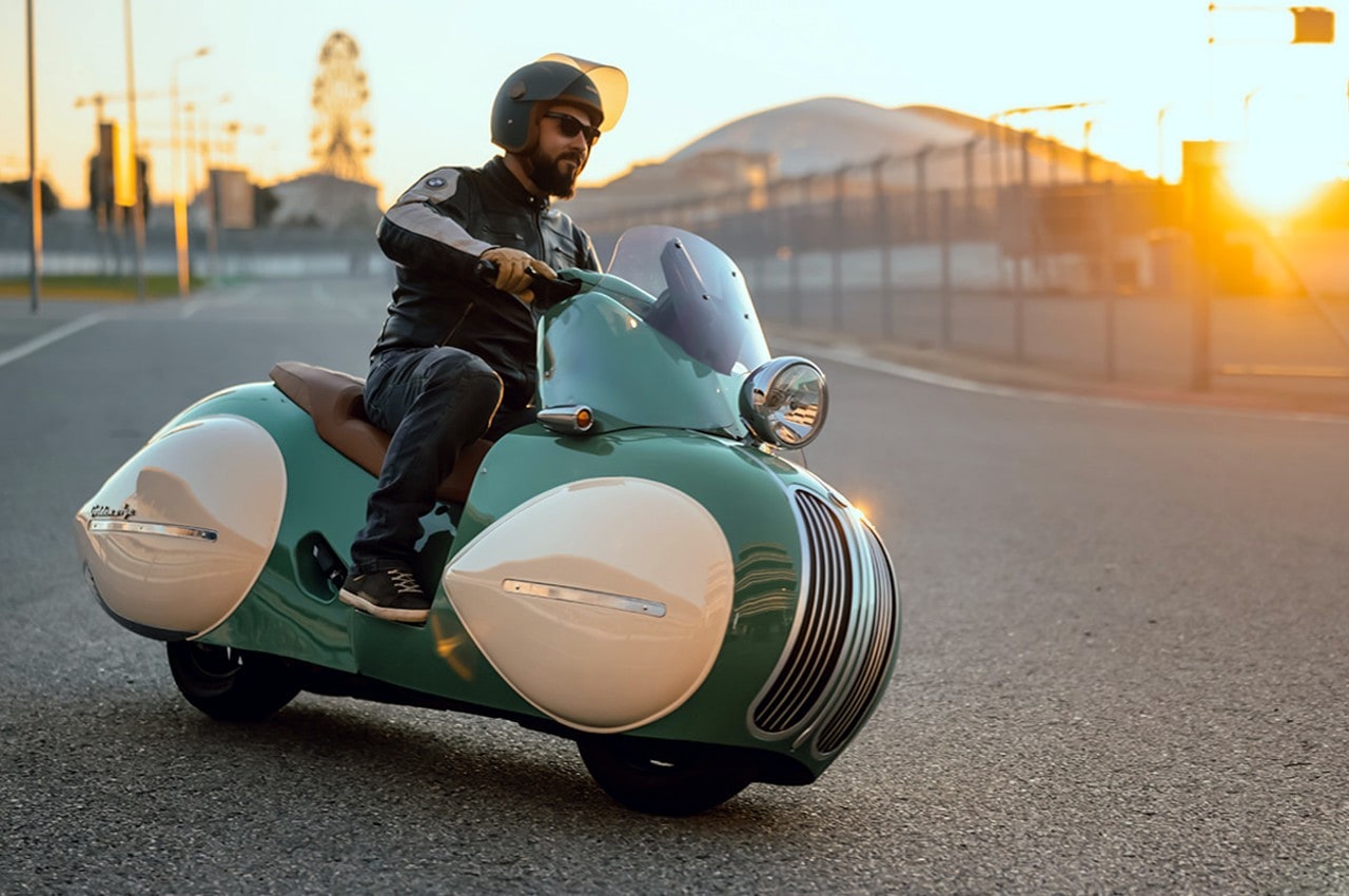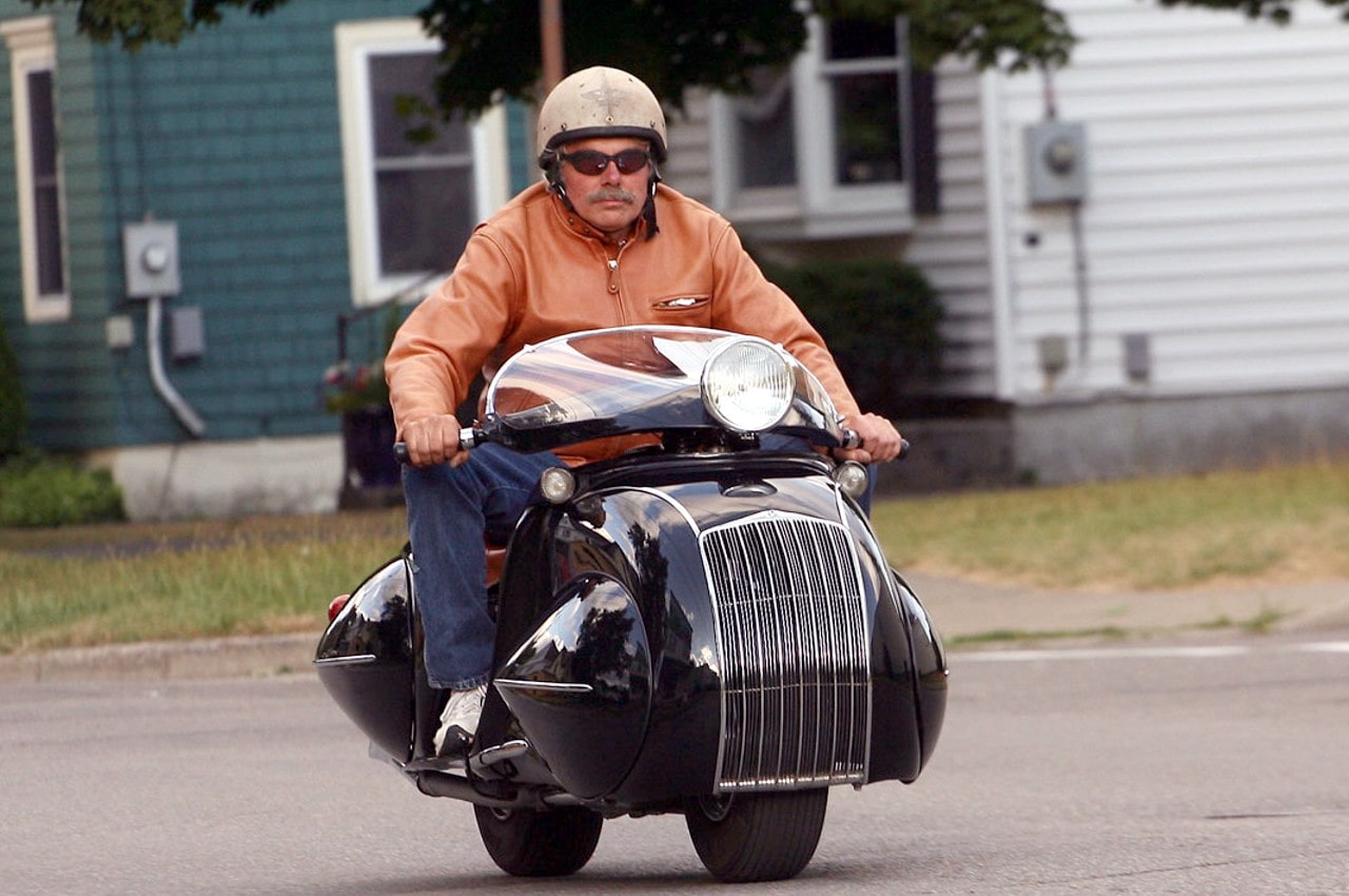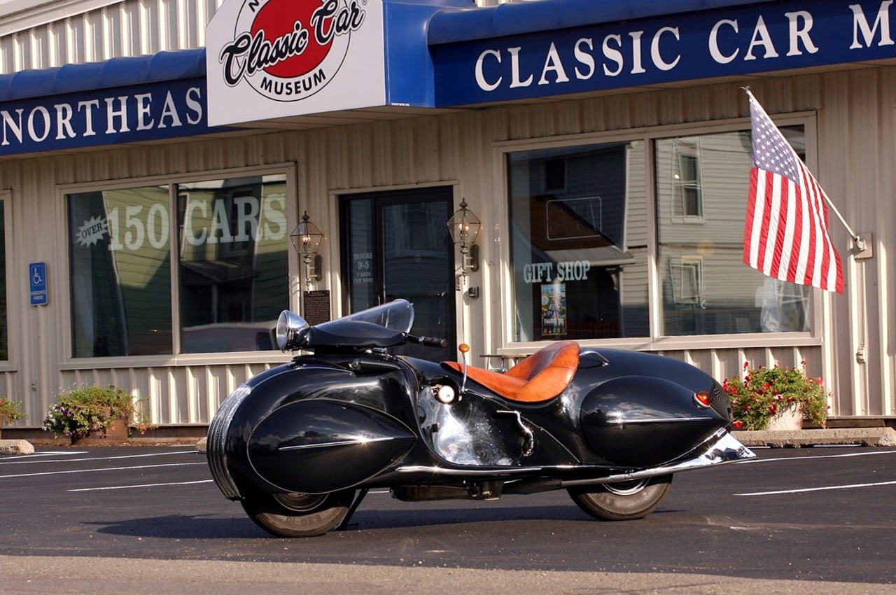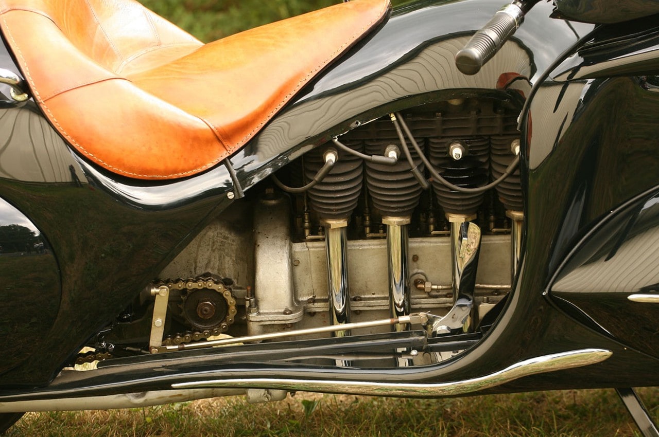 Le “nez” et la calandre arrondis sont clairement calqués sur la Chrysler Airflow et les roues entièrement cachées derrières des écopes en forme de larme avec l’arrière de la carrosserie descendant très bas, comme sur les Speedster Boat-tail du type de l’Auburn Speedster, populaires à l’époque. La selle basse et large est pour un seul pilote qui repose ses pieds sur de larges marchepieds, confortablement installé derrière un tableau de bord de type automobile avec une instrumentation abondante, ainsi qu’un grand phare avant qui se déplace avec la direction et prend place devant une bulle qui permet de dévier l’air vers la poitrine du pilote.
