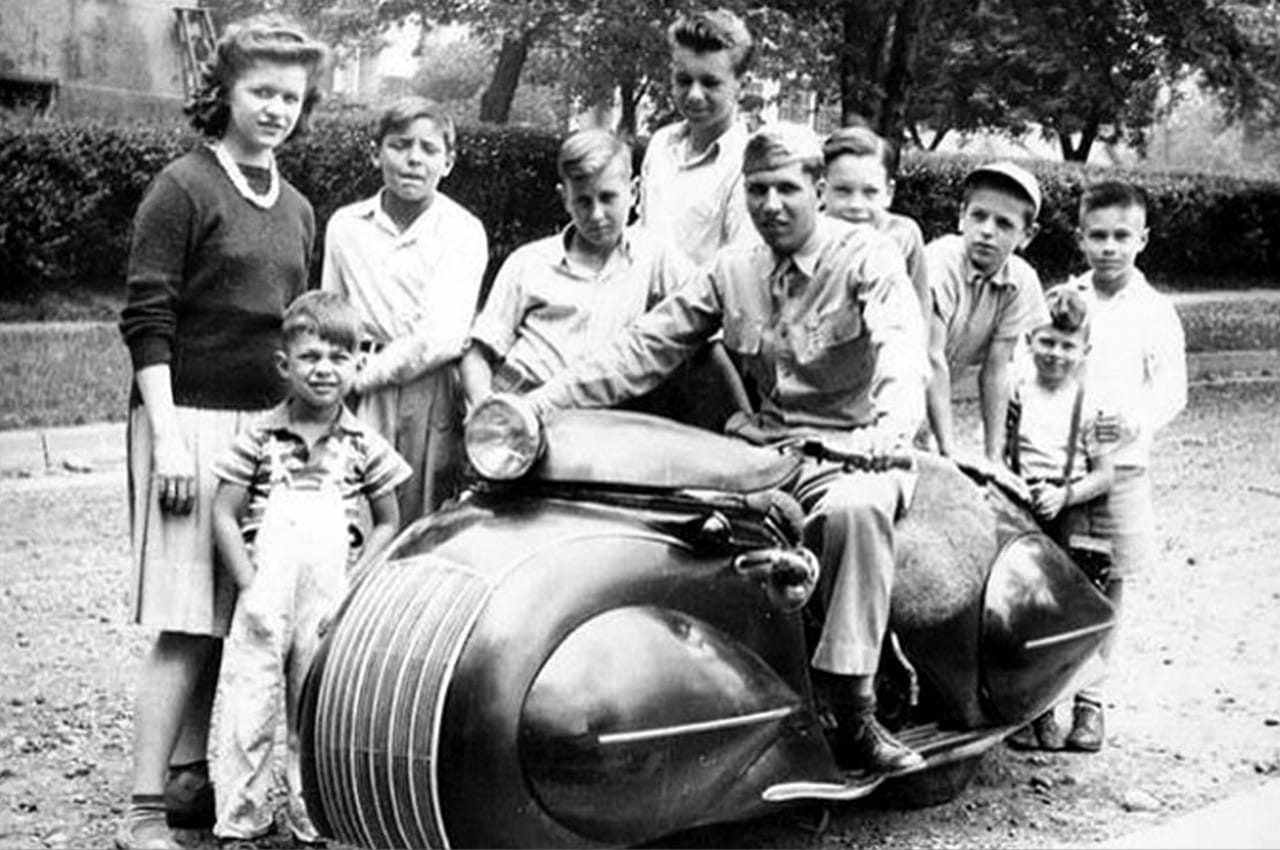 Mais ce qui est sans doute la moto la plus résolument Art Déco jamais construite est apparue aux Etats-Unis en 1935, unique création d’un métallurgiste basé dans le Michigan et employé par Oldsmobile. Celle-ci reposait sur la Henderson JK Streamline à moteur quatre cylindres de 1300 cm3 de 1930. Son nom était O. Ray Courtney. Bien que l’on en sache peu sur lui, il a construit une poignée de motos personnalisées innovantes au cours de sa vie. Dans un article de vulgarisation scientifique de 1953, Courtney était représenté aux côtés de photos d’autres motos qu’il avait continué à créer durant l’après-guerre, leur style évoquant le sentiment d’optimisme prévalant au début des années ’50.