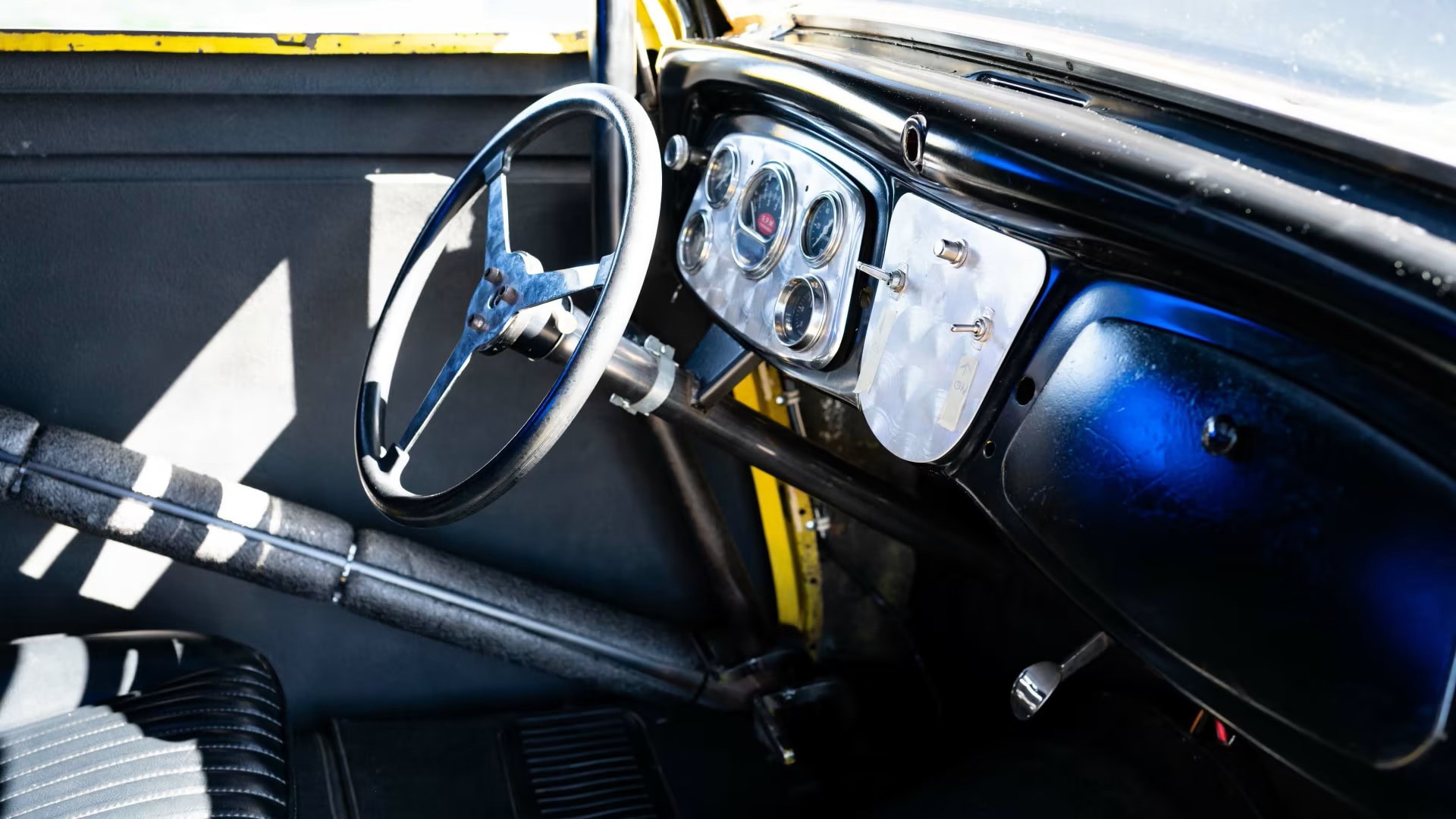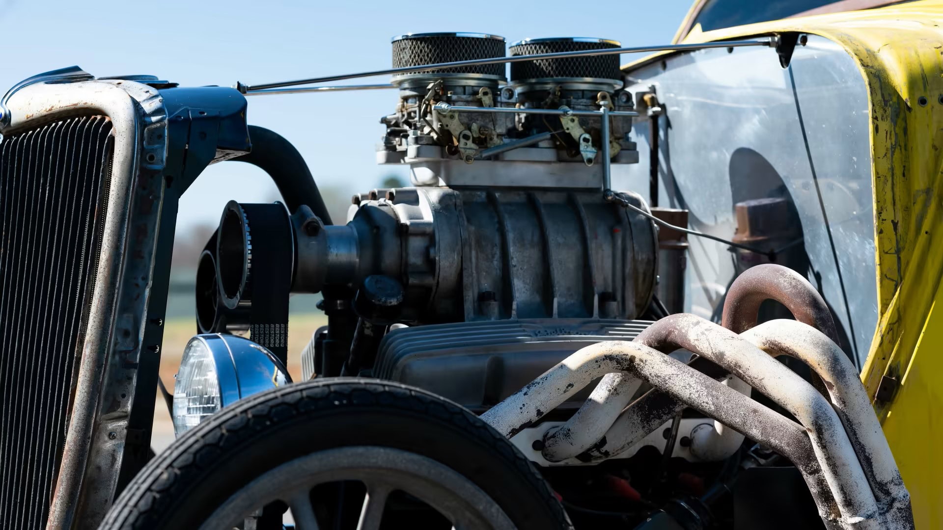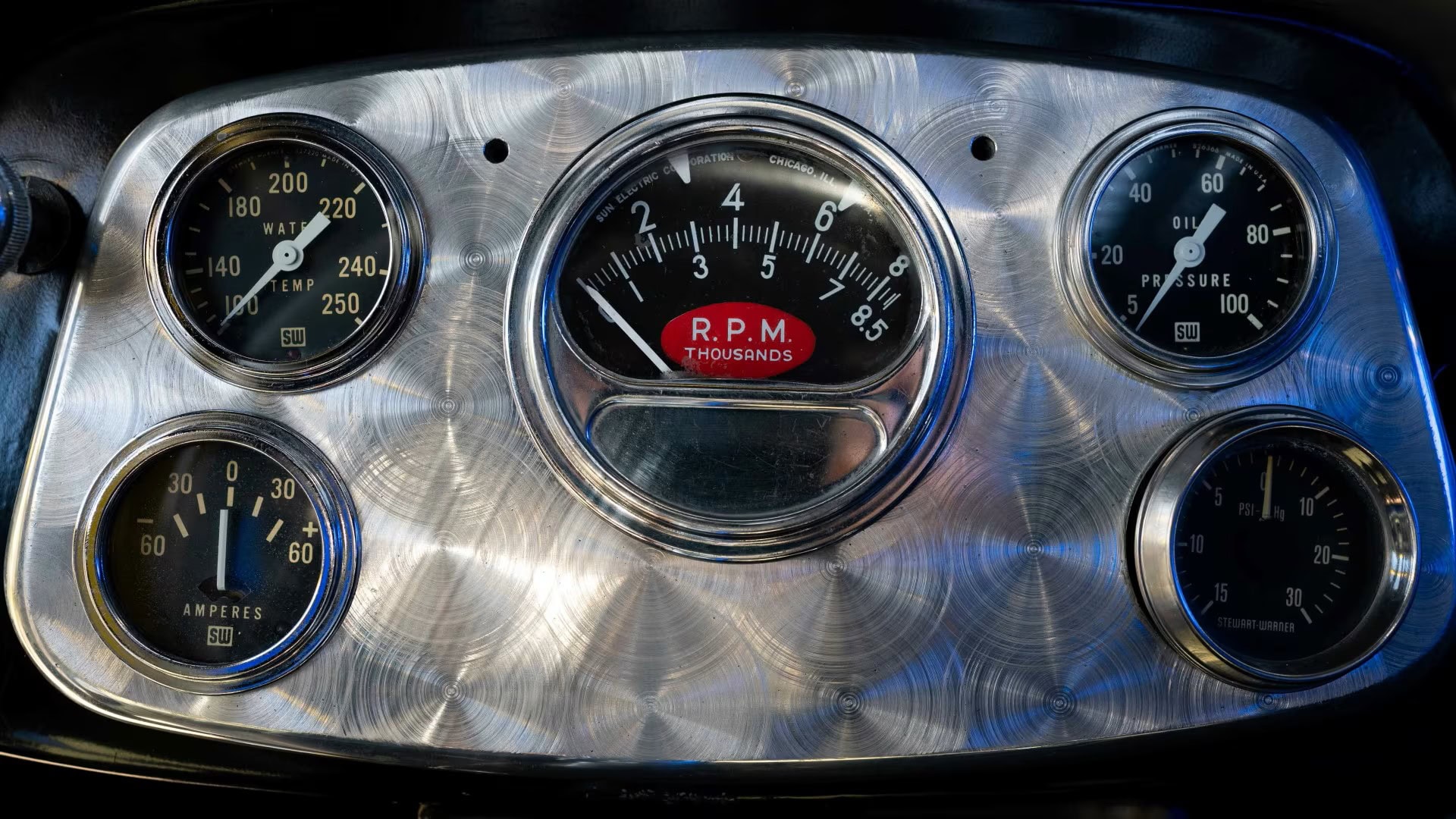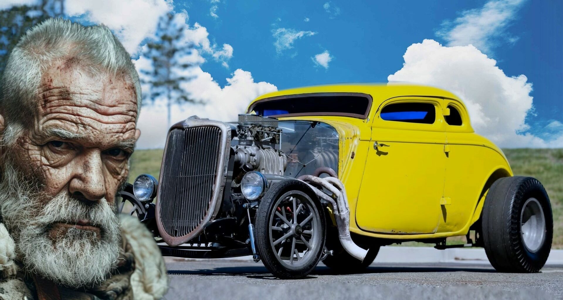 J’en viens enfin à mon testament, je t’offre un cadeau virtuel d’envergure, un Hot Rod imbattable en courses sur lacs salés, très connu sous le nom de “Chicken Coupe”, le Hot Rod personnel des frères Muro, qui a couru à la fois à El Mirage et à Bonneville dans les années 2000… Il roule et gagne régulièrement depuis les années 1960, donc bien avant que tu viennes à Chromes&Flammes qui vient à toi en retour. Cette voiture montre l’évolution du Hot Rodding Californien, avec des mises à jour au fil des ans. C’est un des premiers Hot Rod’s Coupés de course sur lacs salés, similaire au coupé révolutionnaire des frères Pierson mais avec 7 pouces retirés de la ligne de toit. L’âge de ce Hot Rod se vérifie en constatant que tout ce qui était métal a été réalisé par soudures au gaz… Son capot est authentiquement de 1933, son moteur V-8 355ci est une relique avec ses arbres à cames Comp Cams…