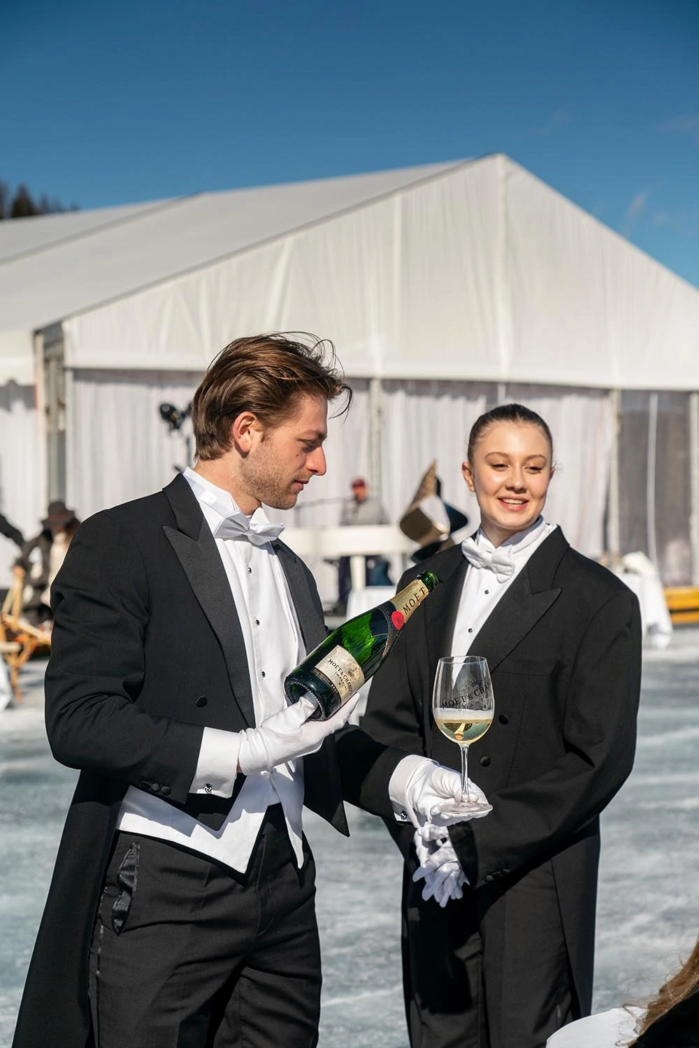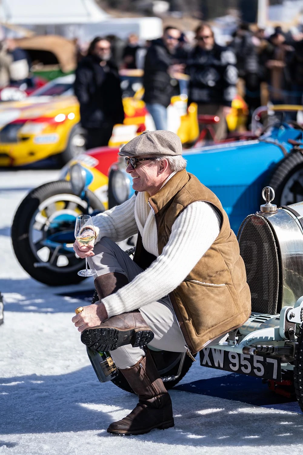 “Stilvoller als in St. Moritz lässt sich die Liebe zum alten Blech kaum zelebrieren”. Plus stylé qu’à St. Moritz laisse à peine célébrer son amour pour le vieux métal ! C’est pourquoi les coupes de champagne sonnent dans l’air glacial, elles sont remplies par des serveurs et serveuses en livrées sur patins à glace ! Voici une bouchée, juste un bisou et le chemin entre le Parc Fermé et la tente VIP devient une promenade pour félins/félines.