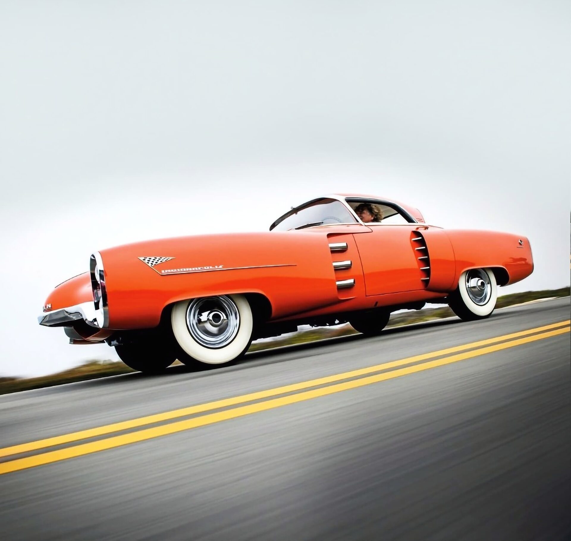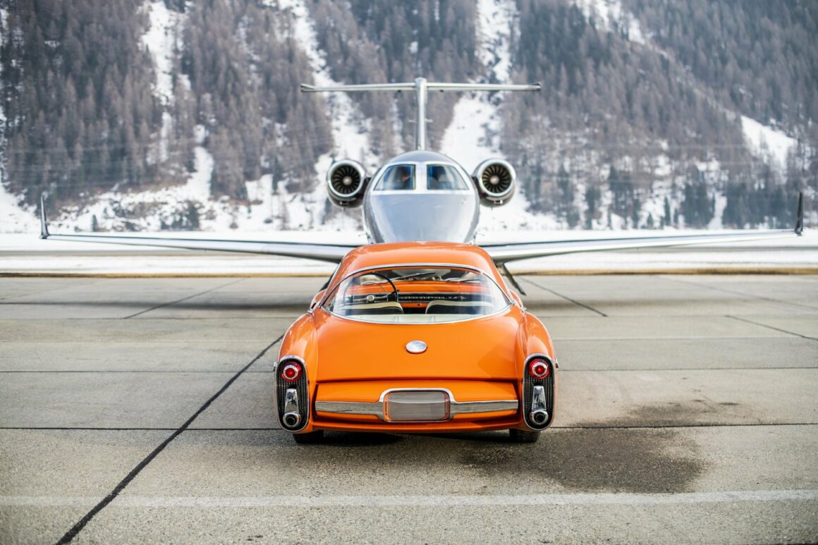 Le pare-brise et la lunette panoramiques sont très tendances à cette époque. L’habitacle est très gracieux, grâce à l’encadrement supérieur de la portière et au panneau de custode triangulaire. Inspiration aéronautique encore et toujours. Les faux échappements latéraux ne font que renforcer le style de la voiture qui nous en met plein la vue. Un avion de chasse ! Comme sur les autres concepts, les lignes de la voiture sont fortement inspirées par l’aéronautique.