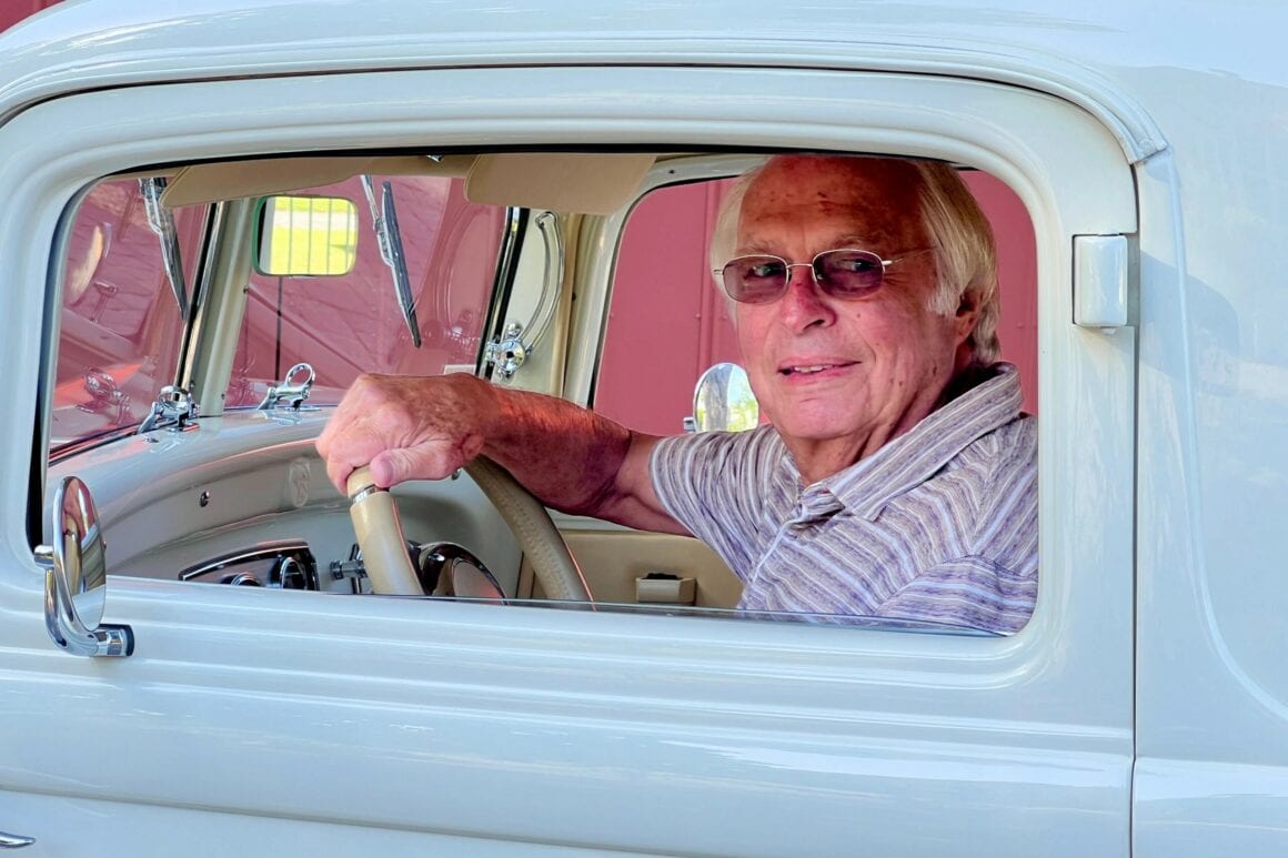 Après la séance photo, George m’a emmené faire un bon tour dans cette classique d’avant-guerre devenue Street Rod et je vous avoue que ce fut génial… C’est une construction fabuleuse. Contrairement à beaucoup de Street Rod’s que j’ai conduits ou dans lesquels j’ai roulé, ici, ça ressemble à une vraie voiture, pas à un kit bricolé. C’était cool, sans cliquetis. L’échappement grondait et en appuyant sur l’accélérateur, le gémissement du compresseur à délicieusement rempli l’habitacle. Quoi encore d’en écrire ? Que les emblèmes sur les panneaux intérieurs sont des insignes d’honneur. ?