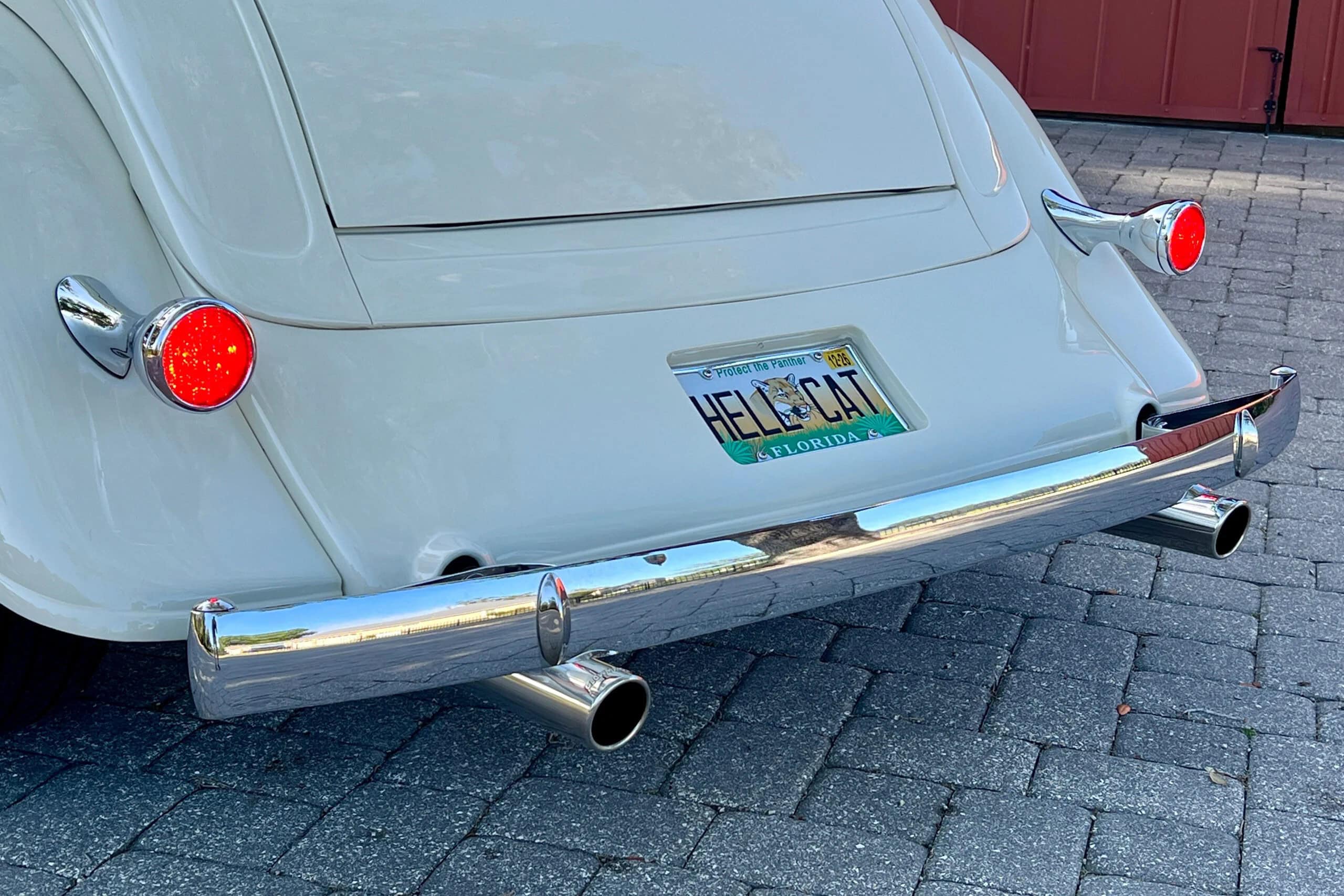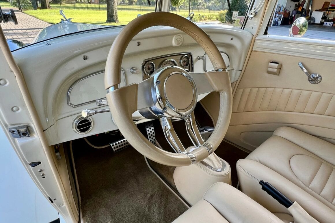 George est allé chez Intro pour les jantes (18×8 pouces AV, 20×11 AR. Ils sont spectaculaires et enveloppés de pneus Pirelli montés en série originale. En accord avec le thème Hellcat, George a conservé la taille arrière : 275/40ZR20. Les ampoules LED projettent une lumière beaucoup plus brillante à partir des boîtiers des phares d’usine qu’elles ne le faisaient en 1933. Cette Chrysler était un article coûteux lorsqu’elle était neuve, ce qui a contribué à ses faibles chiffres de production. Le propriétaire George Stump a consacré beaucoup d’efforts à rendre la carrosserie aussi droite et parfaite que possible.
