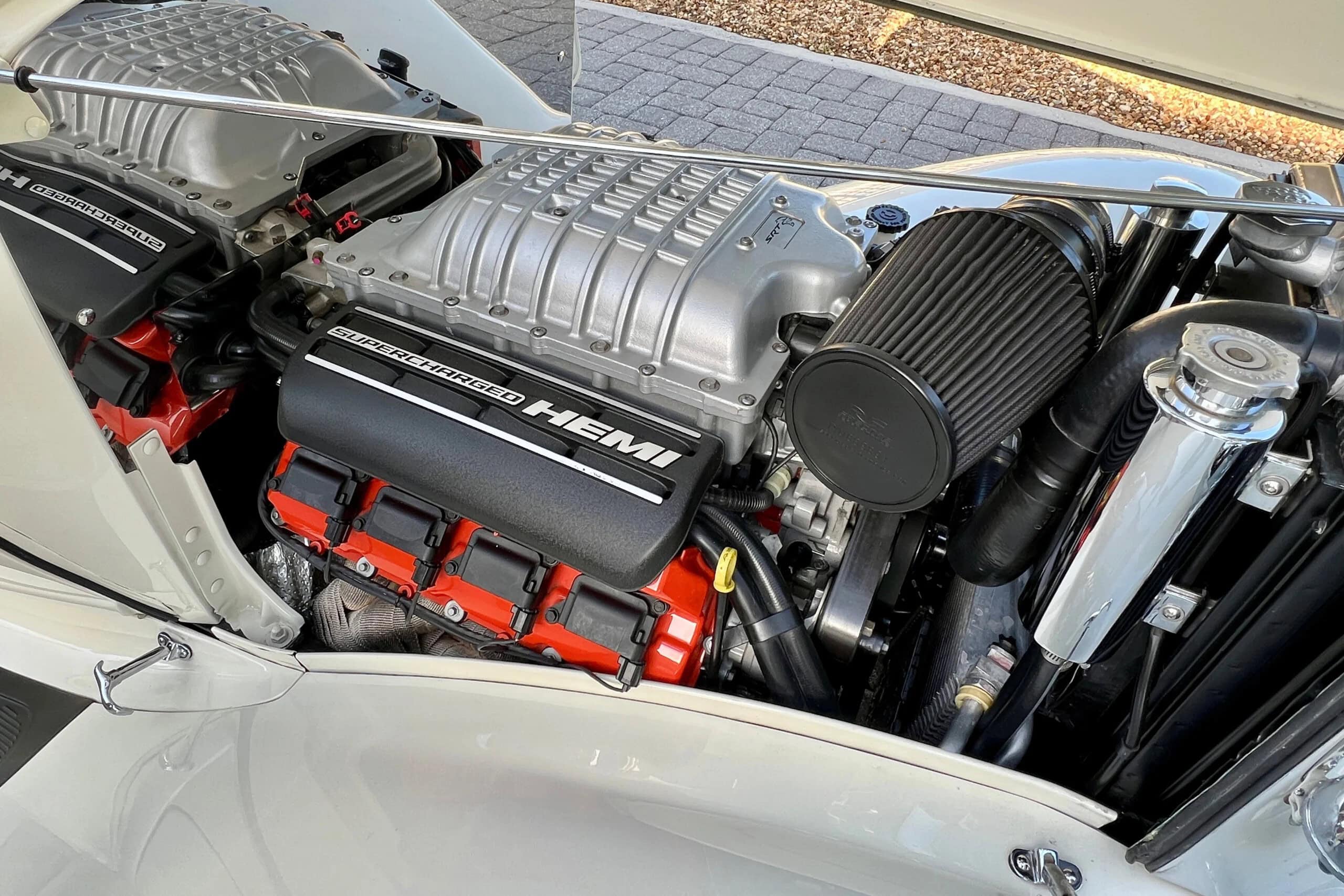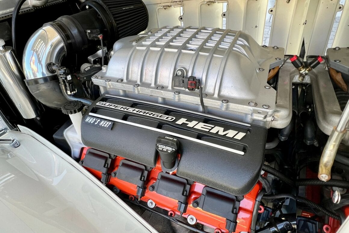 Sous le capot en quatre parties (2 ouvrants et 2 panneaux de flancs) se trouve le cœur de la révolution moderne de la performance Mopar : un V8 HEMI Hellcat suralimenté 6L2 de 800cv avec sa boîte automatique à huit vitesses d’origine, issus d’une épave de Chalenger accidentée. À l’exception des collecteurs fabriqués par George, Ed Britz, des silencieux Flowmaster d’échappement en 2,75 de diamètre, la mécanique est telle qu’elle a quitté la chaîne de montage. Britz a aidé George à construire toute la voiture. Les deux étant amis très proches fanatiques de Hot/Rat et Street Rod’s.