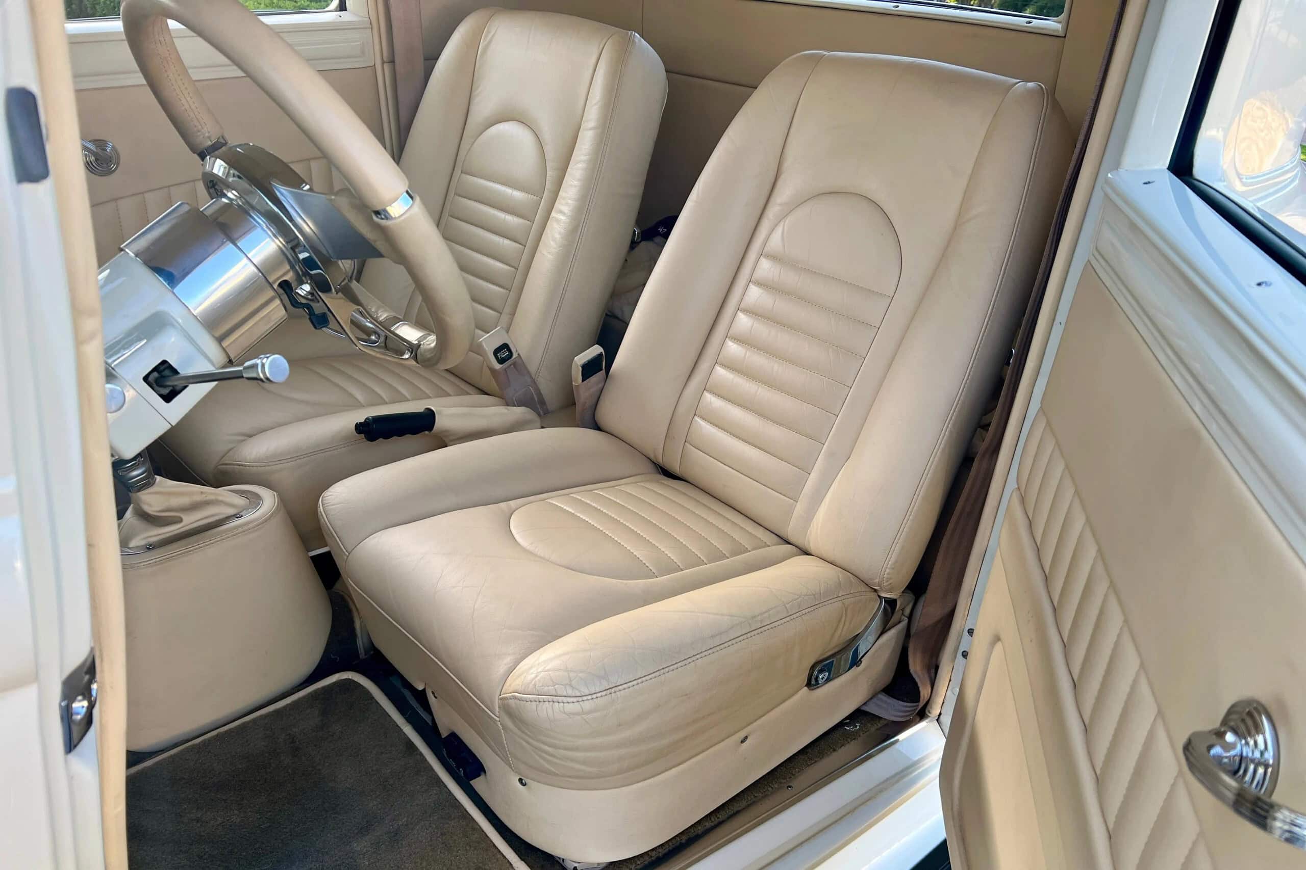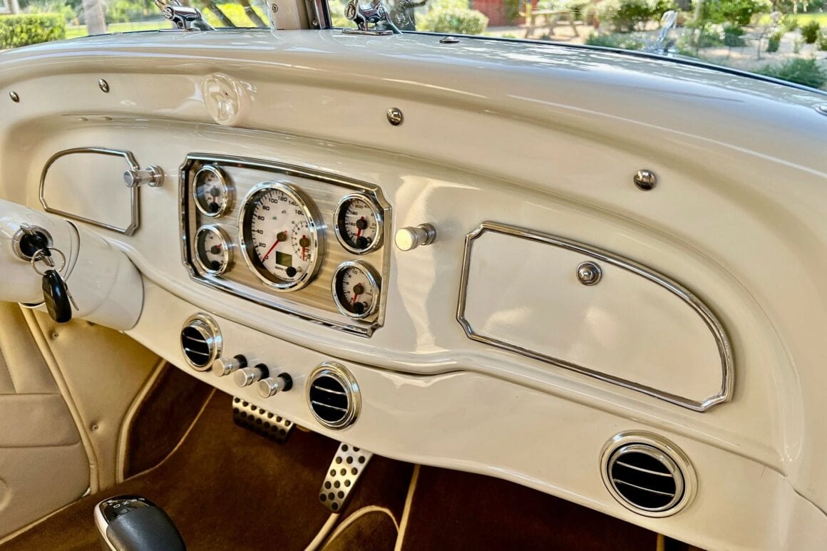 George et Ed ont fait toute la carrosserie et la peinture. Ce n’était pas une promenade de santé, car la carrosserie était en mauvais état. Pour obtenir de l’inédit,, George a choisi le “Cool Vanilla”, une teinte d’usine de PPG qui a été proposée de 2010 à 2020. La seule chose qu’ils n’ont pas faite était l’intérieur. C’est Dave Chrissy de Chrissy Interiors à Johnstown, en Pennsylvanie, qui a revitalisé le poste de pilotage. Il a entièrement reconstruit des sièges Corvette 1968 et les a recouverts de cuir BMW Fawn Beige. Speed Hut a reçu le feu vert pour les compteurs , qui se trouvent dans le tableau de bord d’usine rénové.
