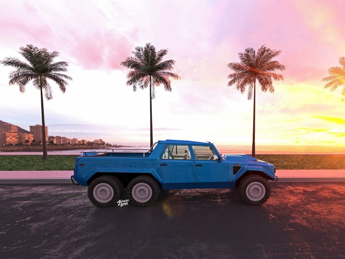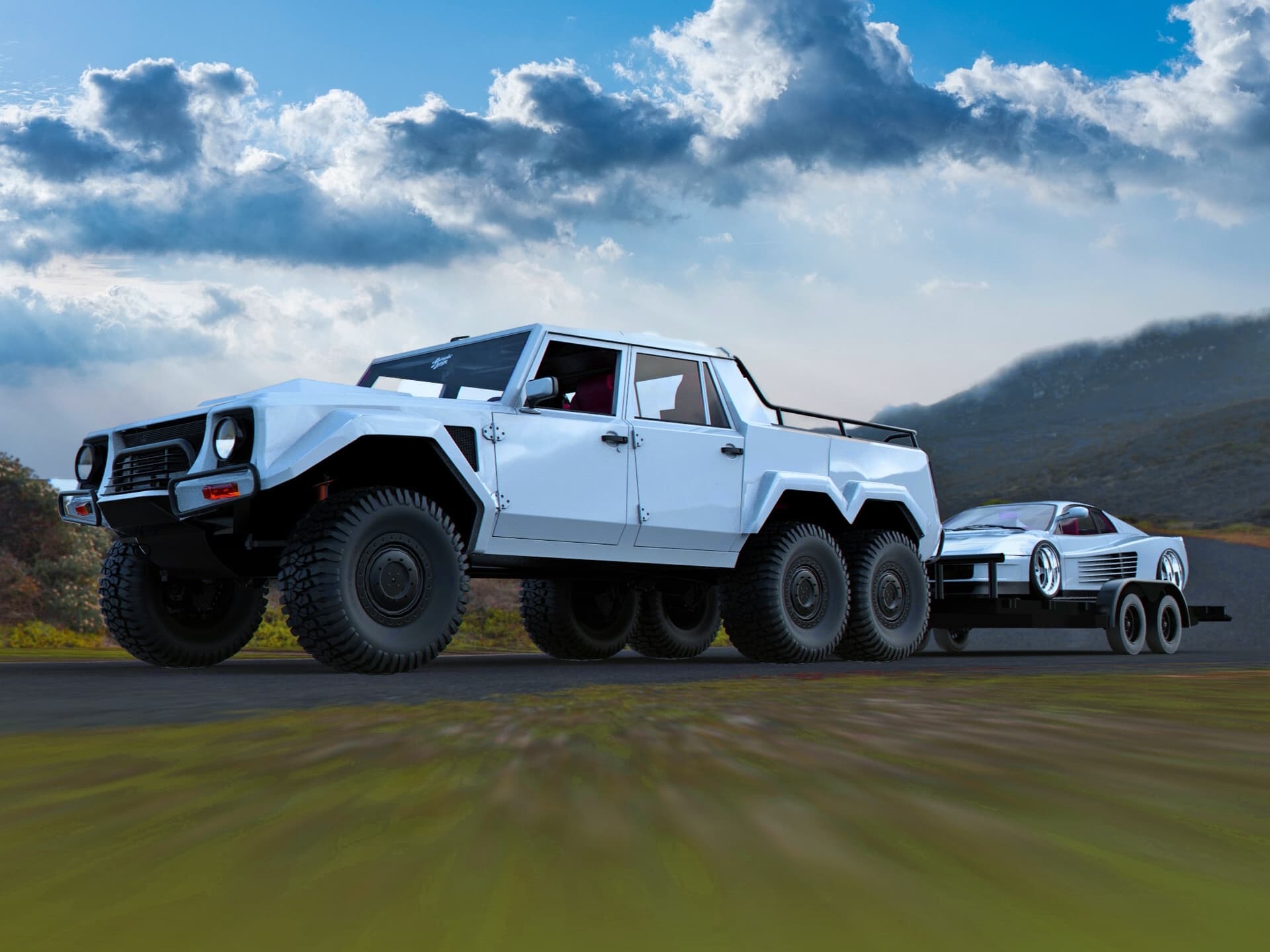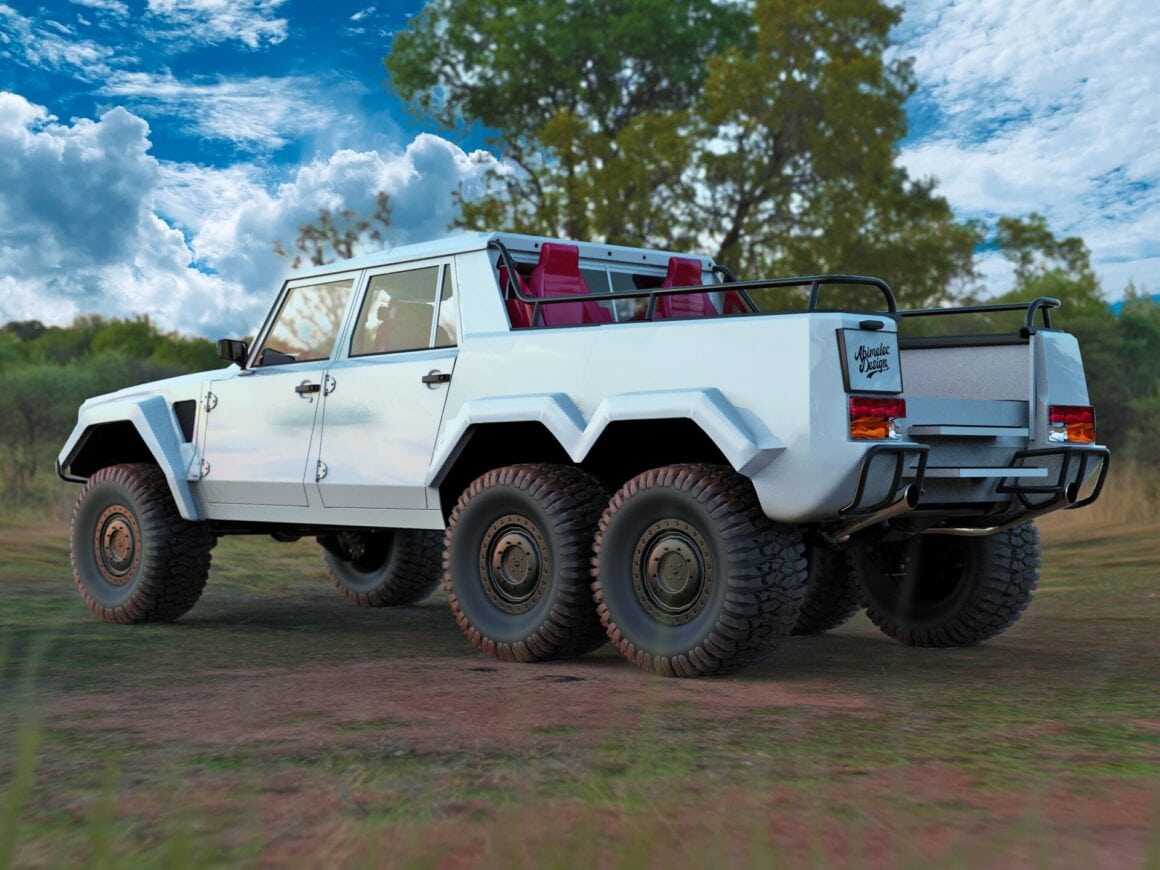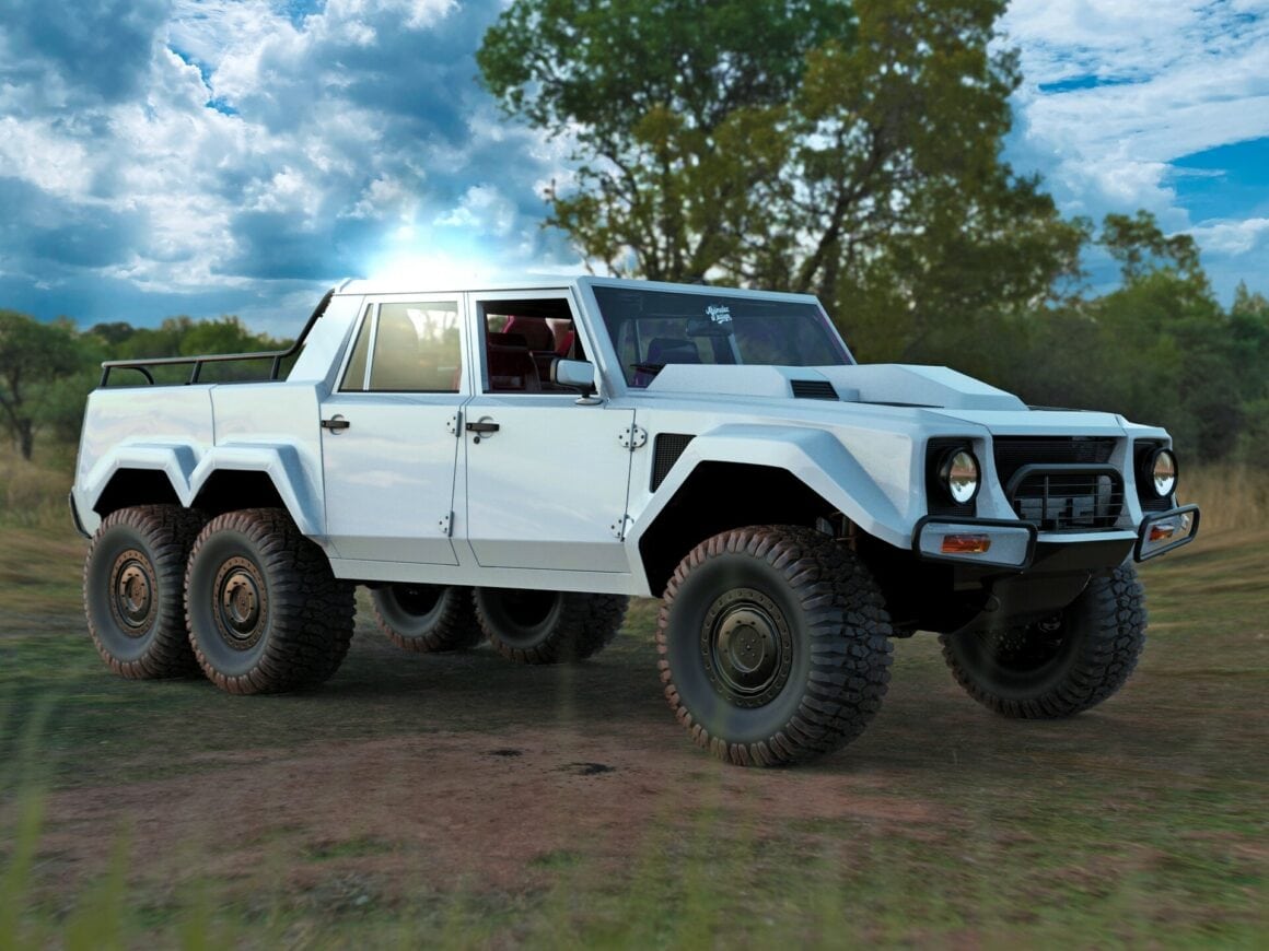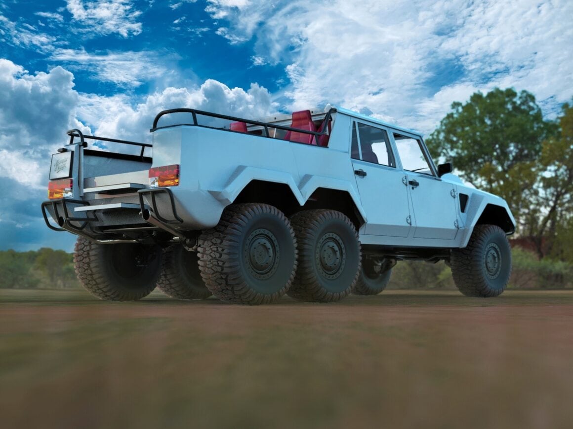 Piting ! Ca veut dire quoi ce charabia ? Je lis ensuite que le designer de cet engin qui n’existe pas, Abimelec Arellano, a pris le SUV LM002 ultra-rare de Lamborghini tout comme il aurait pu prendre une Jeep Wrangler et a fait exactement cela, en ajoutant un ensemble supplémentaire de roues. Le LM002 est toujours propulsé par le V12 de 5,2 litres de Lamborghini, produisant plus que suffisamment de puissance pour compenser l’essieu supplémentaire qui n’a aucune praticité.