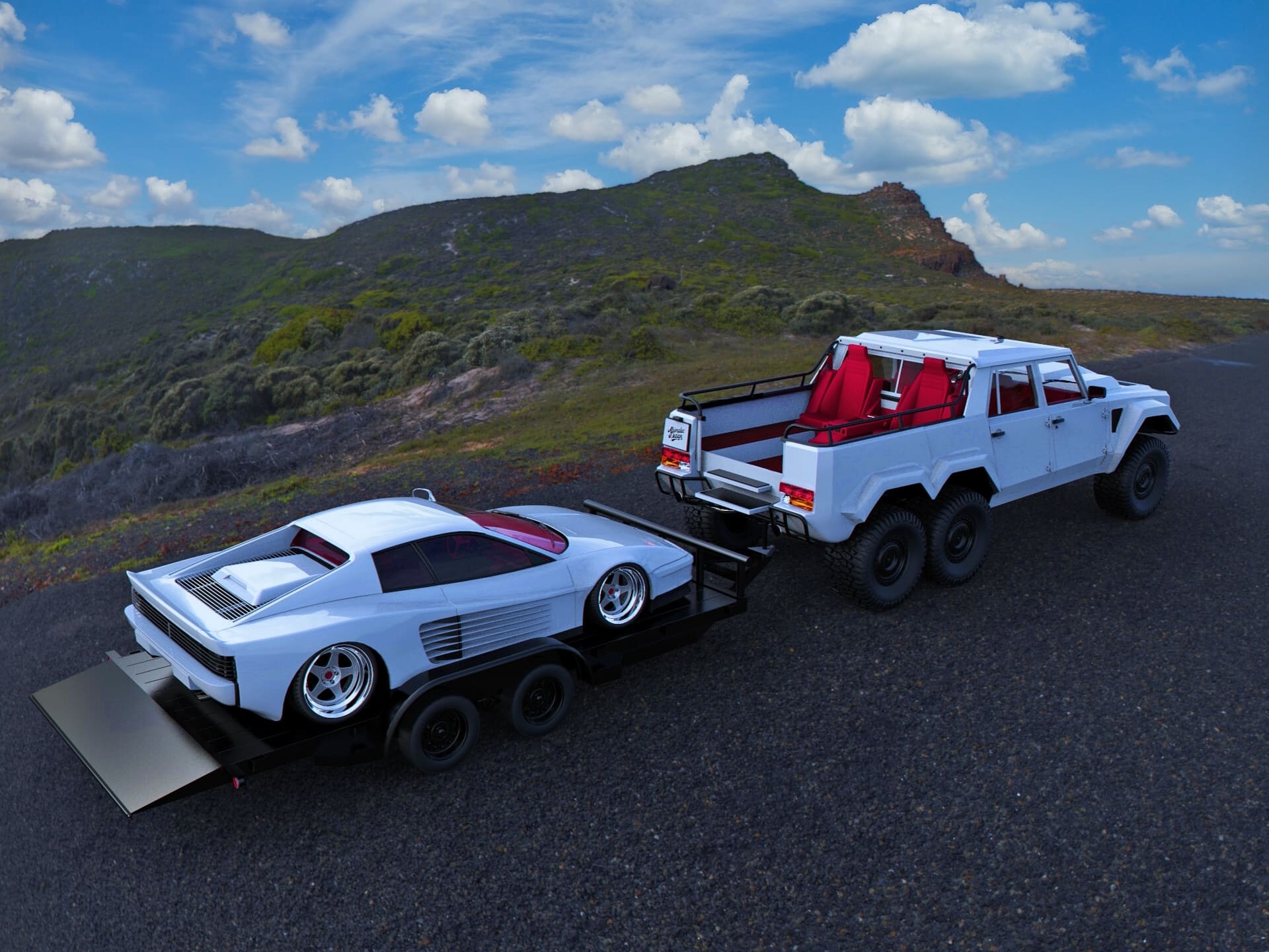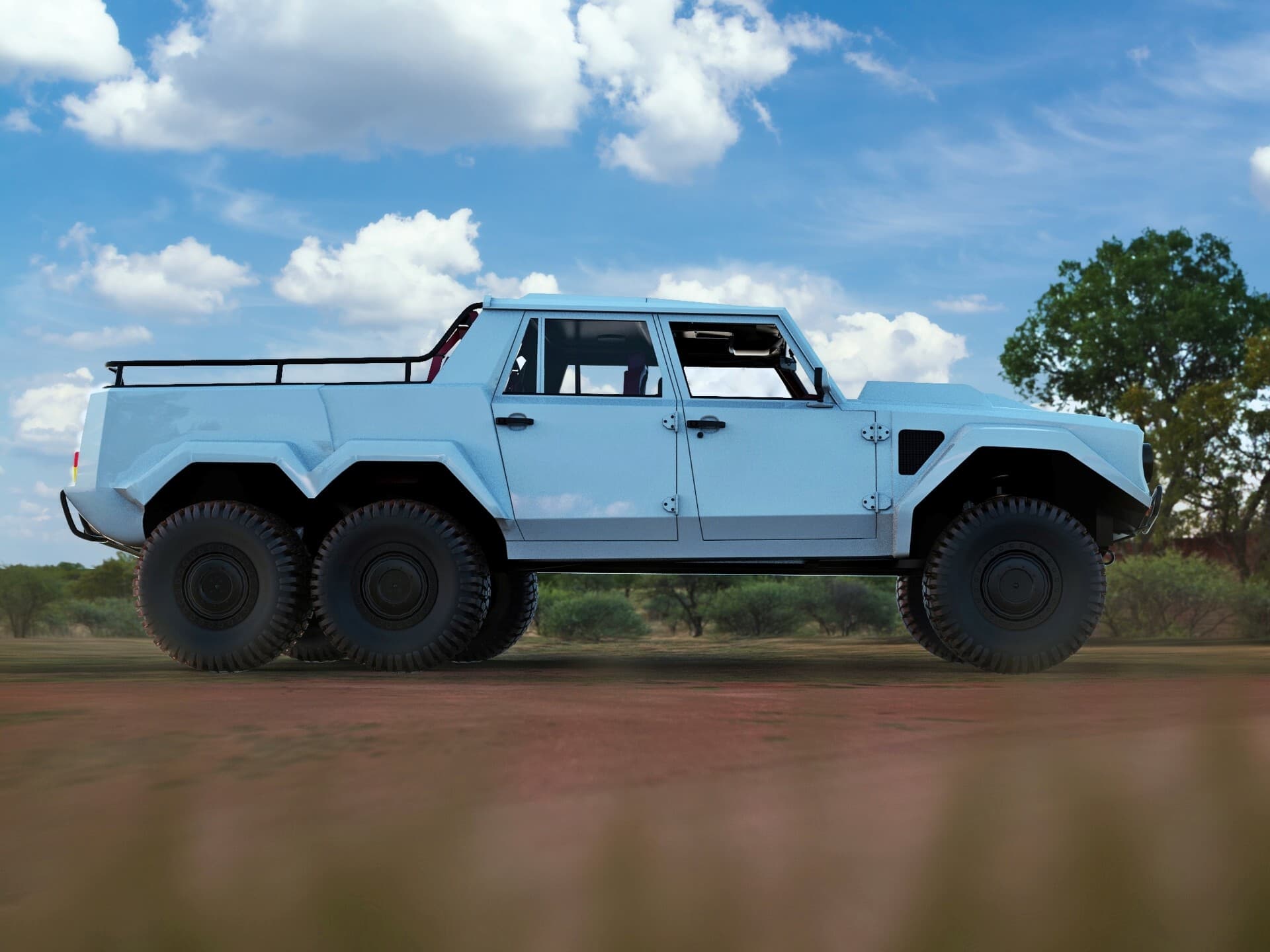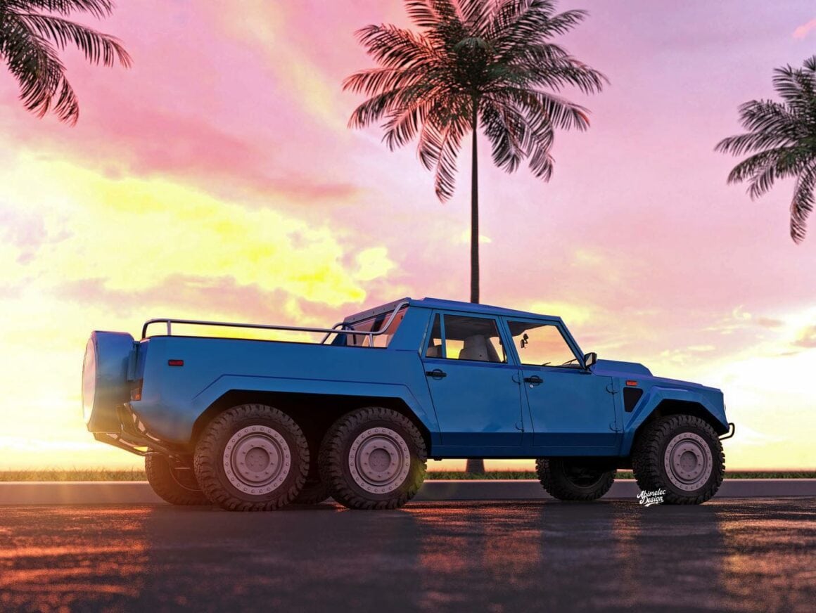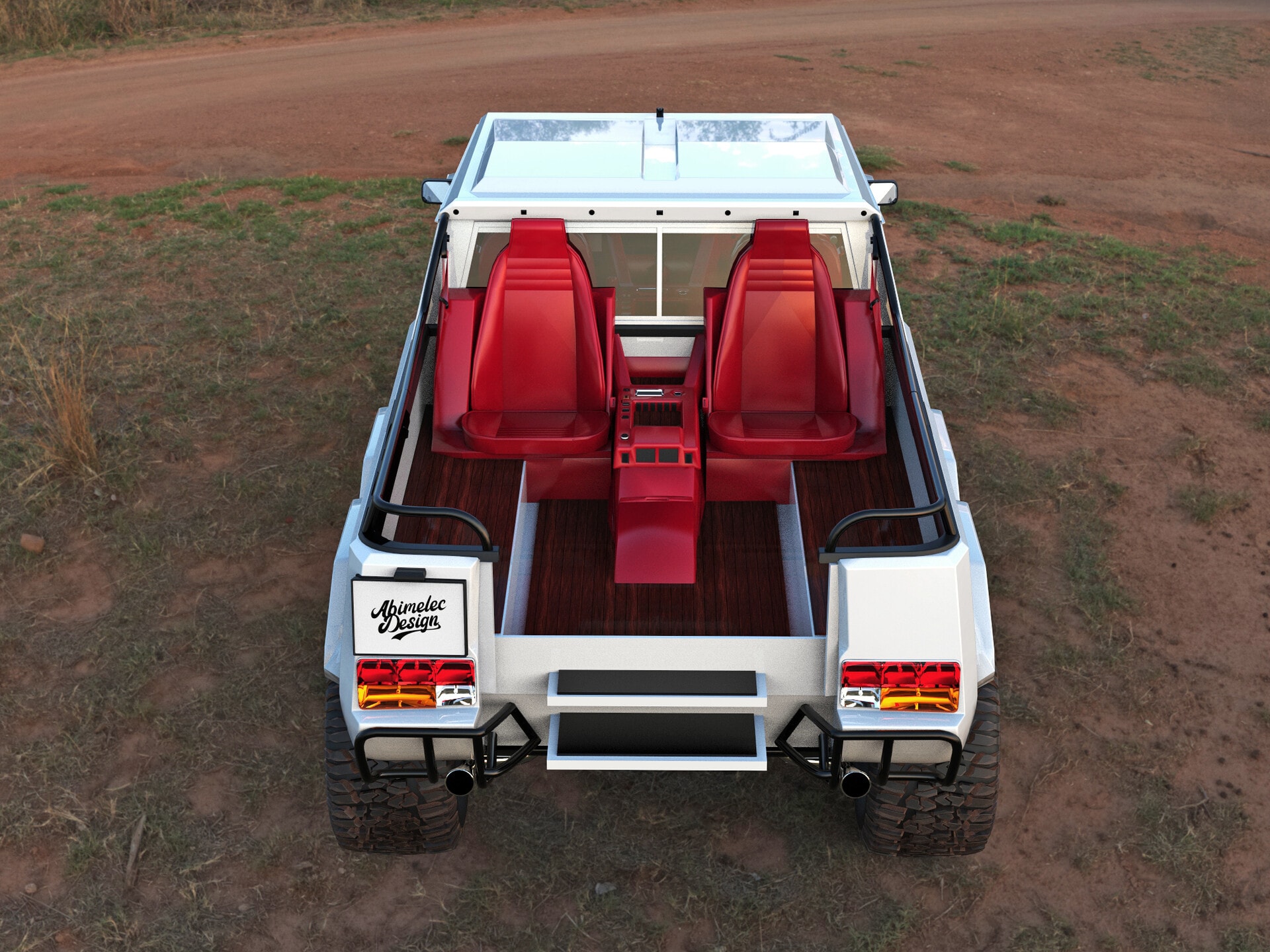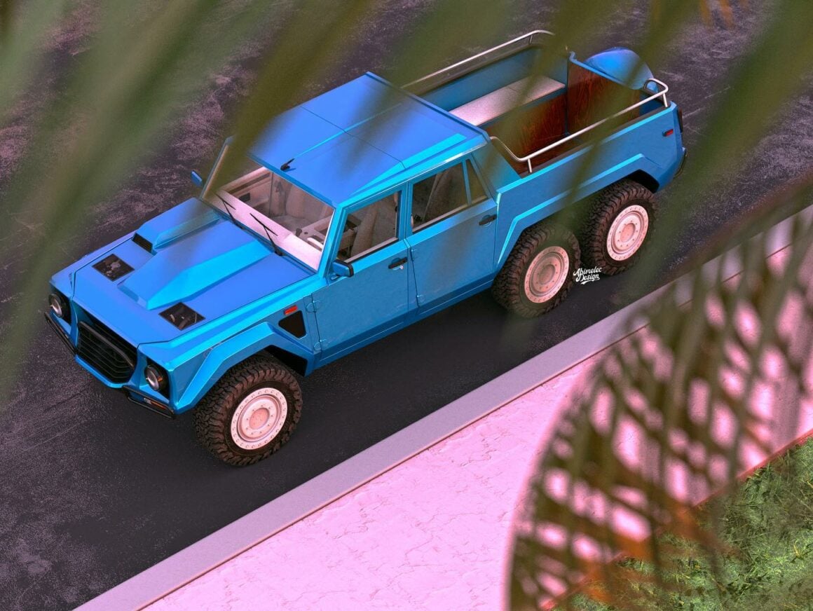 Piting ! Ca veut dire quoi ce charabia ? Je lis ensuite que le designer de cet engin qui n’existe pas, Abimelec Arellano, a pris le SUV LM002 ultra-rare de Lamborghini tout comme il aurait pu prendre une Jeep Wrangler et a fait exactement cela, en ajoutant un ensemble supplémentaire de roues. Le LM002 est toujours propulsé par le V12 de 5,2 litres de Lamborghini, produisant plus que suffisamment de puissance pour compenser l’essieu supplémentaire qui n’a aucune praticité.
