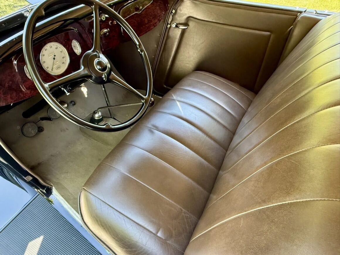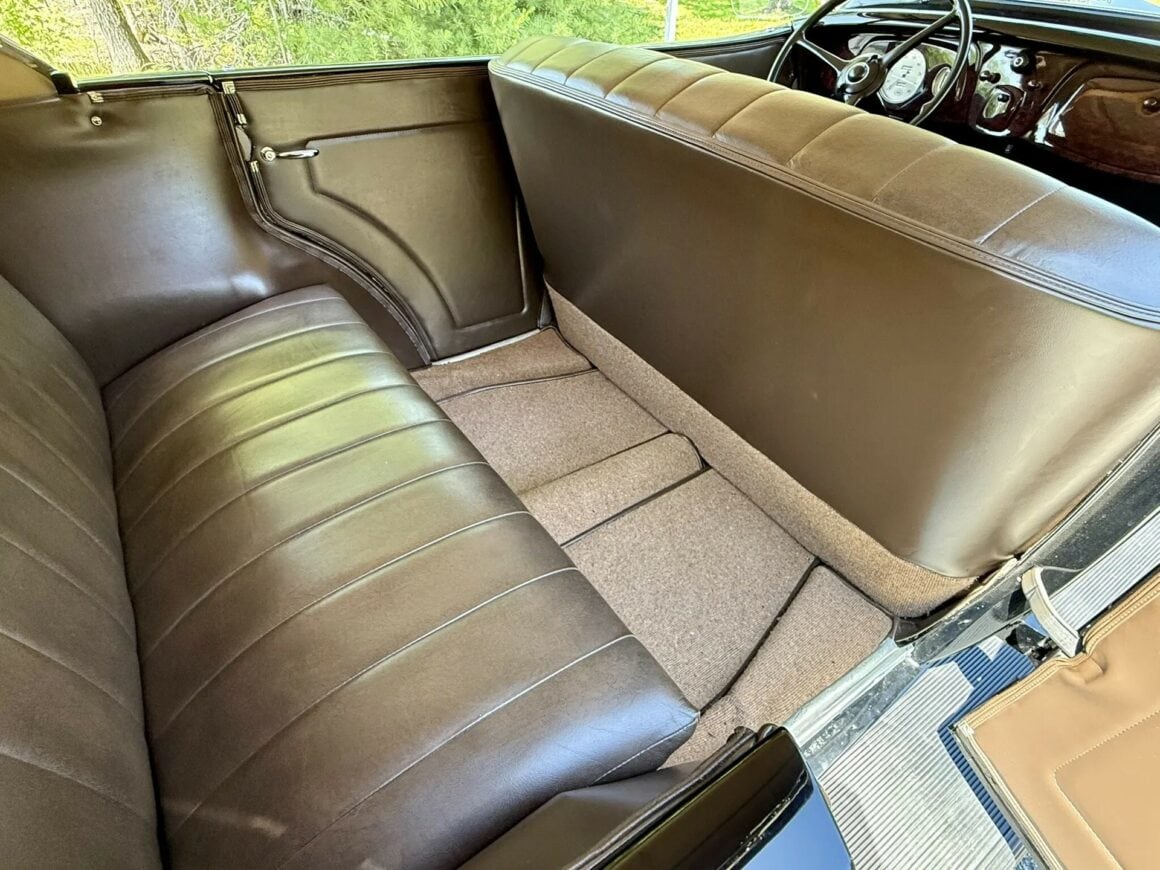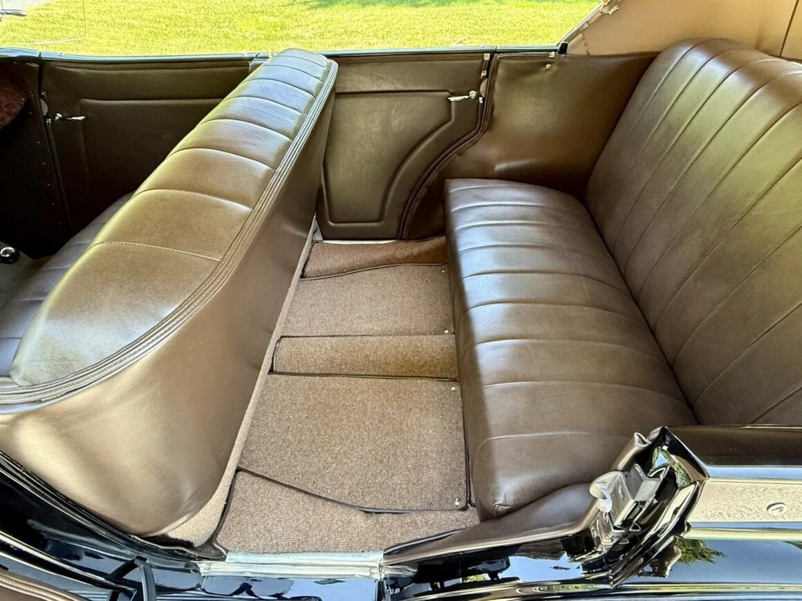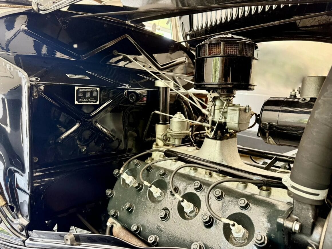 Tout dénote ici que l’acquéreur n’avait pas regardé à la dépense pour des compléments (garnitures) de luxe chromés, tels aussi des rares phares antibrouillard d’usine “King Fog” qui sont installés tout comme un mobilier intérieur et un tableau de bord en bois, des pare-chocs chromés, des feux de route chromés, les déjà cités anneaux d’enjoliveurs et un porte-bagages chromé, toutes pièces qui étaient en option... Le V8 Flathead 221-cu.in est malheureusement évalué à seulement 85 chevaux… Il a en effet été restauré selon les mêmes normes que pour la transmission manuelle à trois vitesses. Aucune modification n’a été apportée et aucun problème mécanique n’est donc signalé.