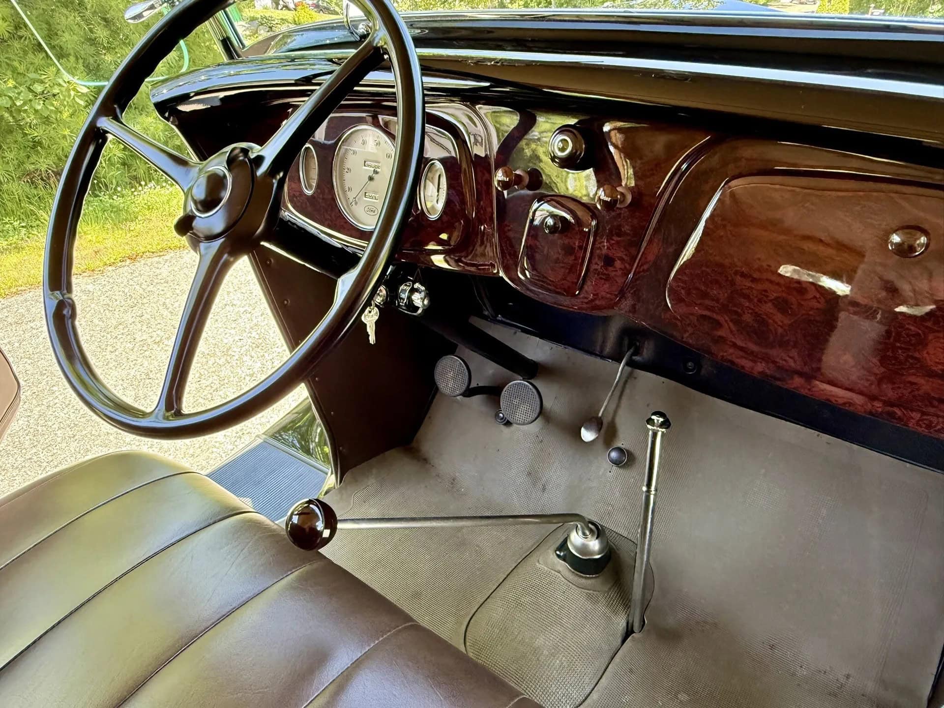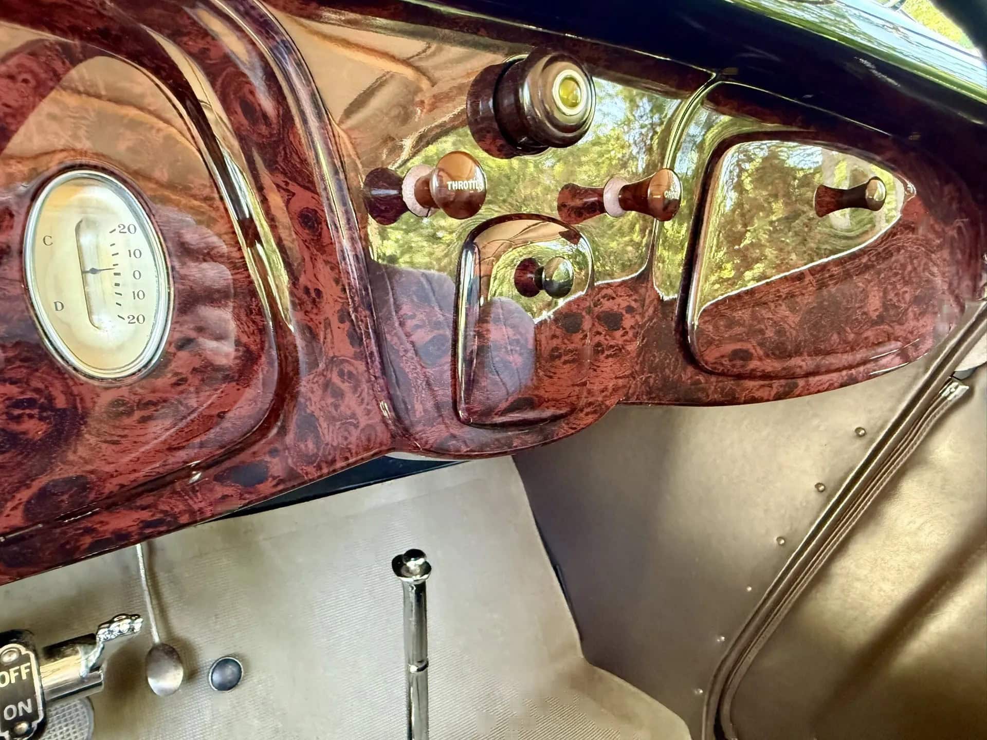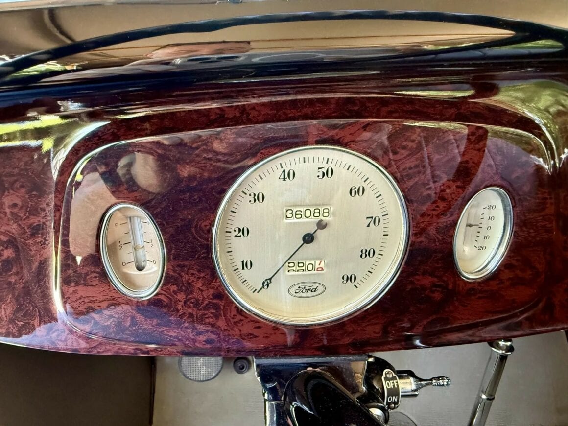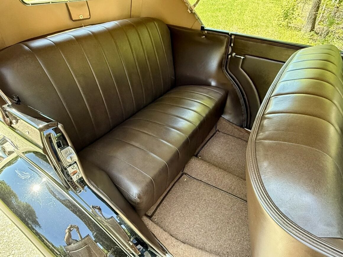 Tout dénote ici que l’acquéreur n’avait pas regardé à la dépense pour des compléments (garnitures) de luxe chromés, tels aussi des rares phares antibrouillard d’usine “King Fog” qui sont installés tout comme un mobilier intérieur et un tableau de bord en bois, des pare-chocs chromés, des feux de route chromés, les déjà cités anneaux d’enjoliveurs et un porte-bagages chromé, toutes pièces qui étaient en option... Le V8 Flathead 221-cu.in est malheureusement évalué à seulement 85 chevaux… Il a en effet été restauré selon les mêmes normes que pour la transmission manuelle à trois vitesses. Aucune modification n’a été apportée et aucun problème mécanique n’est donc signalé.