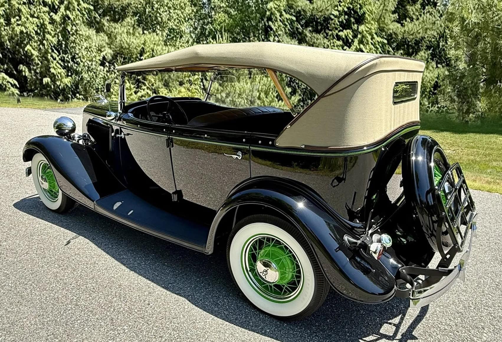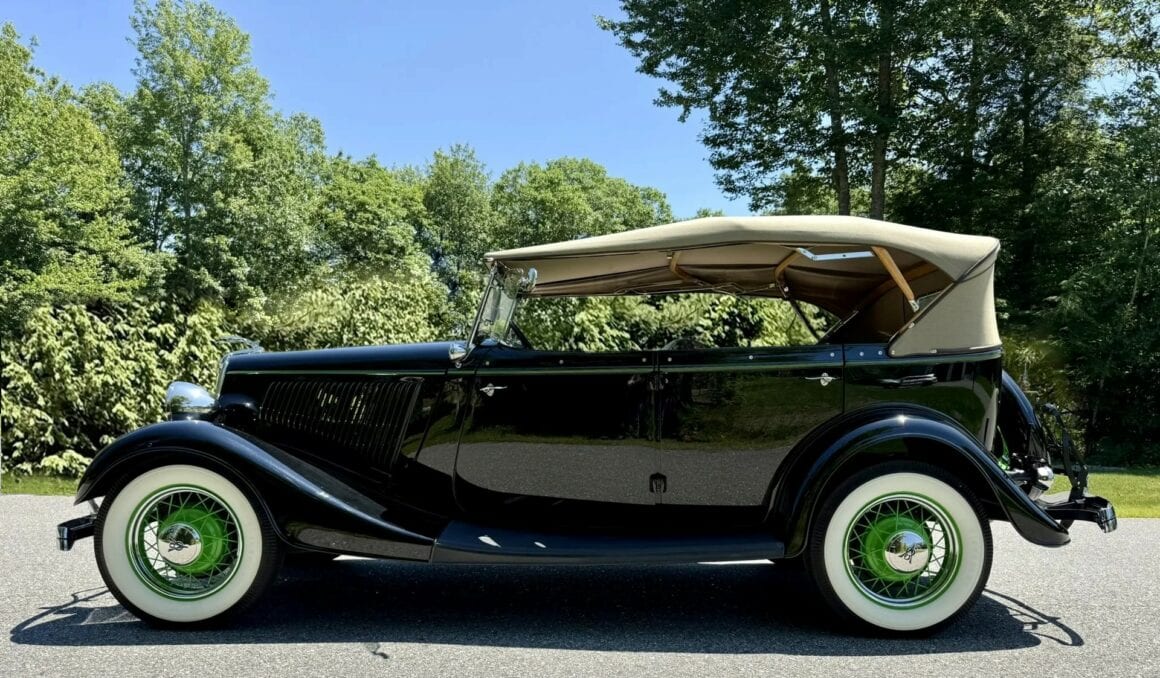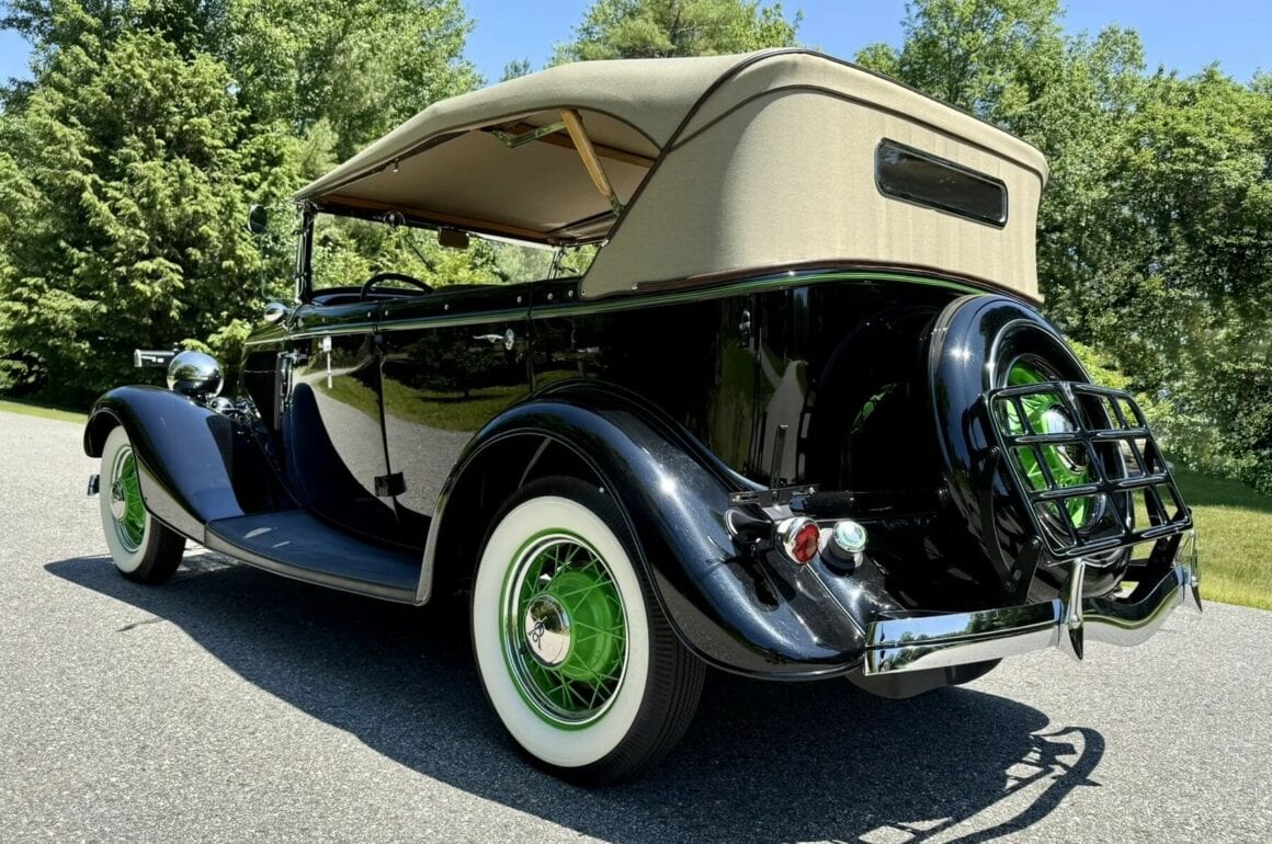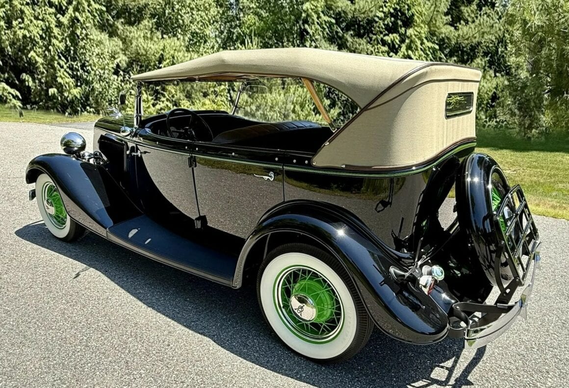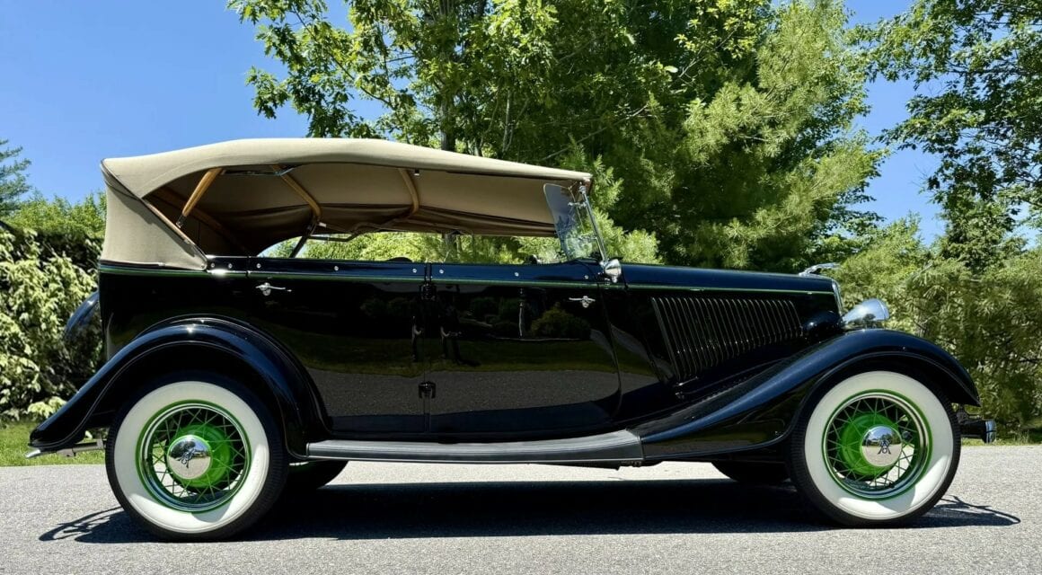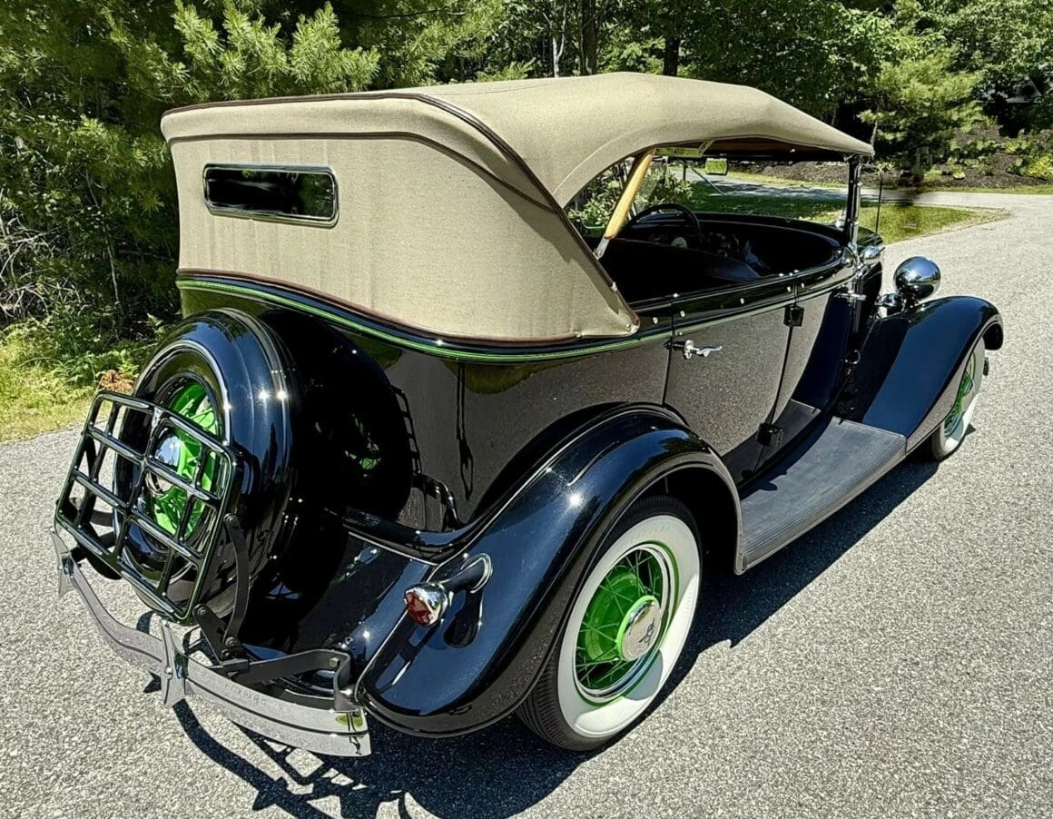 Rien ne vous empèche d’améliorer le contenu et d’emporter 300cv… L’engin est même livré avec une housse de protection-parking sur mesure fabriquée par “LeBaron Bonney”. Le “Title” (titre “propre” du Massachusetts) est “clean”. Cette Ford Deluxe Phaeton représente le haut de gamme de la gamme Ford de 1934 (à l’exception du coût plus élevé des Woodies). Le véhicule a été restauré par des professionnels selon des normes élevées et a été entretenu selon les mêmes normes depuis l’achèvement de la restauration en 2013. C’est une voiture à 100 points… Au cours de la dure année de la Grande Dépression de 1934, seules 3.128 Ford Deluxe Phaeton (et 373 Standard Phaeton) ont été vendues.