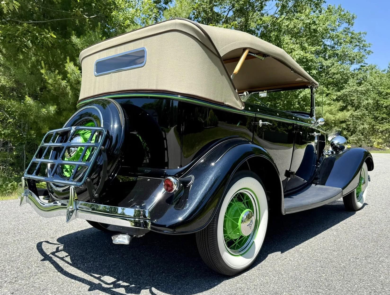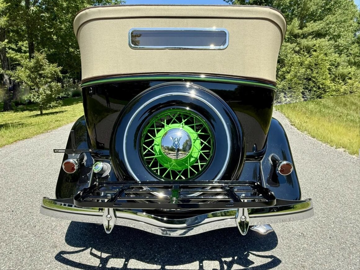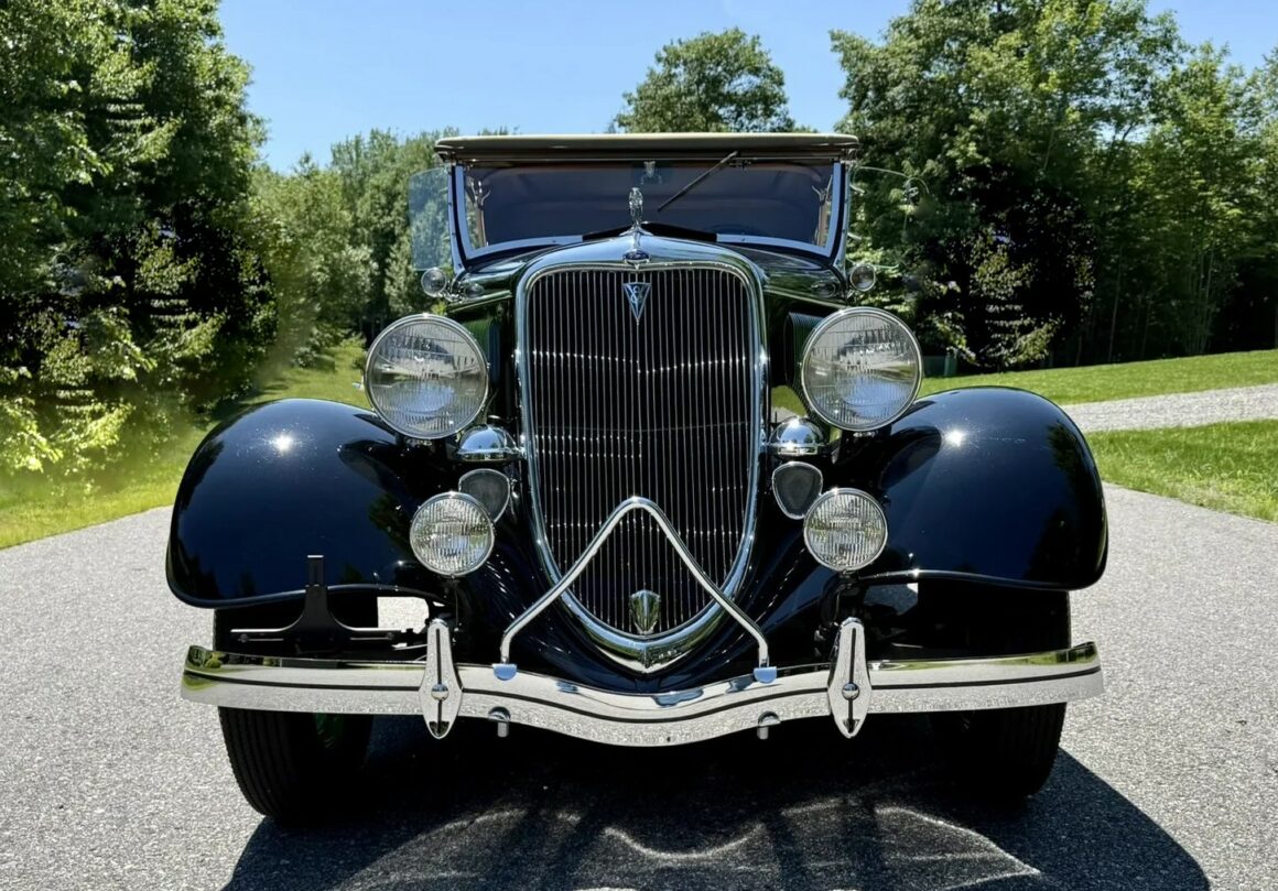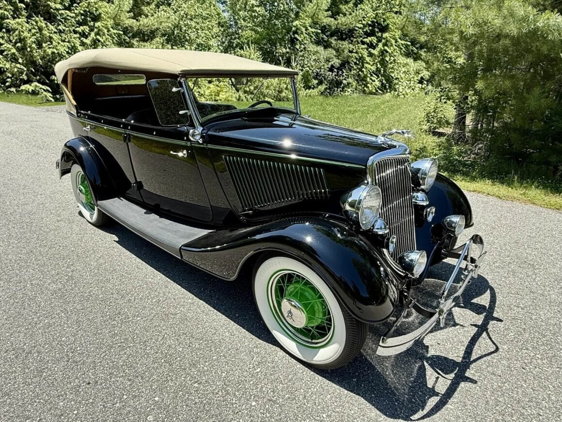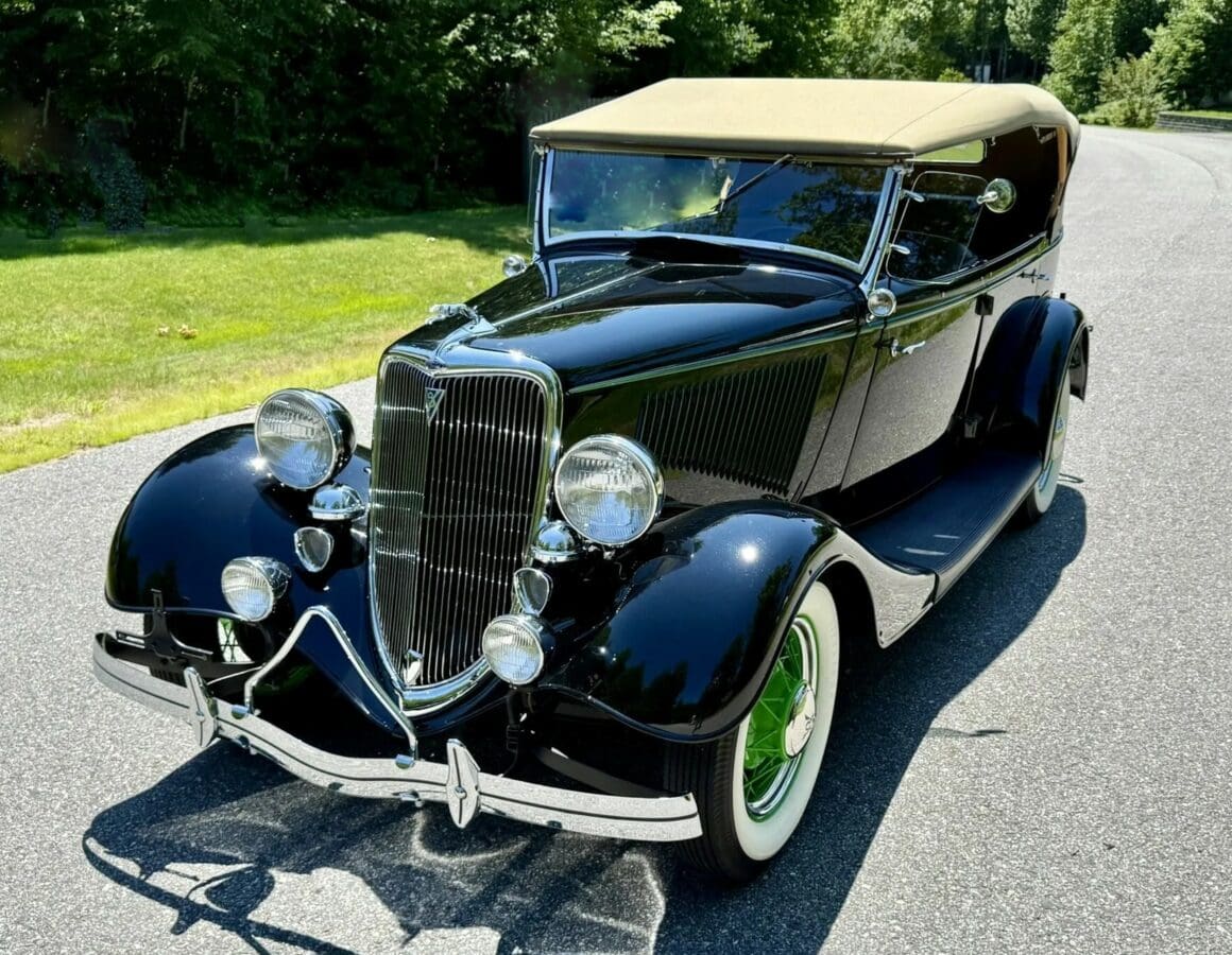 Rien ne vous empèche d’améliorer le contenu et d’emporter 300cv… L’engin est même livré avec une housse de protection-parking sur mesure fabriquée par “LeBaron Bonney”. Le “Title” (titre “propre” du Massachusetts) est “clean”. Cette Ford Deluxe Phaeton représente le haut de gamme de la gamme Ford de 1934 (à l’exception du coût plus élevé des Woodies). Le véhicule a été restauré par des professionnels selon des normes élevées et a été entretenu selon les mêmes normes depuis l’achèvement de la restauration en 2013. C’est une voiture à 100 points… Au cours de la dure année de la Grande Dépression de 1934, seules 3.128 Ford Deluxe Phaeton (et 373 Standard Phaeton) ont été vendues.