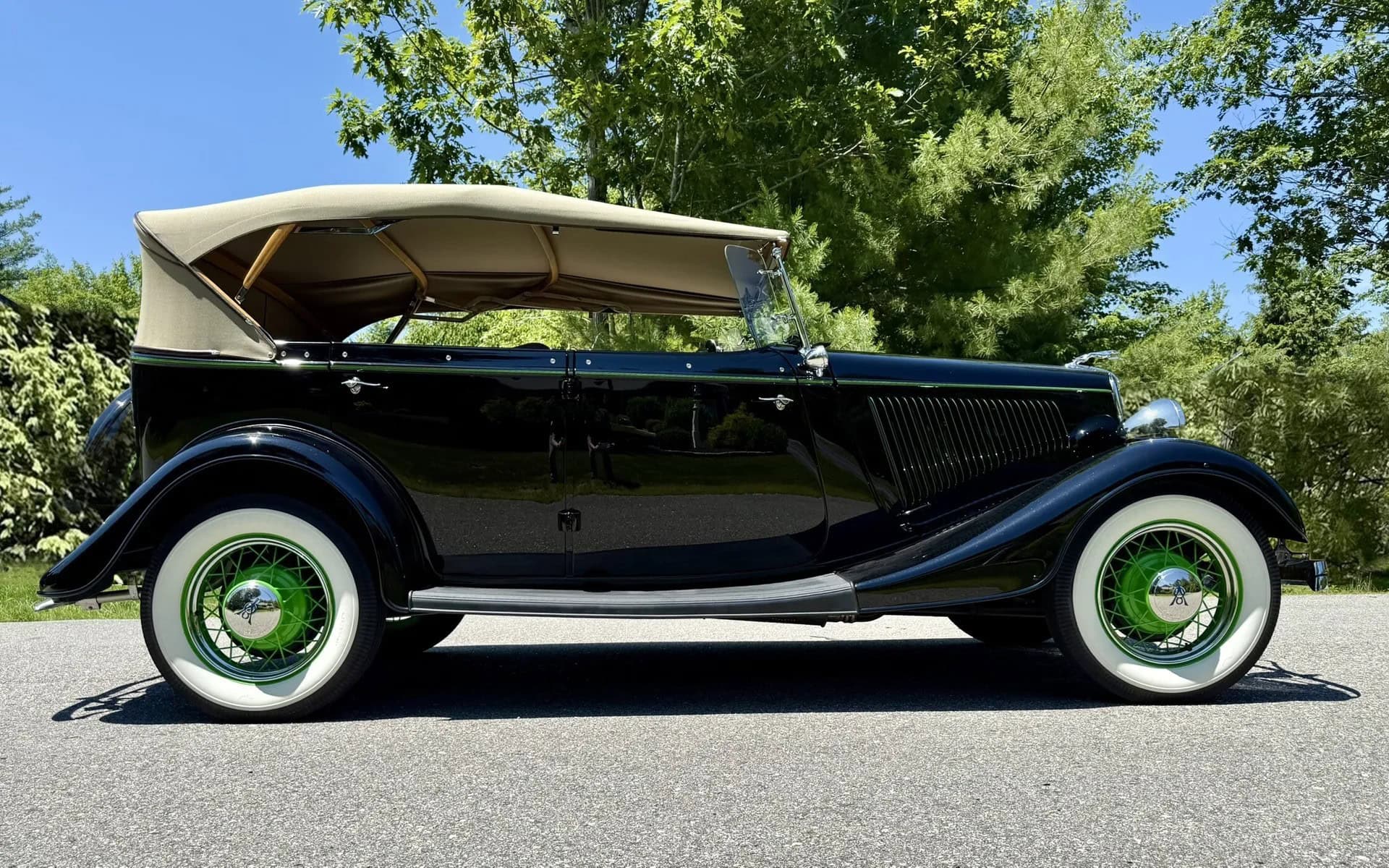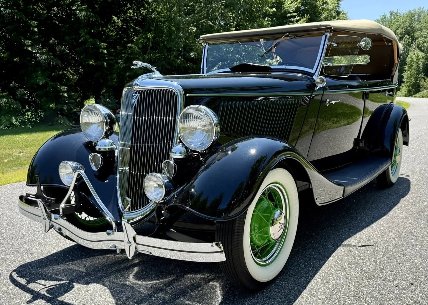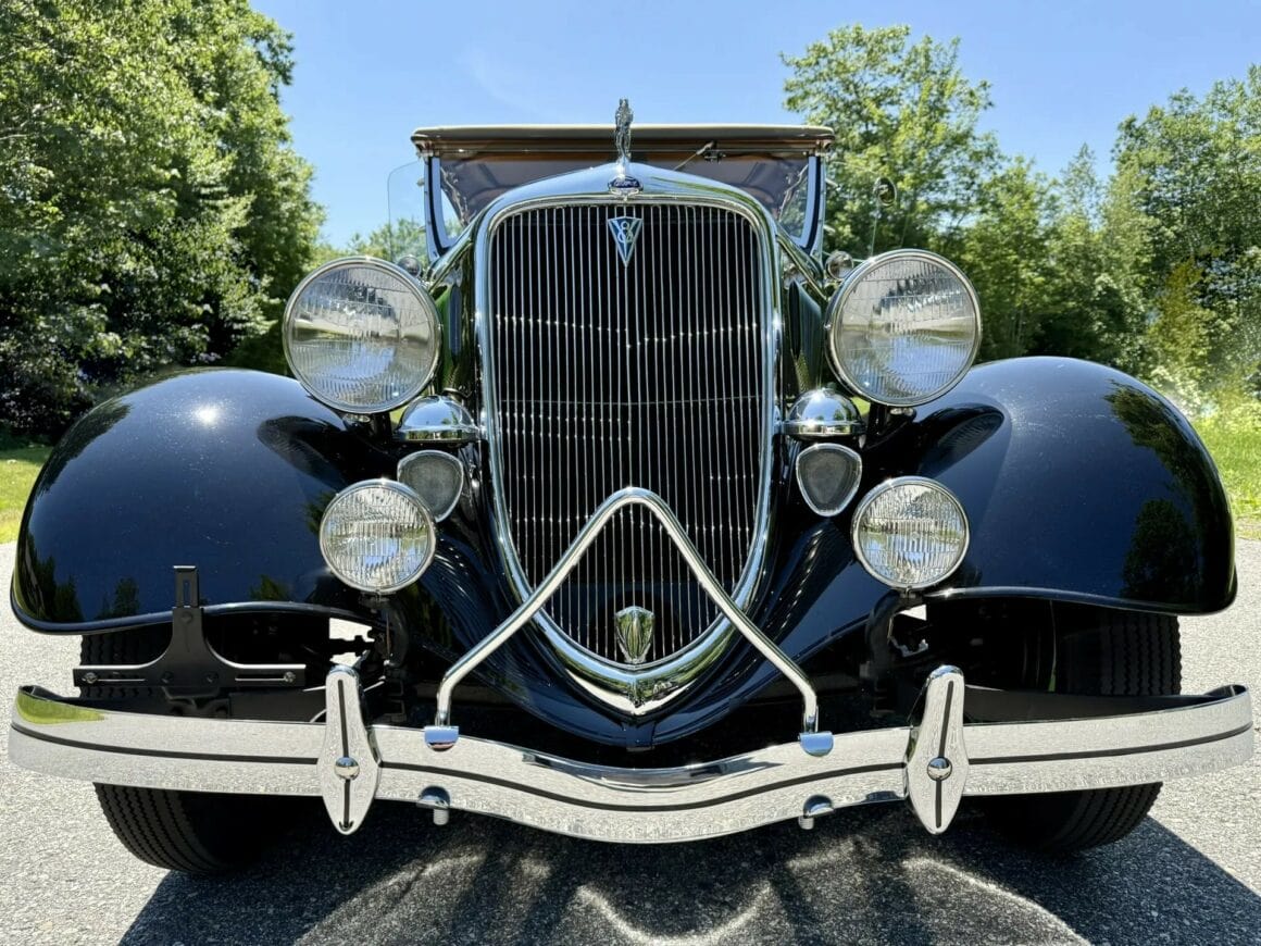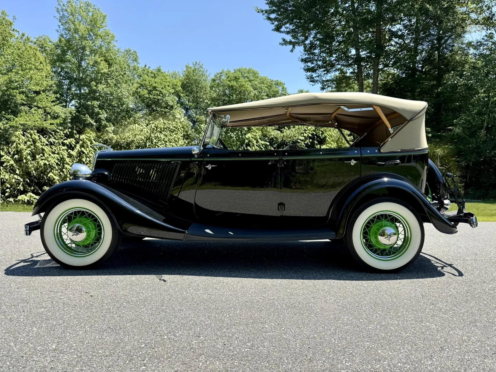 Rien ne vous empèche d’améliorer le contenu et d’emporter 300cv… L’engin est même livré avec une housse de protection-parking sur mesure fabriquée par “LeBaron Bonney”. Le “Title” (titre “propre” du Massachusetts) est “clean”. Cette Ford Deluxe Phaeton représente le haut de gamme de la gamme Ford de 1934 (à l’exception du coût plus élevé des Woodies). Le véhicule a été restauré par des professionnels selon des normes élevées et a été entretenu selon les mêmes normes depuis l’achèvement de la restauration en 2013. C’est une voiture à 100 points… Au cours de la dure année de la Grande Dépression de 1934, seules 3.128 Ford Deluxe Phaeton (et 373 Standard Phaeton) ont été vendues.