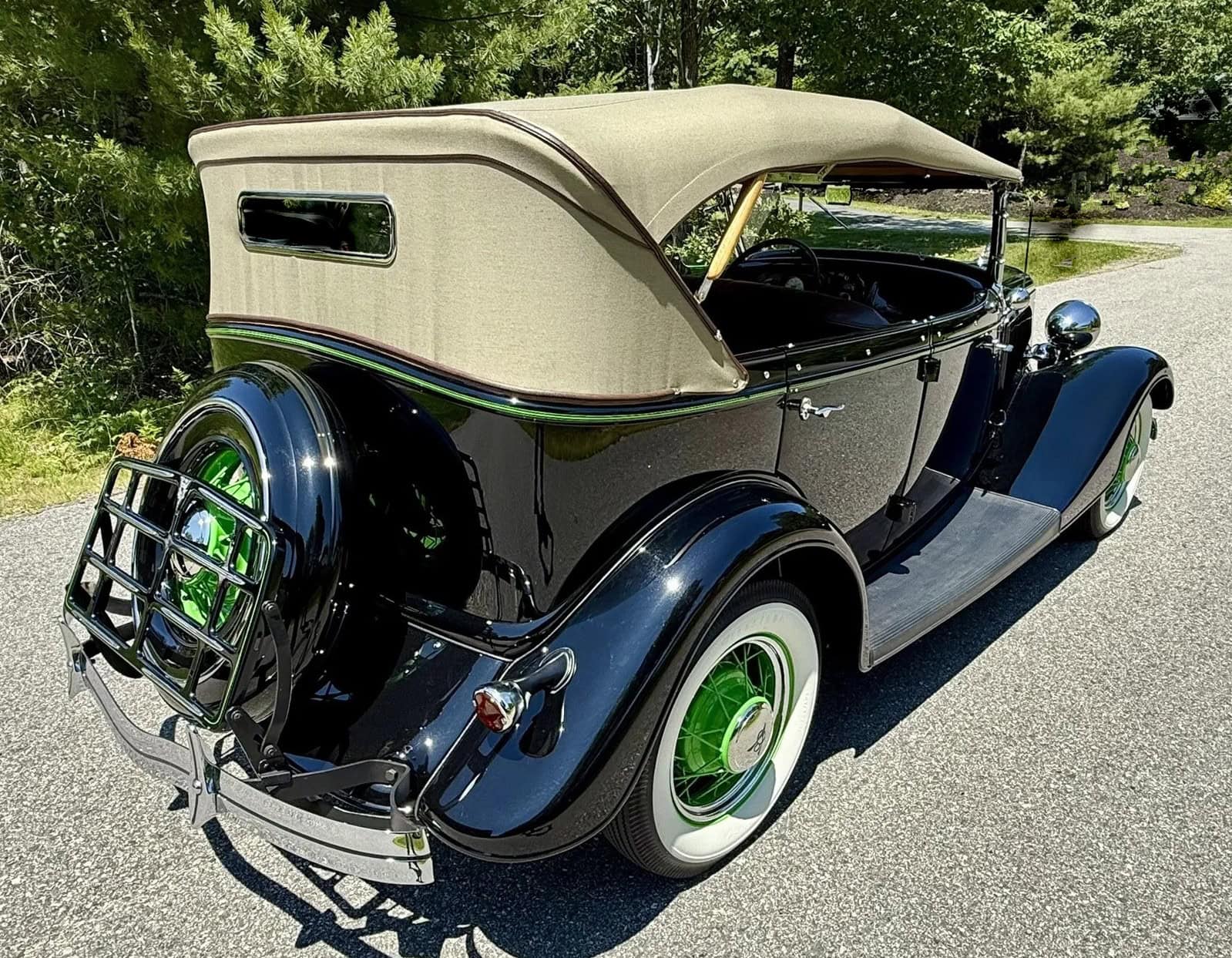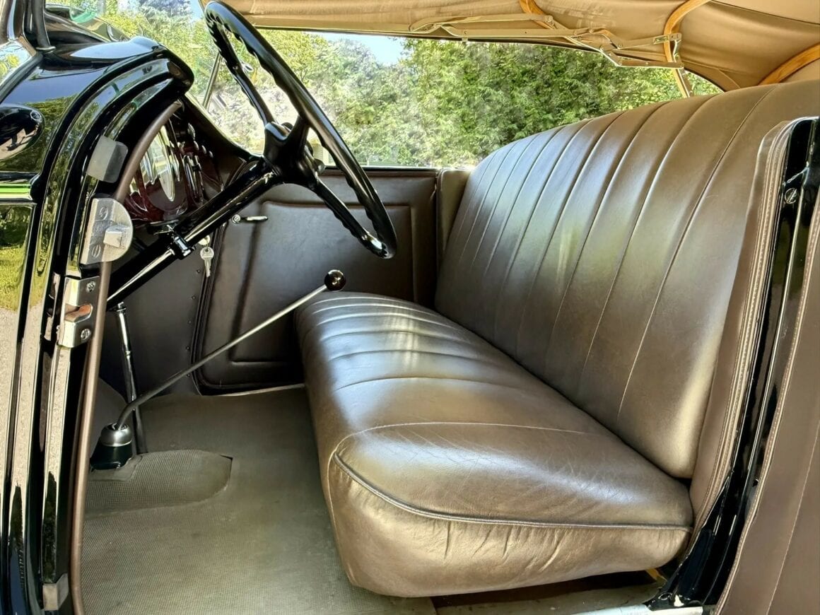Alléchant pour qui sait en plus aligner les euros qui couvriront sans surprise le transport, les taxes et le voyage A/Rpour s’assurer que tout est OK ! Dans ce cas, là, comme pour le Boss du film Jurassic-Parc version Spielberg, vous pourrez plastronner en affirmant : “Aucune dépense n’a été épargnée”, dans la restauration, qui a été en finale exécutée dans le même noir d’origine avec des jantes couleur vert pomme comme d’origine, un intérieur en cuir brun foncé de meilleure facture mais comme d’origine du début de 1934 et un toit en toile vert clair T 14, tous deux produits par la société “LeBaron Bonney” et installés par leur propre artisan, comme d’origine… Je vous sens jubilatoires, mes Popu’s…