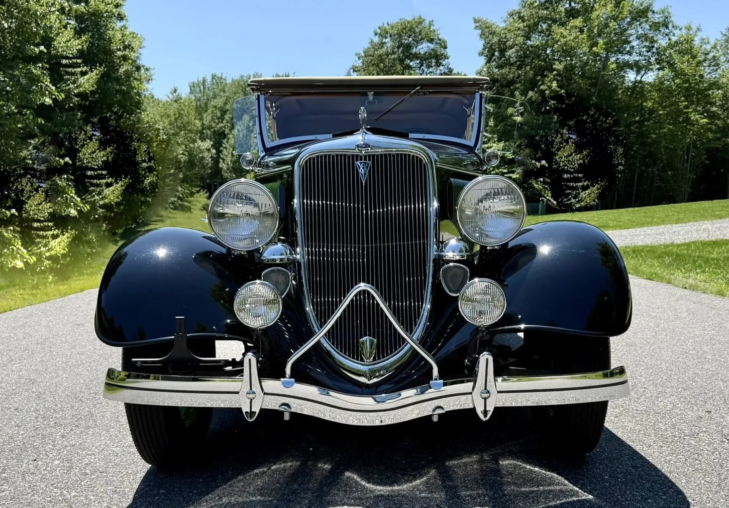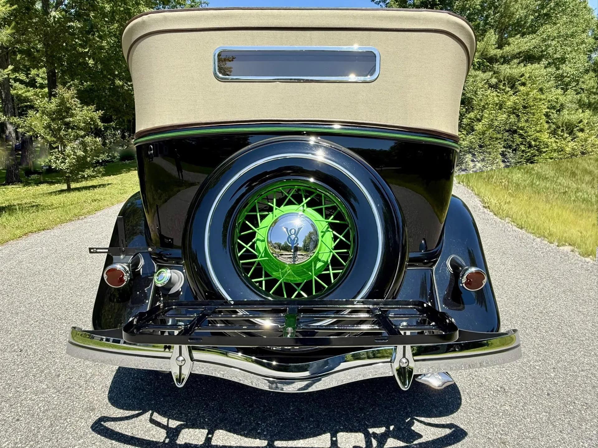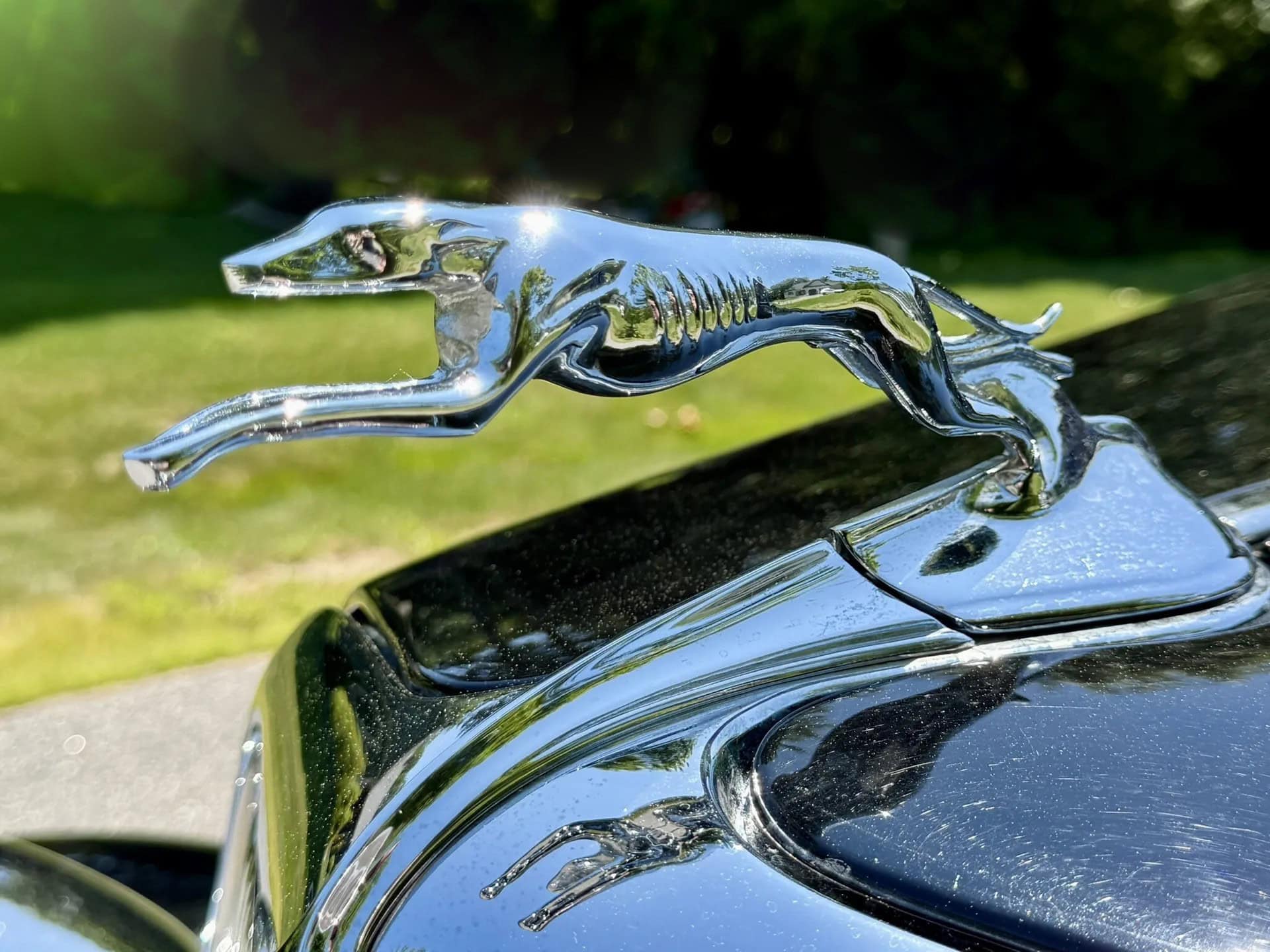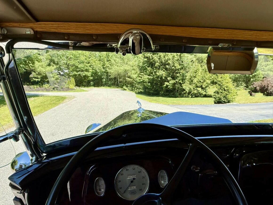 Les options d’usine incluses dans la restauration comprennent des protections chromées de pare-chocs chromés, des feux de route chromés, les anneaux-enjoliveurs des pourtours de jantes chromées et un porte-bagages rabattable chromé, ainsi que le rare ornement de radiateur “Greyhound” très rare et désirable ainsi que chromé… En anglais, c’est : “Why Not a lot of Chromes ?”… Croyez-moi bien qu’avec son V8 221ci Flathead, c’est le TOP du Top que d’y rouler sans problème ni mécanique ni d’usage administratif… Le pourtour du pare-brise est chromé, il y a des klaxons doubles chromés, des phares chromés qui savent éclairer la route et les feux arrière chromés qui à l’époque n’étaient pas obligatoires…
