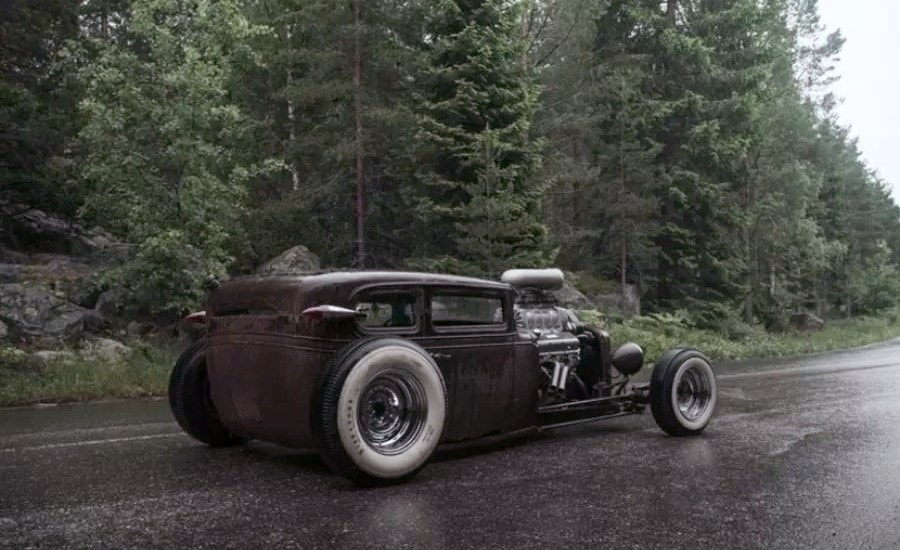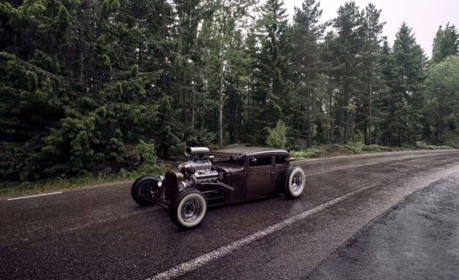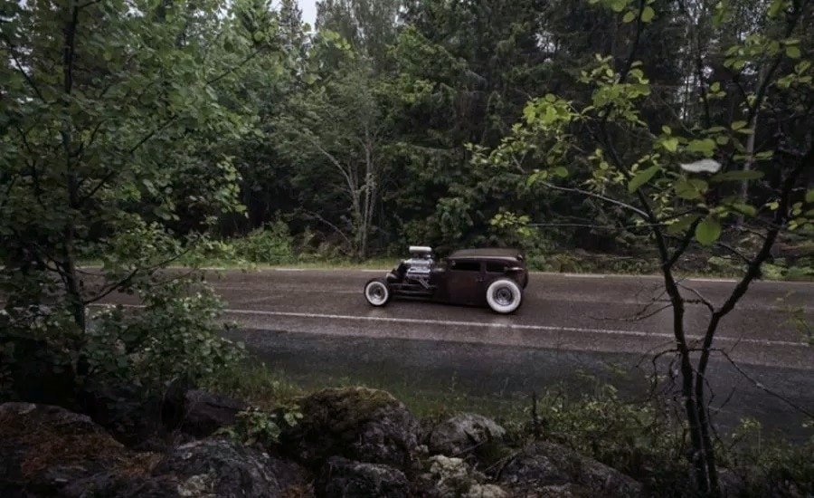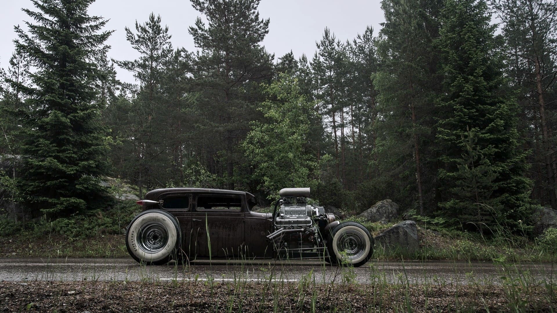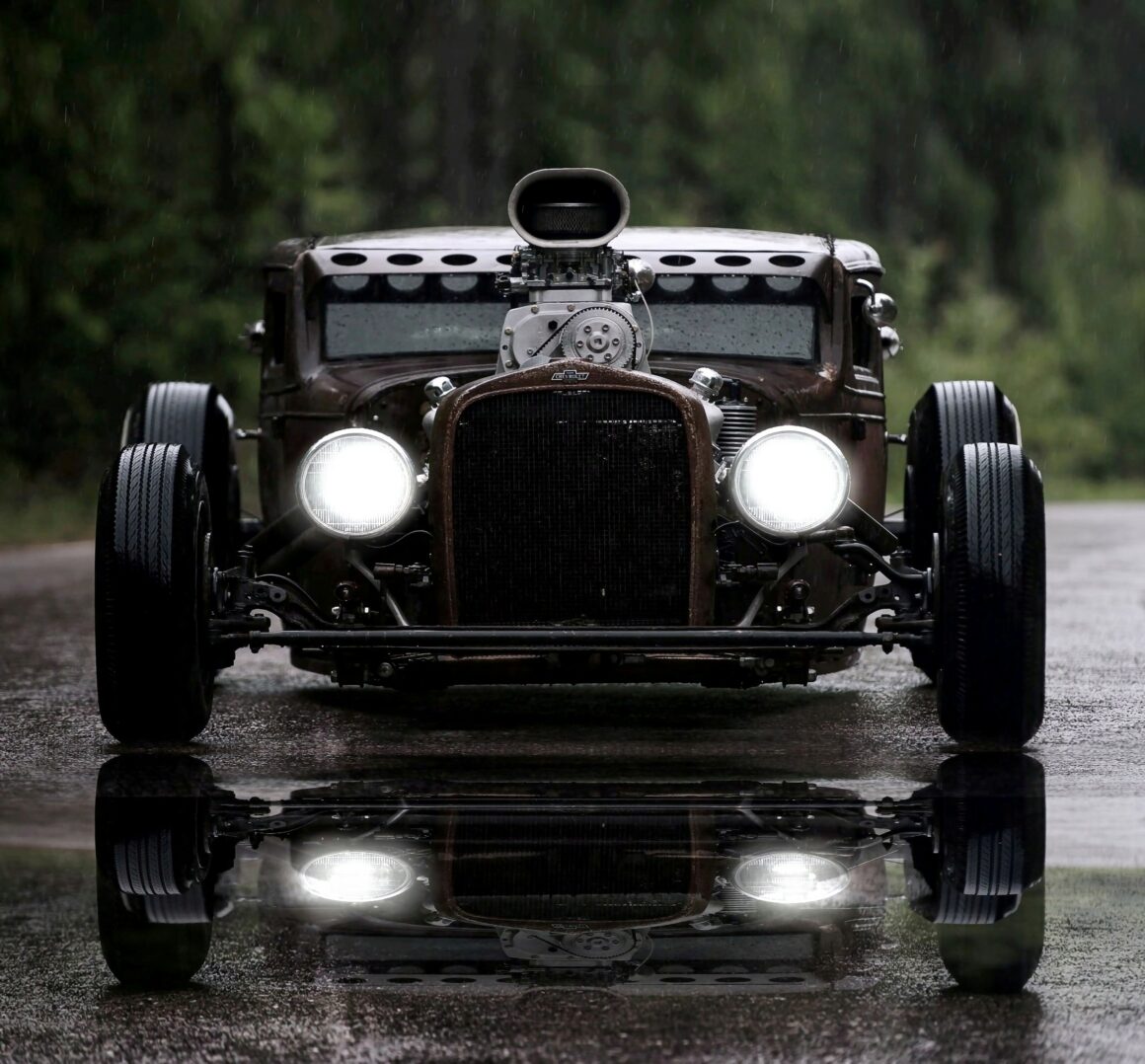 La Chevrolet AE Independence 1931 remplaçait l’AD Universal de 1930… Comme intro, c’est basique, con et logique. A cause de la Grande Dépression, la production a chuté d’environ 8% pour s’établir à 619.554 voitures, mais alors que la production de Ford chutait de près des deux tiers, Chevrolet a repris la première place du tableau des ventes de voitures américaines. Le principal changement entre les Series AE et AD (sortante) était l’augmentation de l’empattement à 2.768,6 mm. Elle restait motorisée du six cylindres “Stovebolt Six” de 3.180 cm3, produisant 50cv (37 kW) et pouvait atteindre une vitesse de pointe de 137km/h. Généralement les Hot Rodders s’efforcent que tout soit absolument parfait pour une séance photo, mais cette Rusty Demon Independence étant une oeuvre artistique selon son créateur Viking-Suédois Emmanuel Odin Sandén, la séance photo de son Rat Rod devait impérativement se dérouler dans la grisaille et la pluie… Si je devais choisir une séance photo et faire pleuvoir au moment des shot’s, ce serait cool.