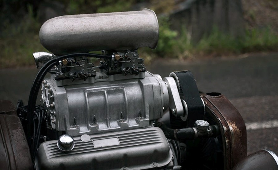 Quel hasard que le ciel s’est ouvert à l’instant où l’appareil photo a pointé son objectif sur son œuvre d’art afin de l’immortaliser… Emanuel Odin Sandén vit le plus “crasseusement” possible dans son garage/atelier à moitié effondré au fond d’un marécage. C’est une vraie réalité, pas quelque chose de faux au nom du style. Il s’est empressé de me souligner qu’il n’avait pas voulu réaliser un Rat Rod mais une œuvre d’art Viking contemporaine roulante affichant ouvertement quel est l’état du monde en juxtaposition avec la guerre en Ukraine qui impacte les pays voisins et alliés de force dans un OTAN dégénéré. Son œuvre d’art “dégérationnelle” a été réalisée au départ de l’épave d’une Chevrolet Independence de 1931 dans laquelle il a placé un V8 Big Block de 540ci équipé d’un Blower Dyers 8-71 de camion GMC. Deux carbus 4 corps déversent le carburant à profusion à hauteur de 800cv… Les chiffres donnés sont aussi flous que l’est Emmanuel Odin Sandén, il sait juste que cela est impressionnant.