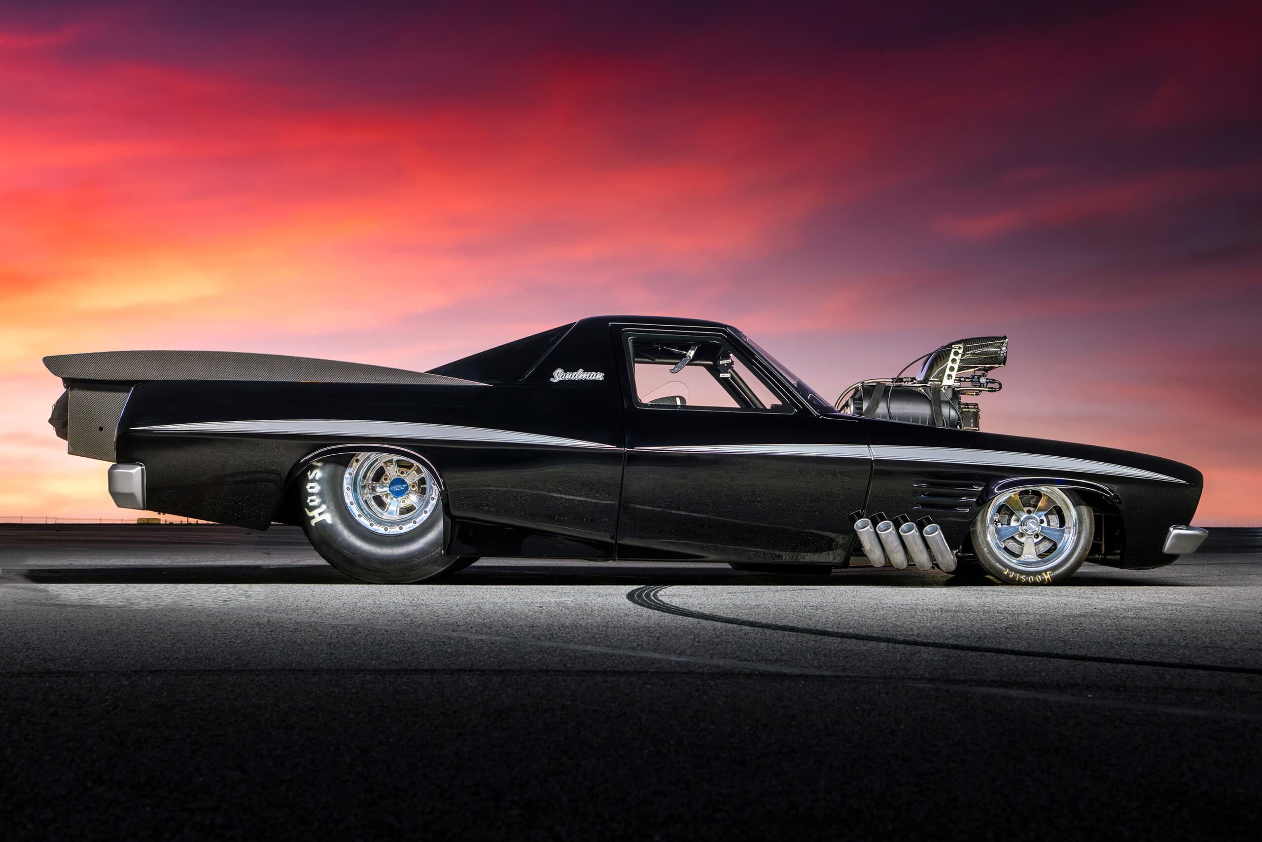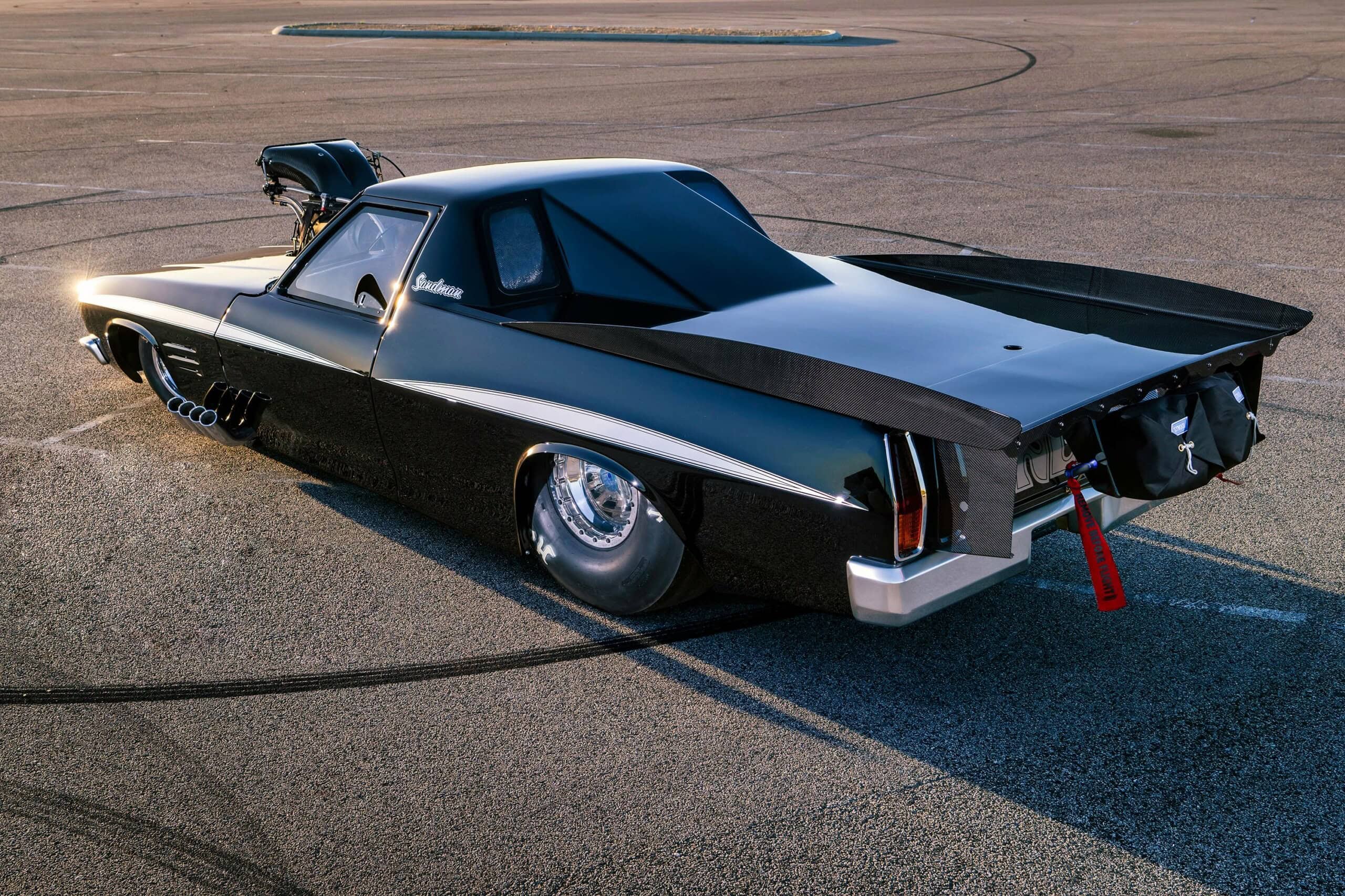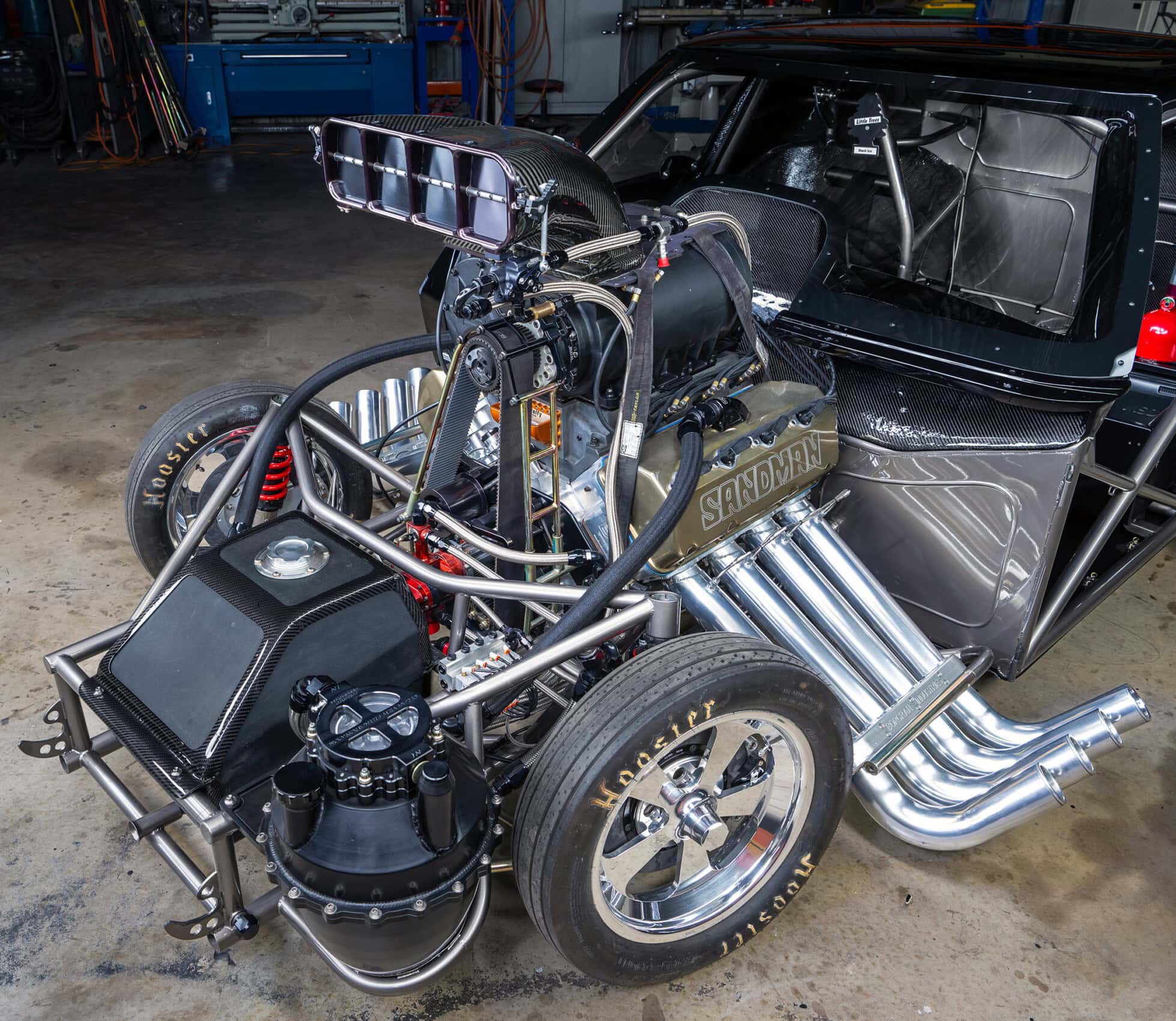 Le blower à vis PSI 206D est surmonté d’un chapeau en fibre de carbone Jeff Burnett et d’un système d’injection conçu par Greg Gower, le moteur produisant entre 4000 et 5.000cv pour fonctionner dans les 5,80…lui permettant de jouer et gagner… L’ensemble du clip avant se détache en quelques secondes, révélant la magnifique billette Brad Anderson Enterprises Hemi. Boris a spécialement commandé les cache-culbuteurs avec des dessus vierges, afin qu’il puisse y graver le logo Sandman CNC par ProWest Engineering…La transmission est une boîte à trois vitesses B&J attachée à un convertisseur Ty-Drive, qui contrôle le verrouillage Neal Chance. Au-dessus se trouvent les huit packs de bobines MSD qui remplacent la magnéto…