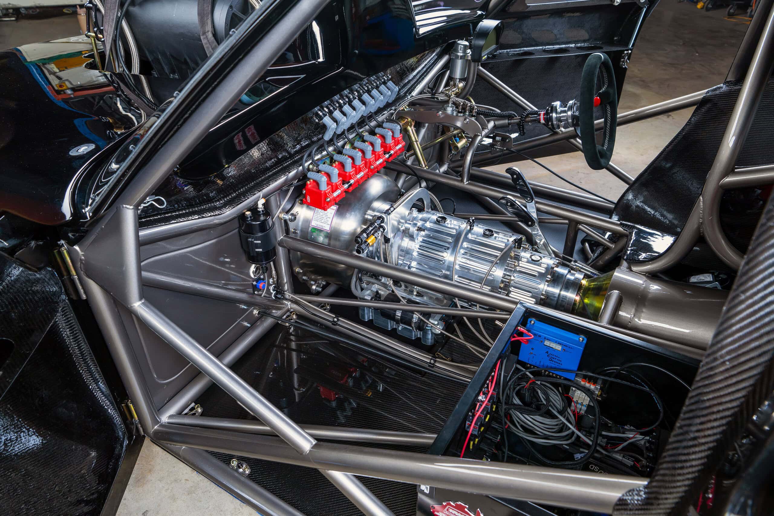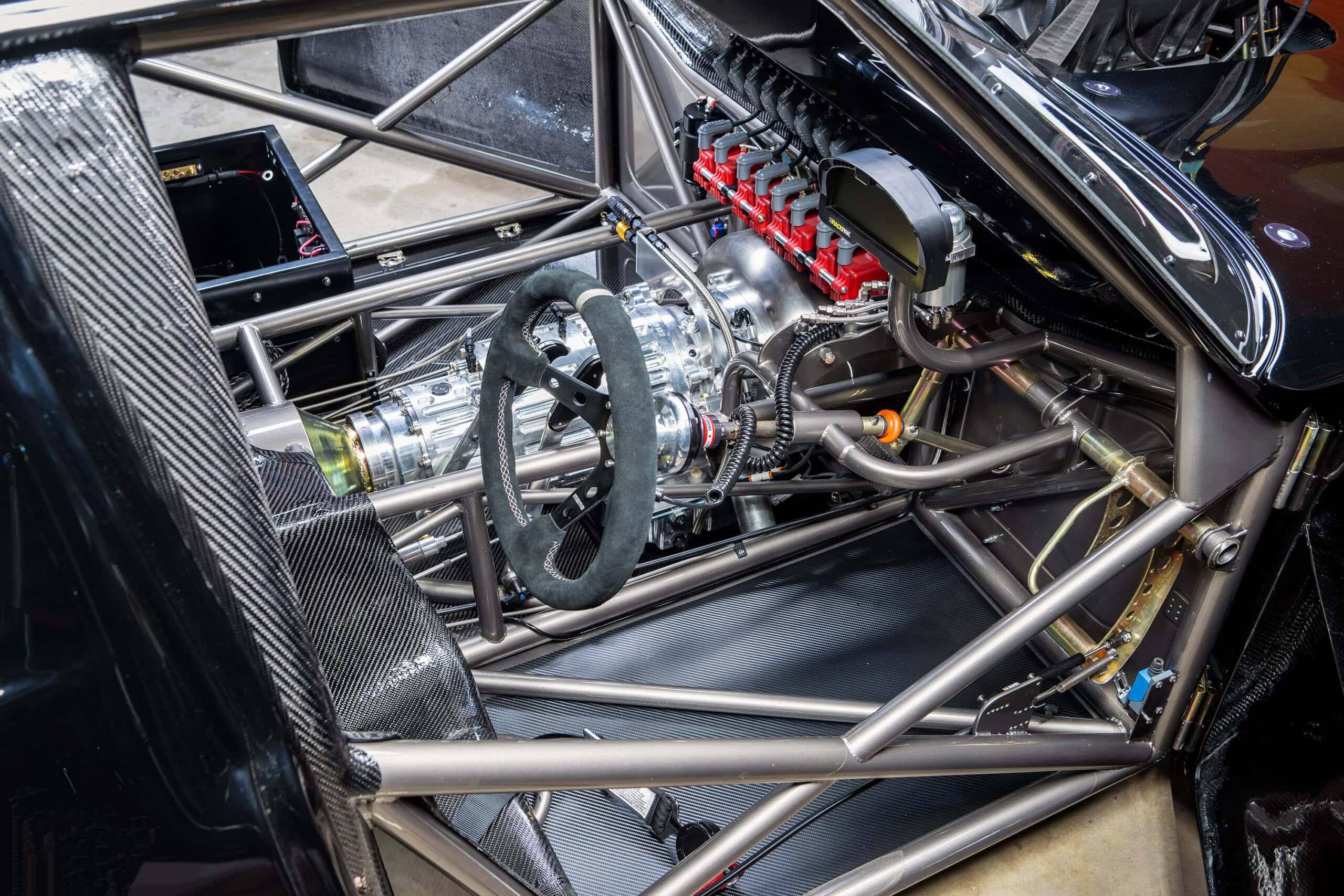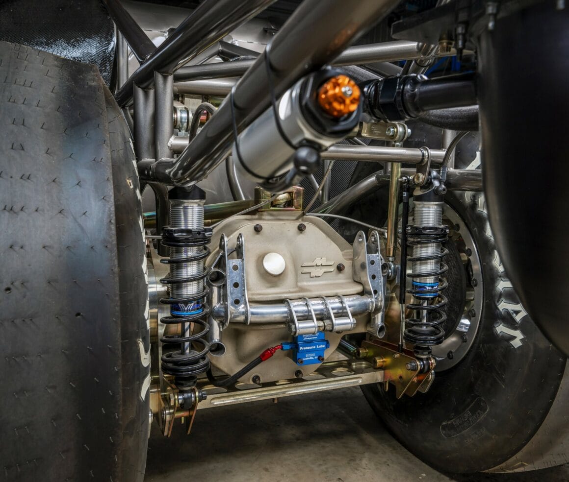 En résumé, le V8 est un 491ci BAE Hemi, le Blower est un PSI-D BAE-6, vannes Victory 2,40 pouces (int), 1,90 pouces (exh). Les pistons sont des Carrillo, l’allumage est un MSD PRO 600 CDI. La boîte de vitesse est uneB&J à trois vitesses avec Ty-Drive, boîtier en titane BOHR Racing Products, le convertisseur est un Neal Chance. La direction pignon/crémaillère est de chez Stiletto. Les freins sont à deux pistons avec disques en fibre de carbone , étriers à quatre pistons et disques en fibre de carbone. Les jantes sont des Mickey Thompson avec montage sur broche 15×3,5 (AV), Pro 5 ET Drag 16×16 (AR). Les pneus sont des Hoosier; 23×5-15 (AV), et 17×36-16 (AR)…