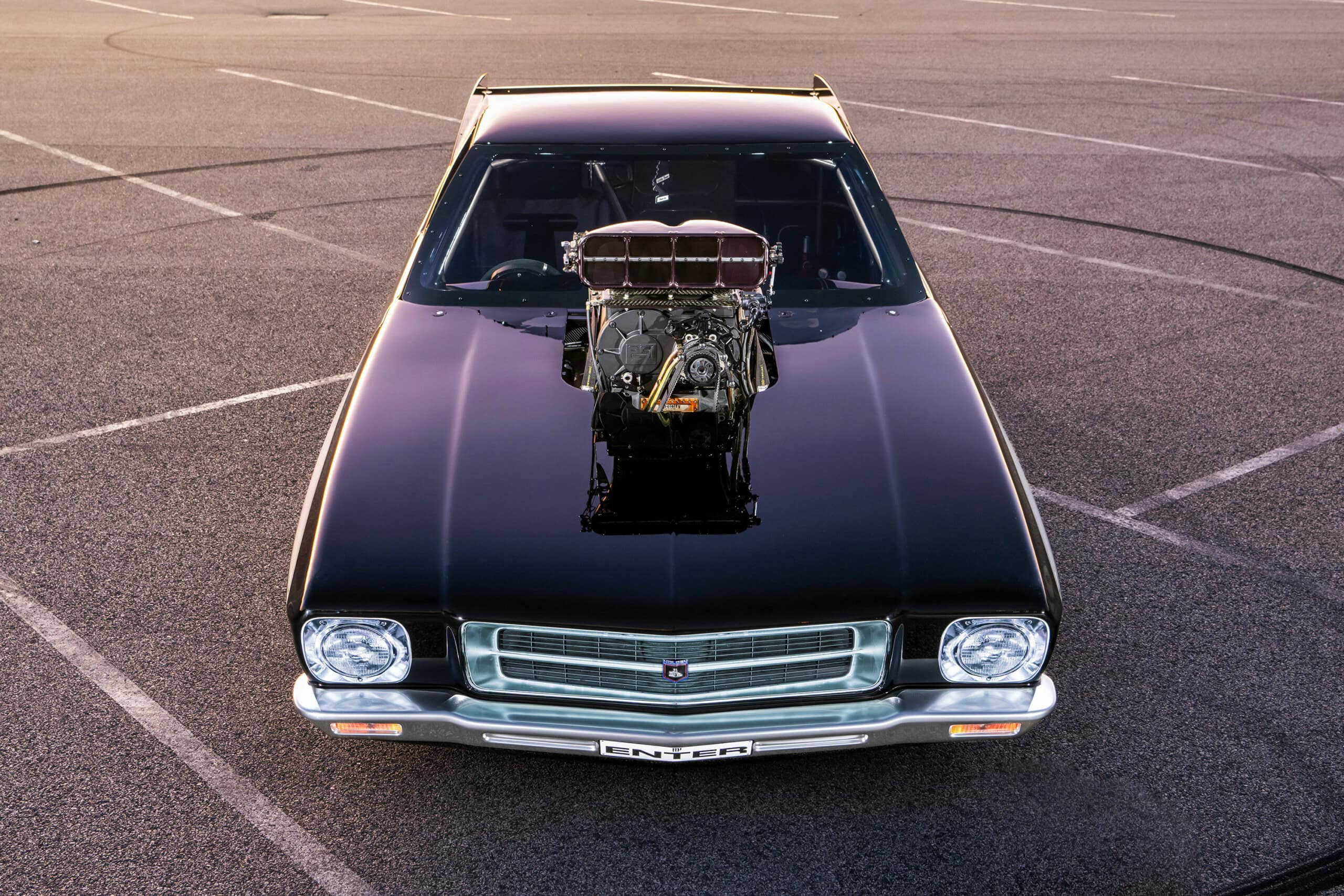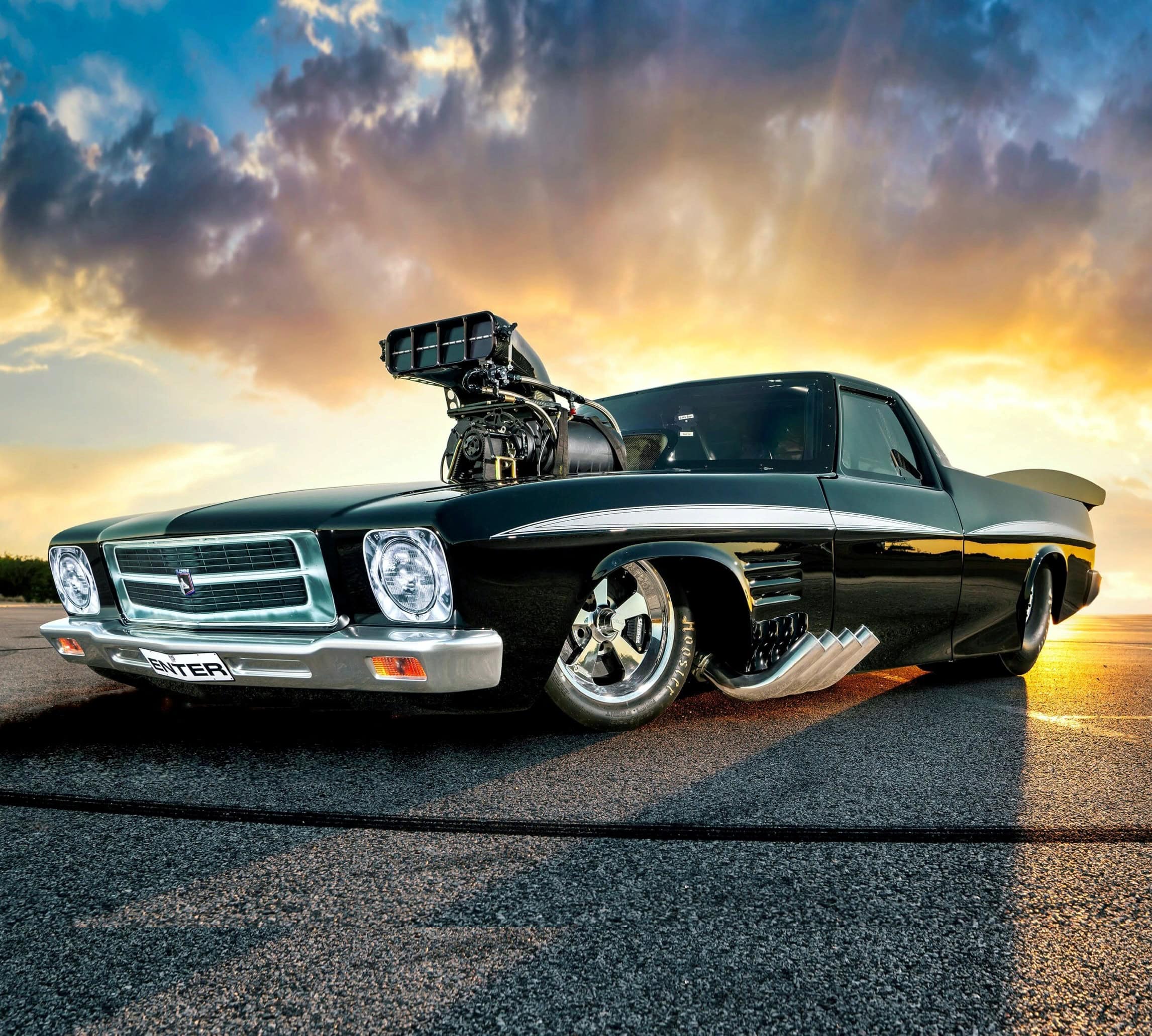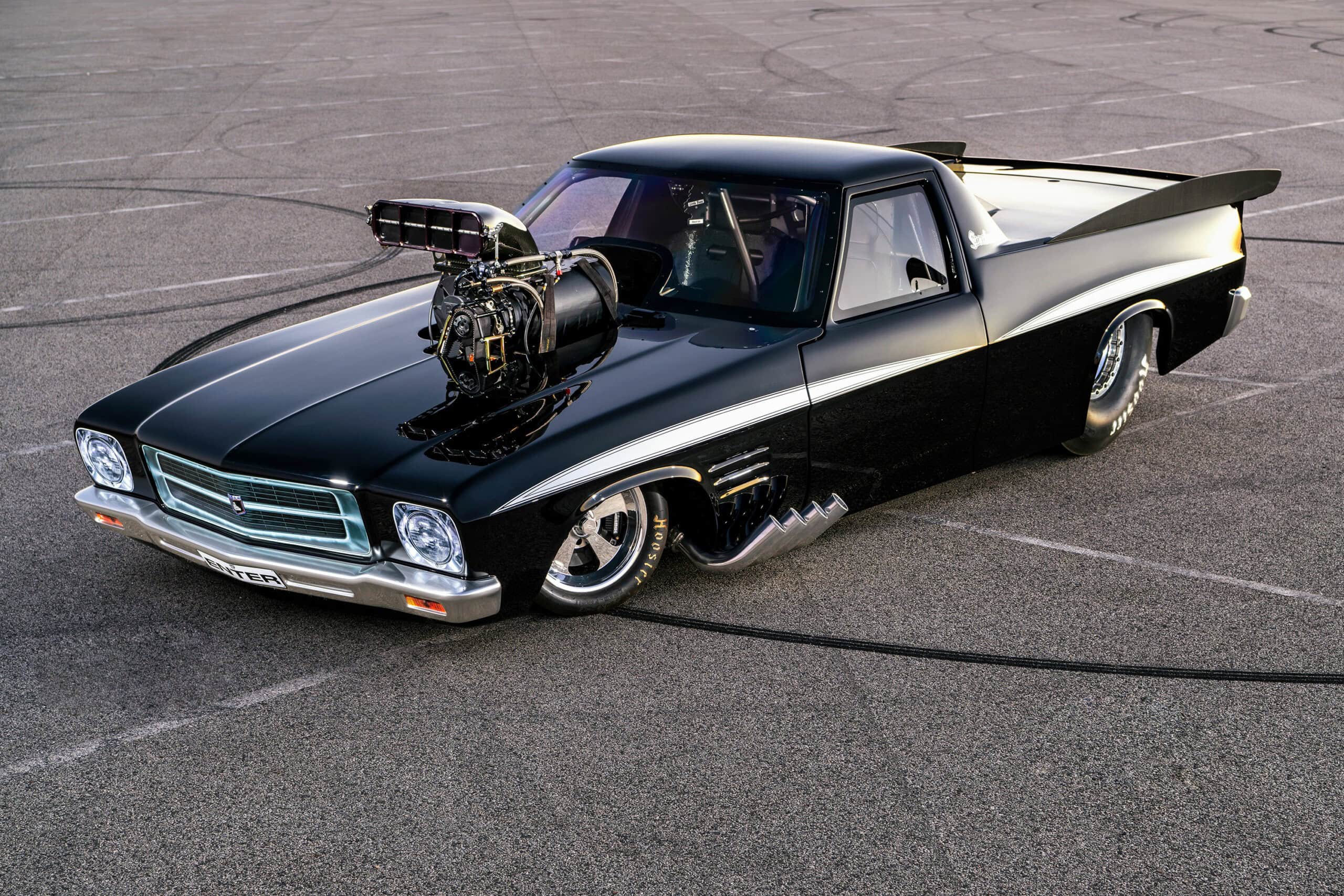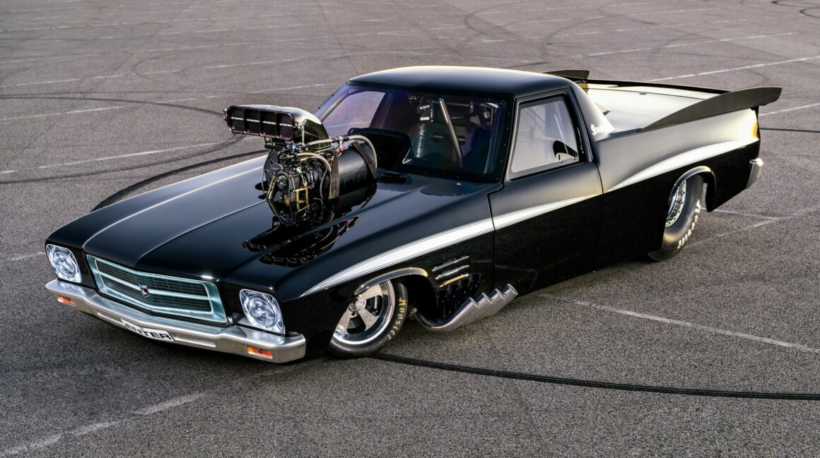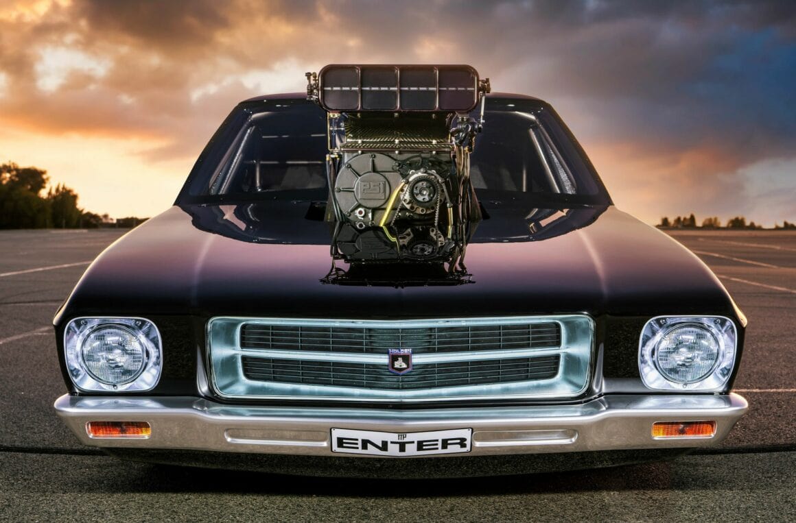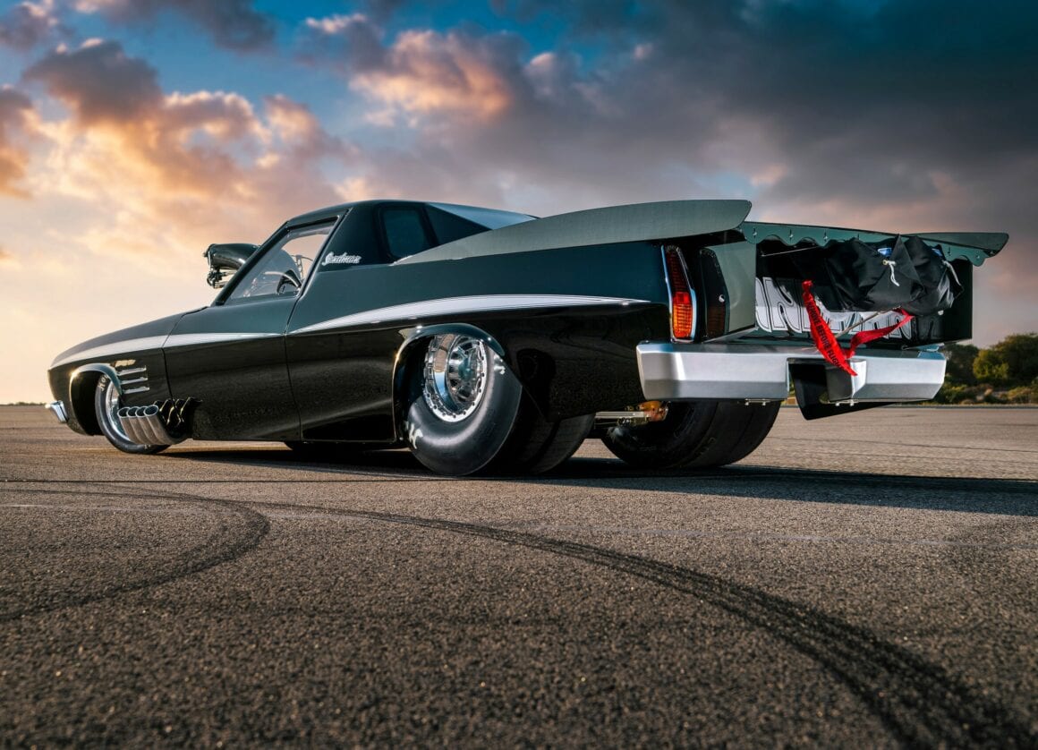 La première est que la carrosserie est en carbone nu, ce qui donne juste ce qu’il faut de contraste pour mettre en valeur les lignes de lutte de la forme générale. De profil, elle a l’air proche du stock, jusqu’à ce que vous arriviez au pare-brise, puis c’est la fête ! Tout d’abord, il s’agit d’une voiture magnifiquement réalisée puis présentée avec une fabrication vraiment époustouflante, quoique créée dans un sordide hangar d’arrière-cour. OK, le hangar est peut-être un peu plus étrange que la moyenne, et il y a dedans une cabine de peinture complète, mais c’est dans le jardin de Boris… L’inspiration derrière cette construction était quasi raciste, une HQ noire qu’il a rachetée à son père pour 2.600 $ Australiens…