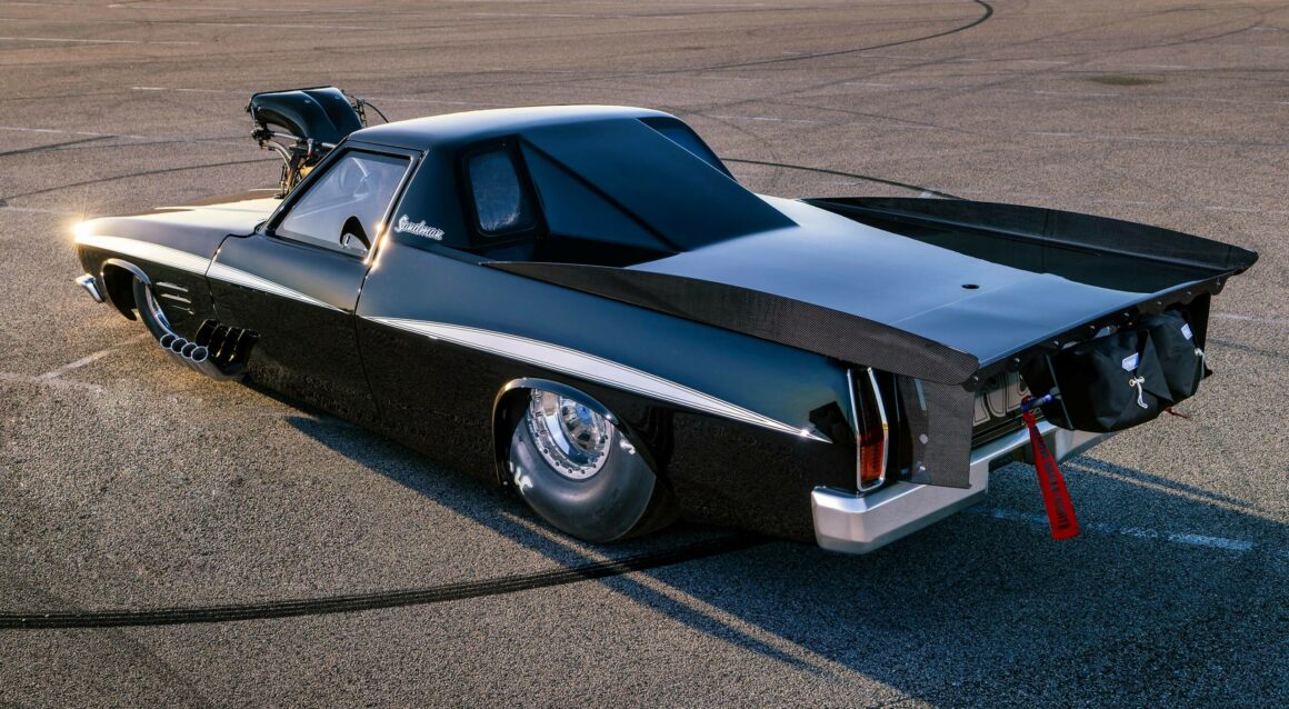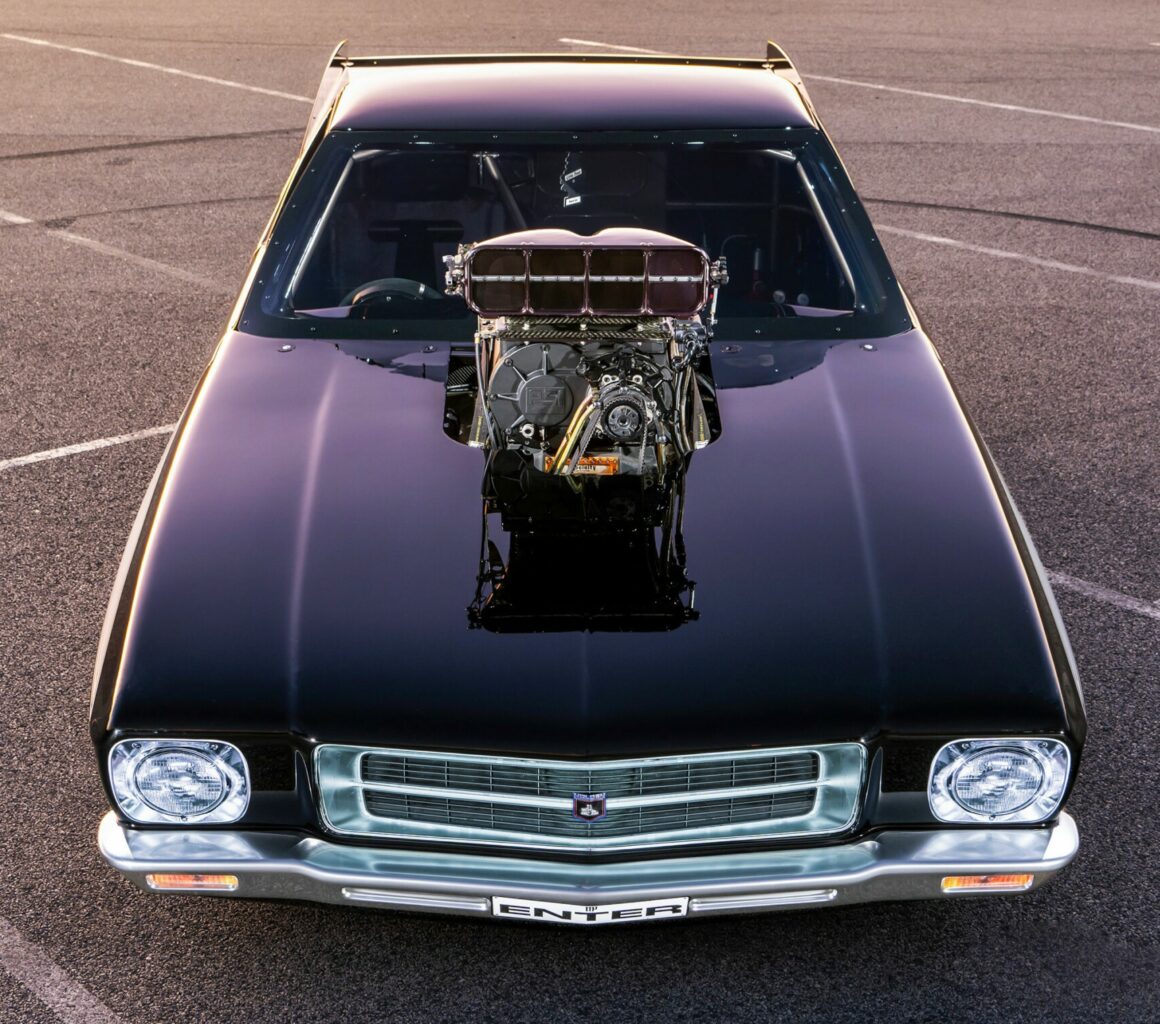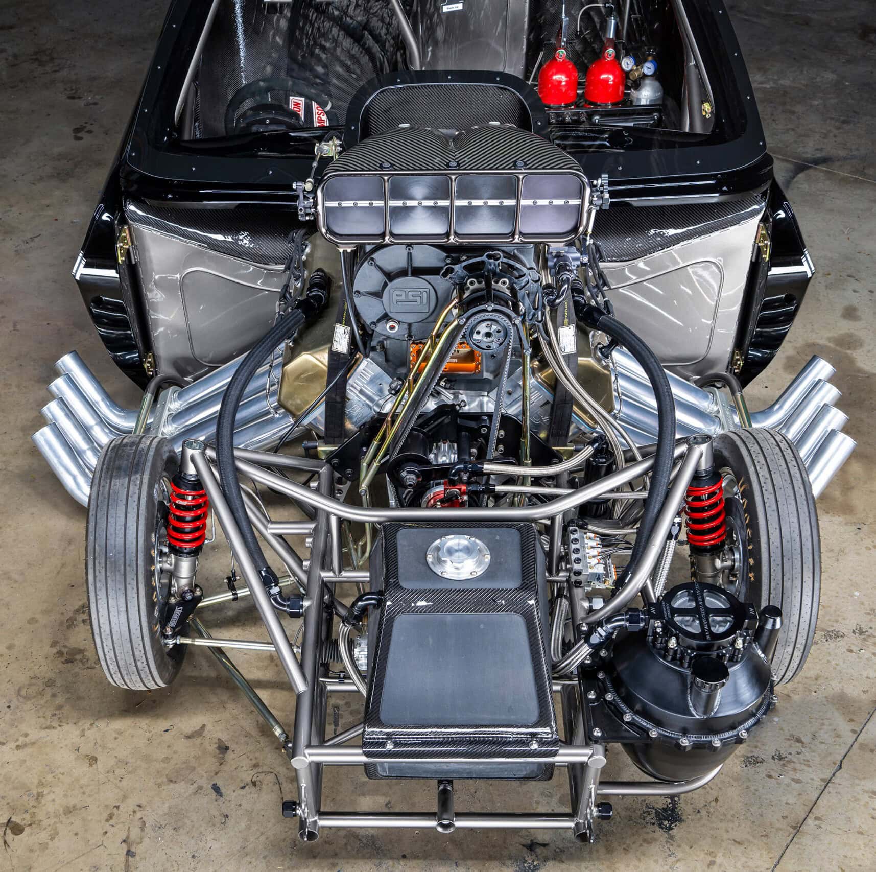Cela a signifié de devoir remodeler les lignes de carrosserie. Bien que celle-ci puisse facilement être soulevée par 4 personnes, elle pesait tout de même environ 120 kg, ce qui était relativement lourd pour une carrosserie de dragster de course. Par exemple, une carrosserie de Corvette ’53 en fibre de verre est de seulement 54kg ! Boris admet qu’il est allé un peu lourd avec les renforts pour s’assurer qu’il ne s’effondre pas avec le V8 Brad Anderson Hemi surmonté de culasses BAE-6 et rempli d’un ensemble composé d’un vilebrequin Bryant, de bielles PRV de pistons Carrillo et de soupapes Manton (admission de 2,40po et échappement de 1,90po). Toutes chose très chères…