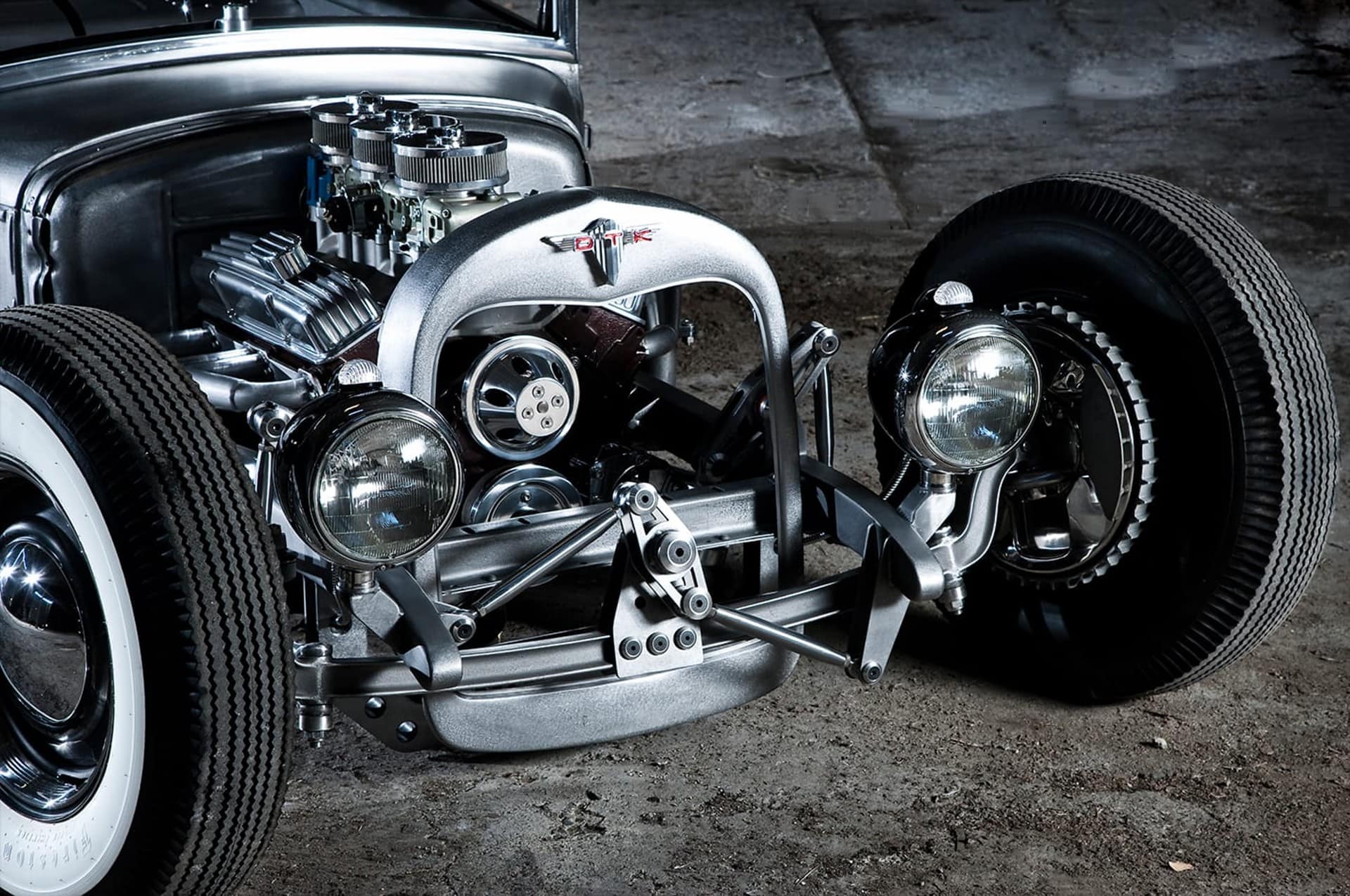 -“Oui, la carrosserie automobile n’est qu’une des astuces dans mes manches, j’ai fait mes armes sur la scène des mini-camions. Fondamentalement, le châssis Essex fortement réentaillé a été mis en place façon new-âge, y compris des triangles de 1940 et une colonne de direction pliable “IDITIT”. J’ai ensuite fabriqué à partir de zéro le cadres de suspension en porte-à-faux. Ma Tudor peut poser ses seuils sur le sol, mais toujours naviguer à une hauteur correcte “…