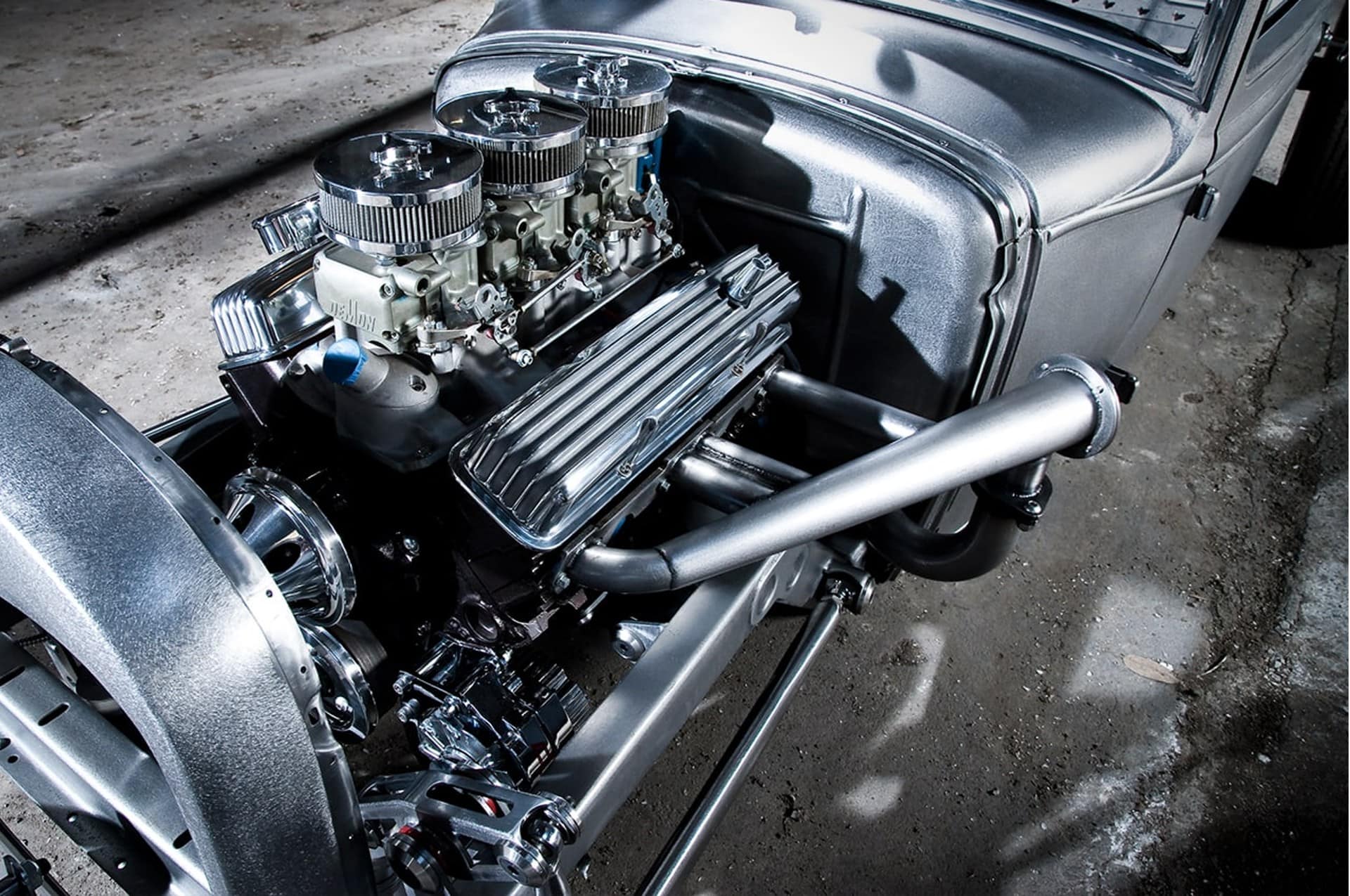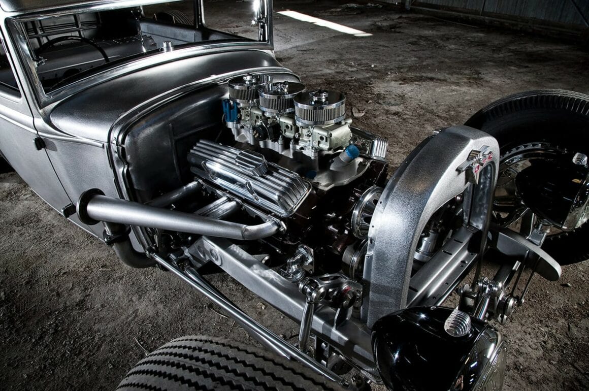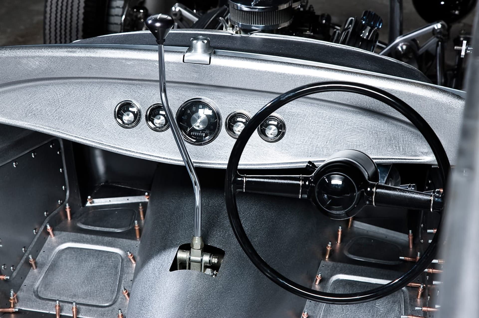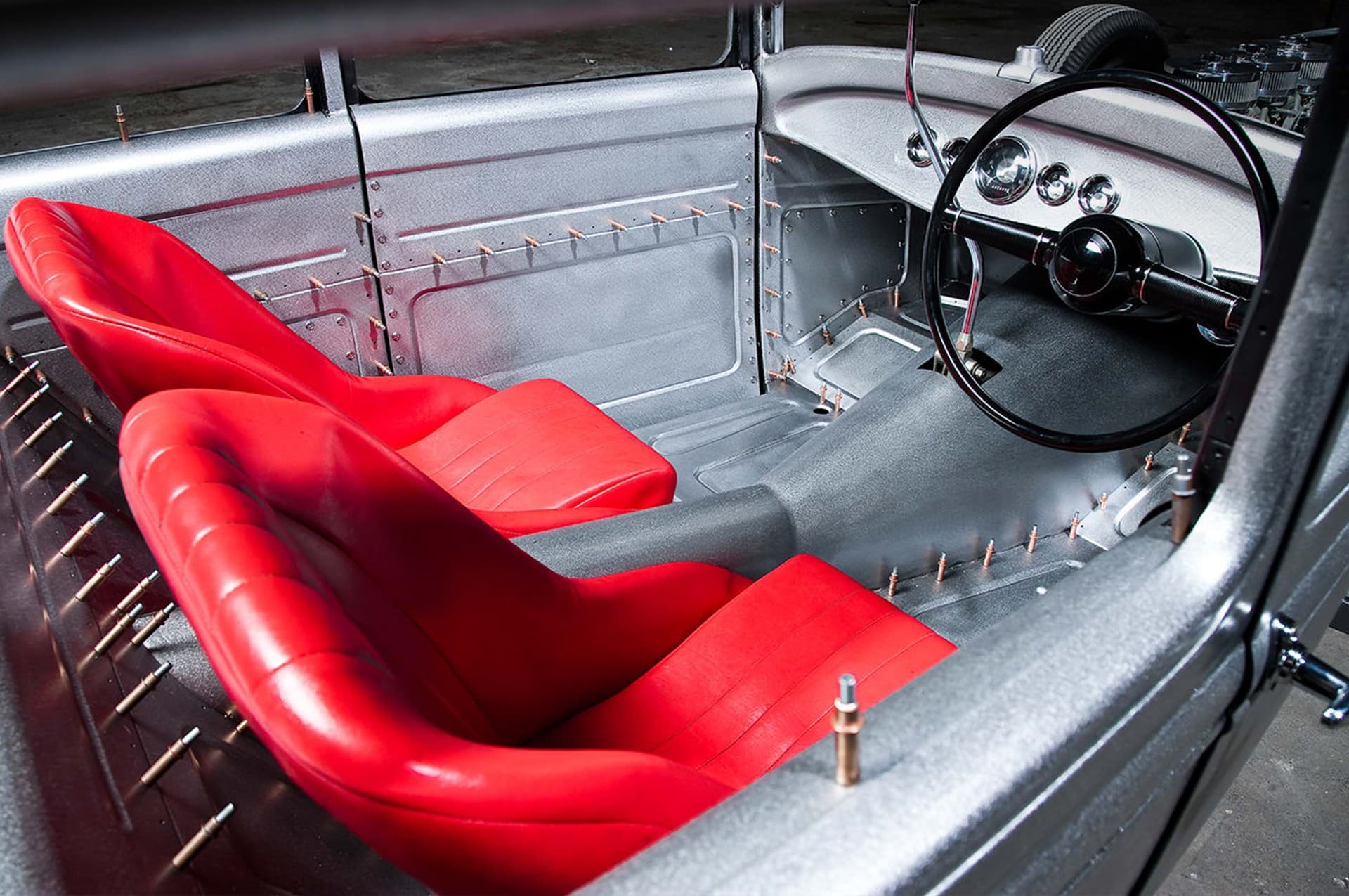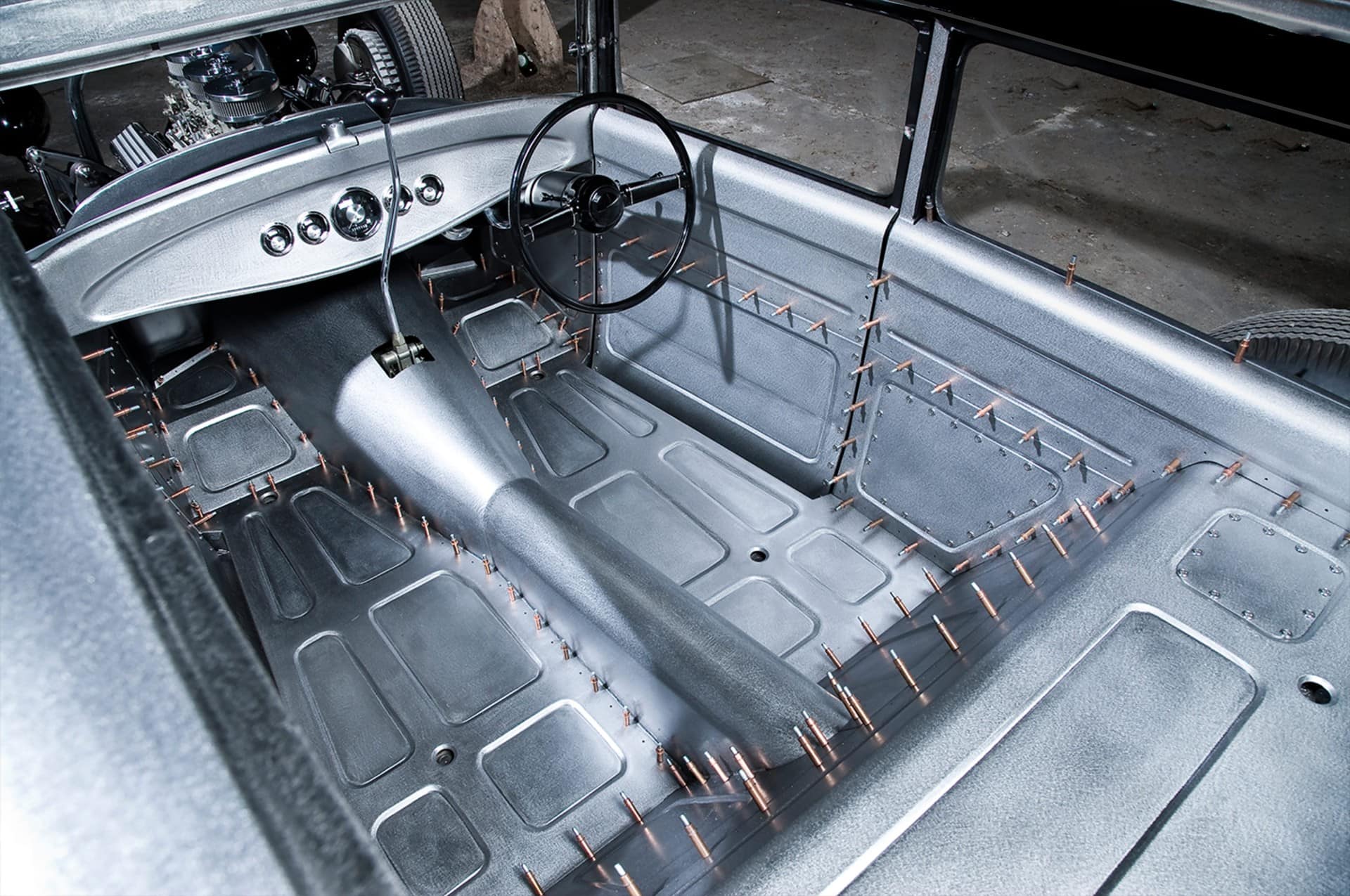 -“Bien sur ! Et en plus, les caches -culbuts sont à ailettes. La boite est une Turbo 350 avec un levier de vitesses Lokar et un arbre adapté ! L’intérieur est toujours considéré comme un travail en cours ! J’aime les choses qui sont basses, et, au début, c’était juste censé être un Hot-Rod quasi gisant à plat sur le sol. Maintenant, il est génial. Il n’est pas encore terminé comme vous le voyez, quoique j’aime les rivets non coupés !