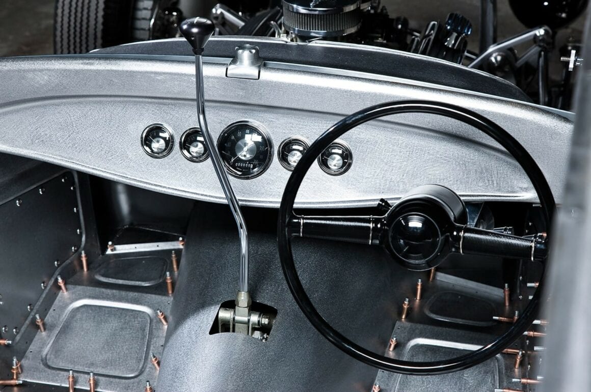 -“Je constate que derrière les tambours à ailettes d’époque se cachent des disques ventilés Wilwood et des étriers à deux pistons, bien que les pneus à l’ancienne, des Firestone en 15×6.70 et 15×8.20, doivent limiter les prouesses de maniabilité !”…